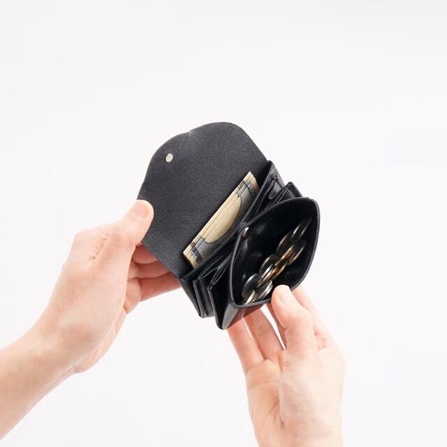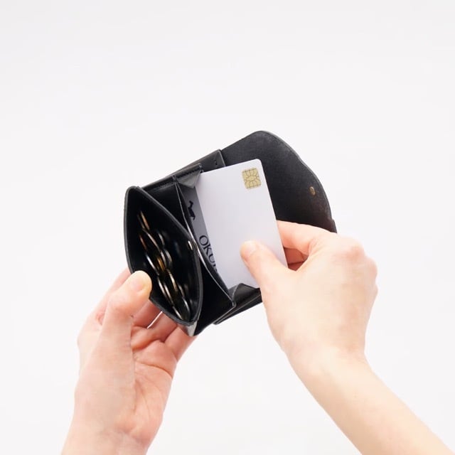 手前にはコイン、中央にカード(スナップボタン式)、奥には紙幣を2つ折りにして収納します。