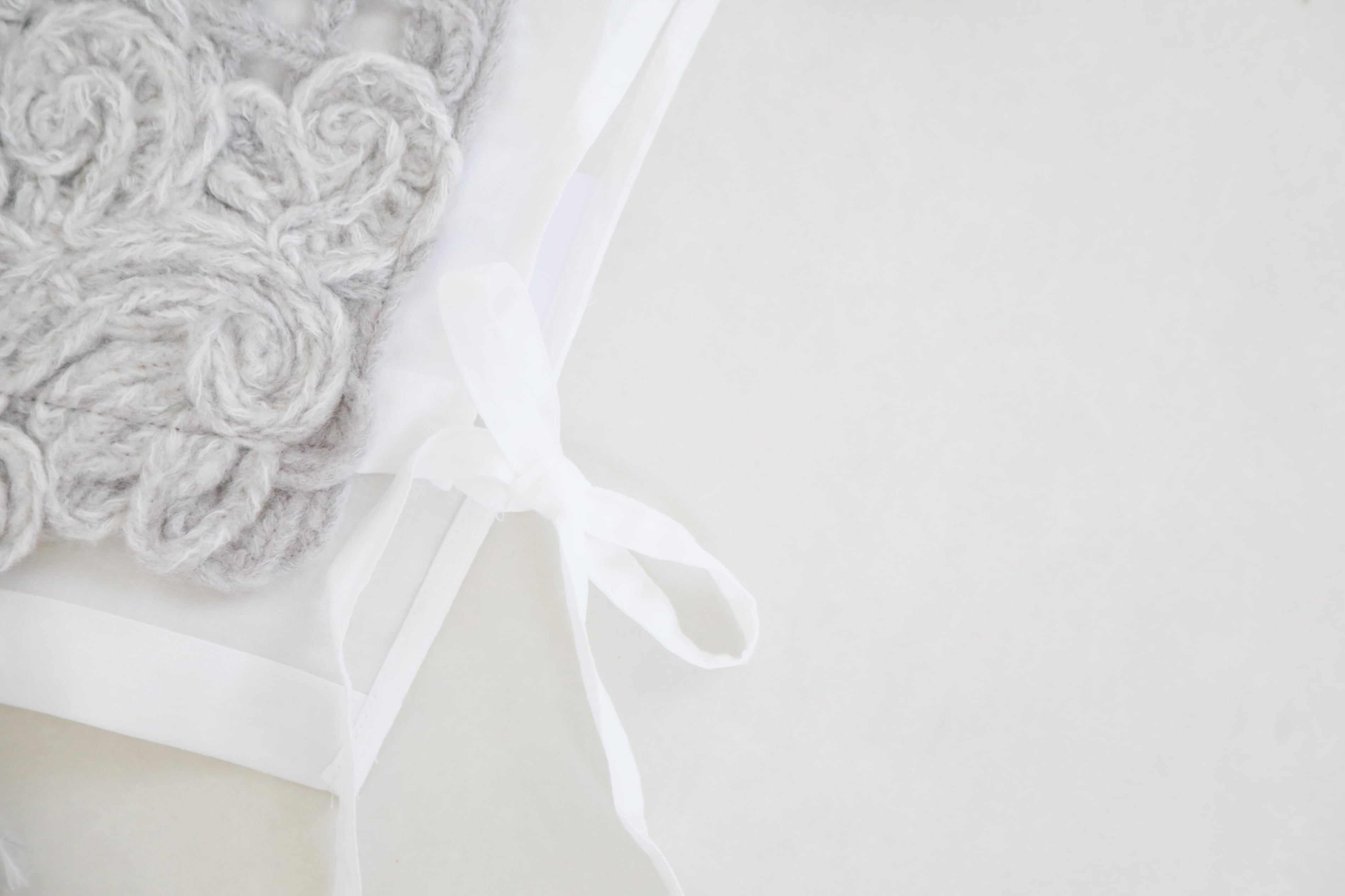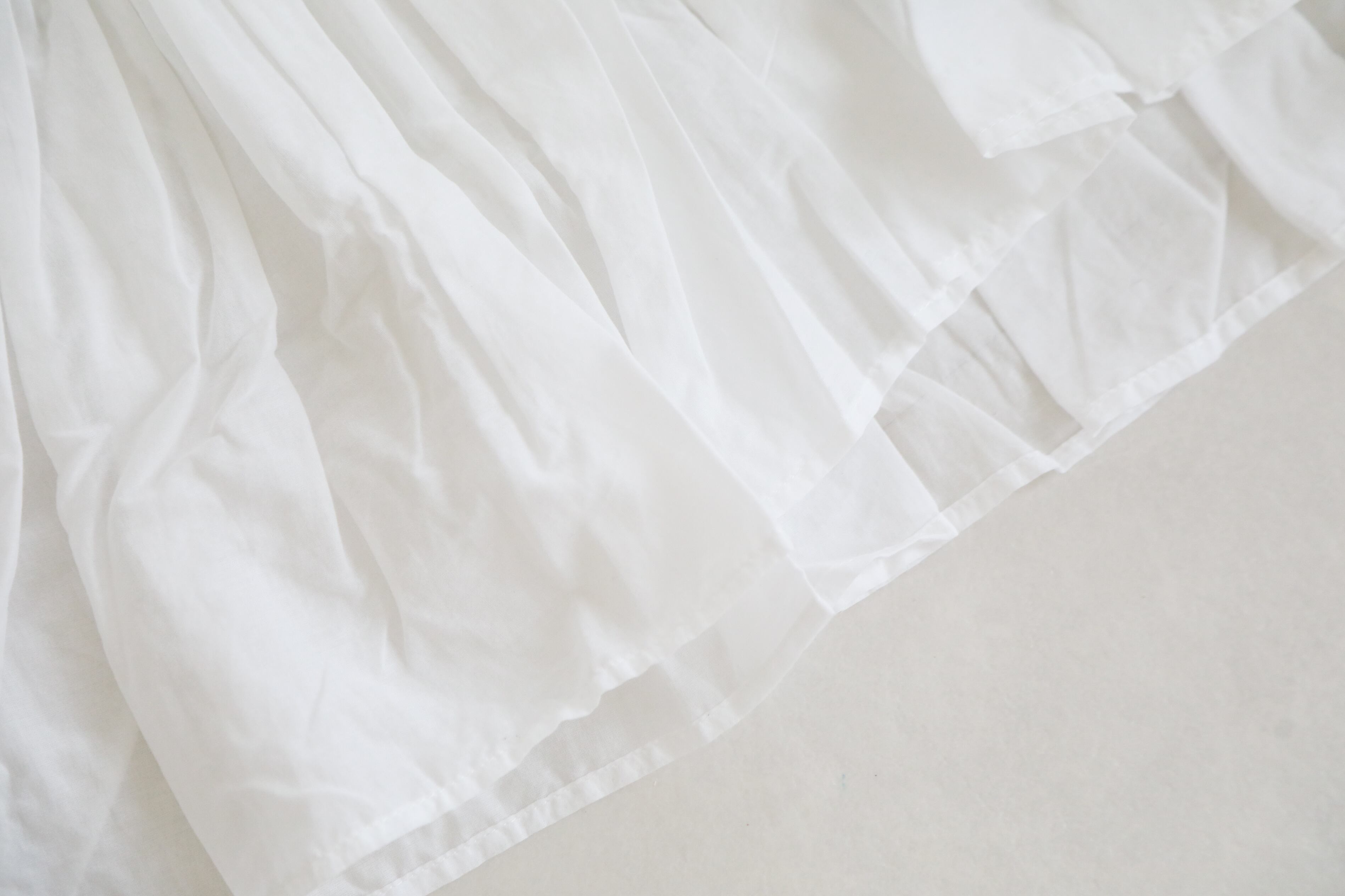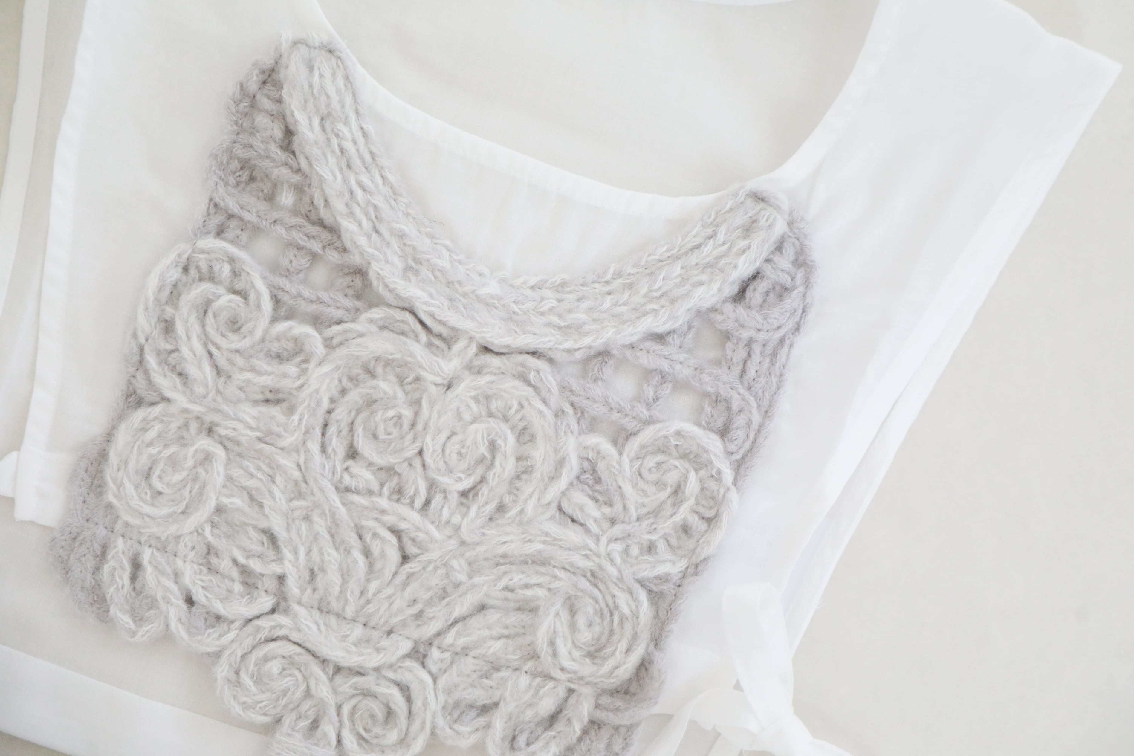 ユキウサギの王女の紋章をイメージした図案をモヘアのようなニット糸を三つ編みに編んでコード刺繍にしたパーツをフロントに付けたベストと、ウェストやお袖にギャザーたっぷりな極薄のコットンローンブラウスを重ねた今季のものがたりの王女のイメージにぴったりな1着。