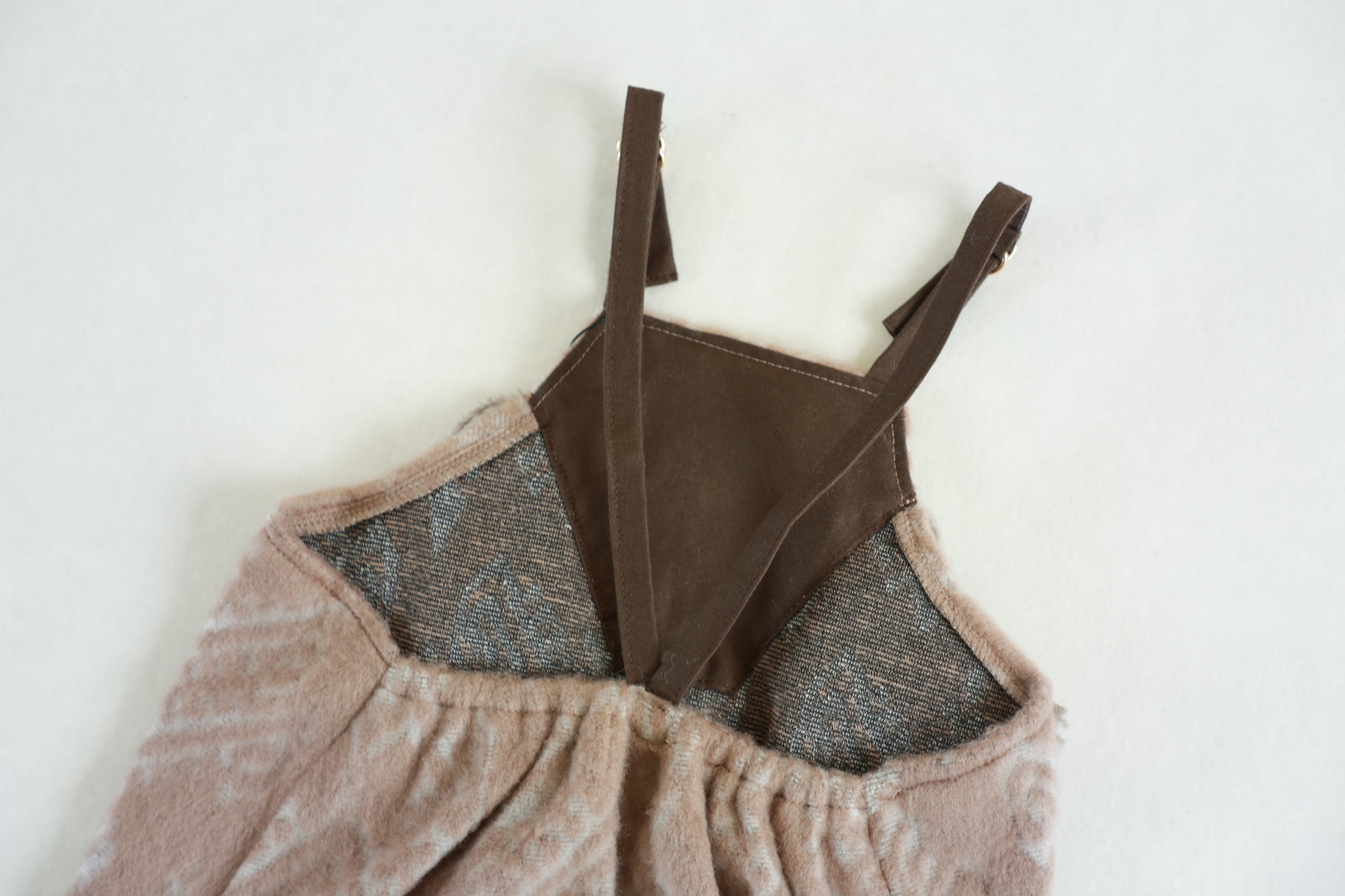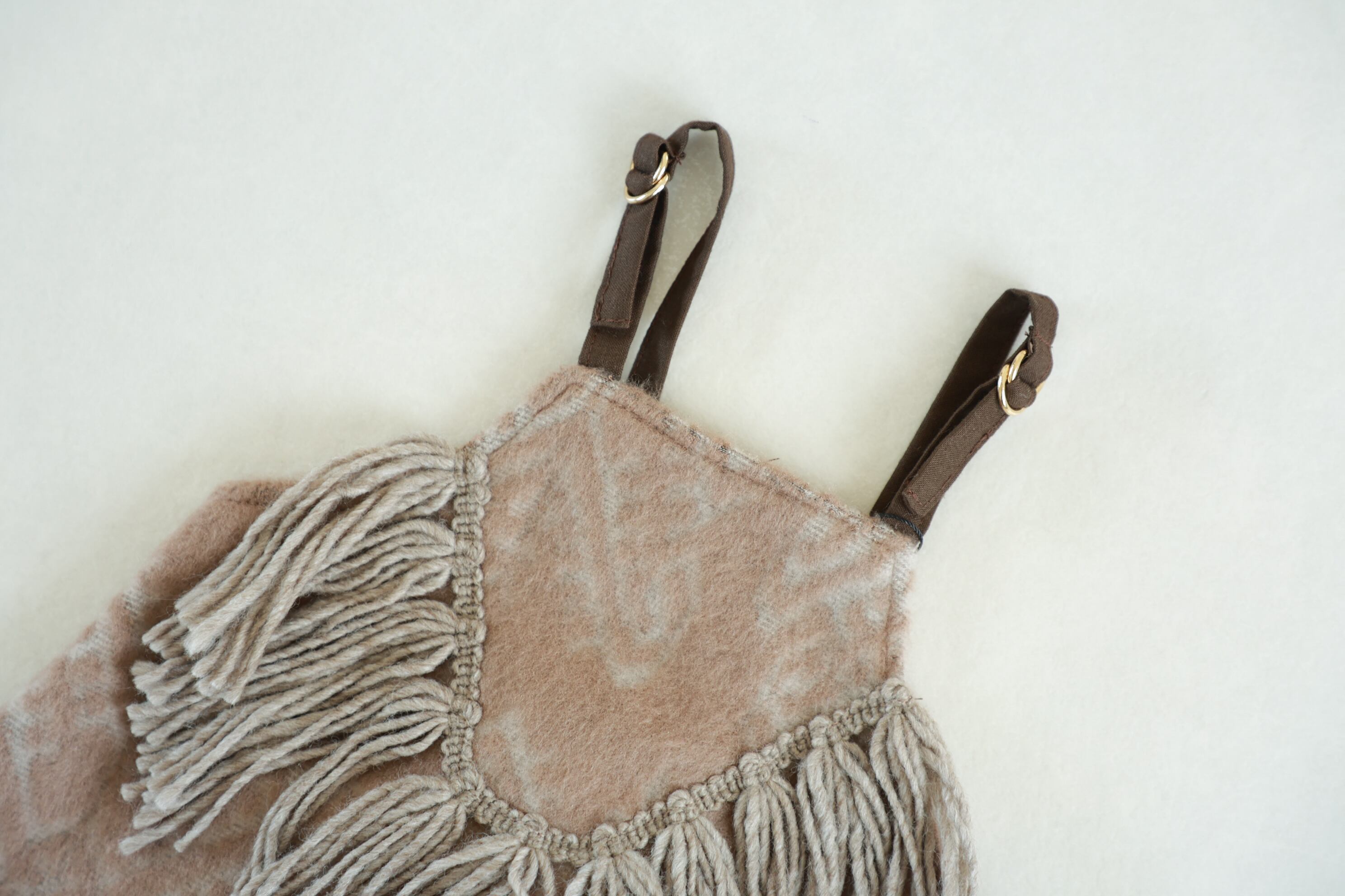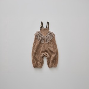 ベビーロンパースは胸元にウールフリンジをデザインし、華奢な肩紐は背中までまわり、後ろウェストはゴムギャザーでゆったりしたヒップまわりがベビーらしい1着。