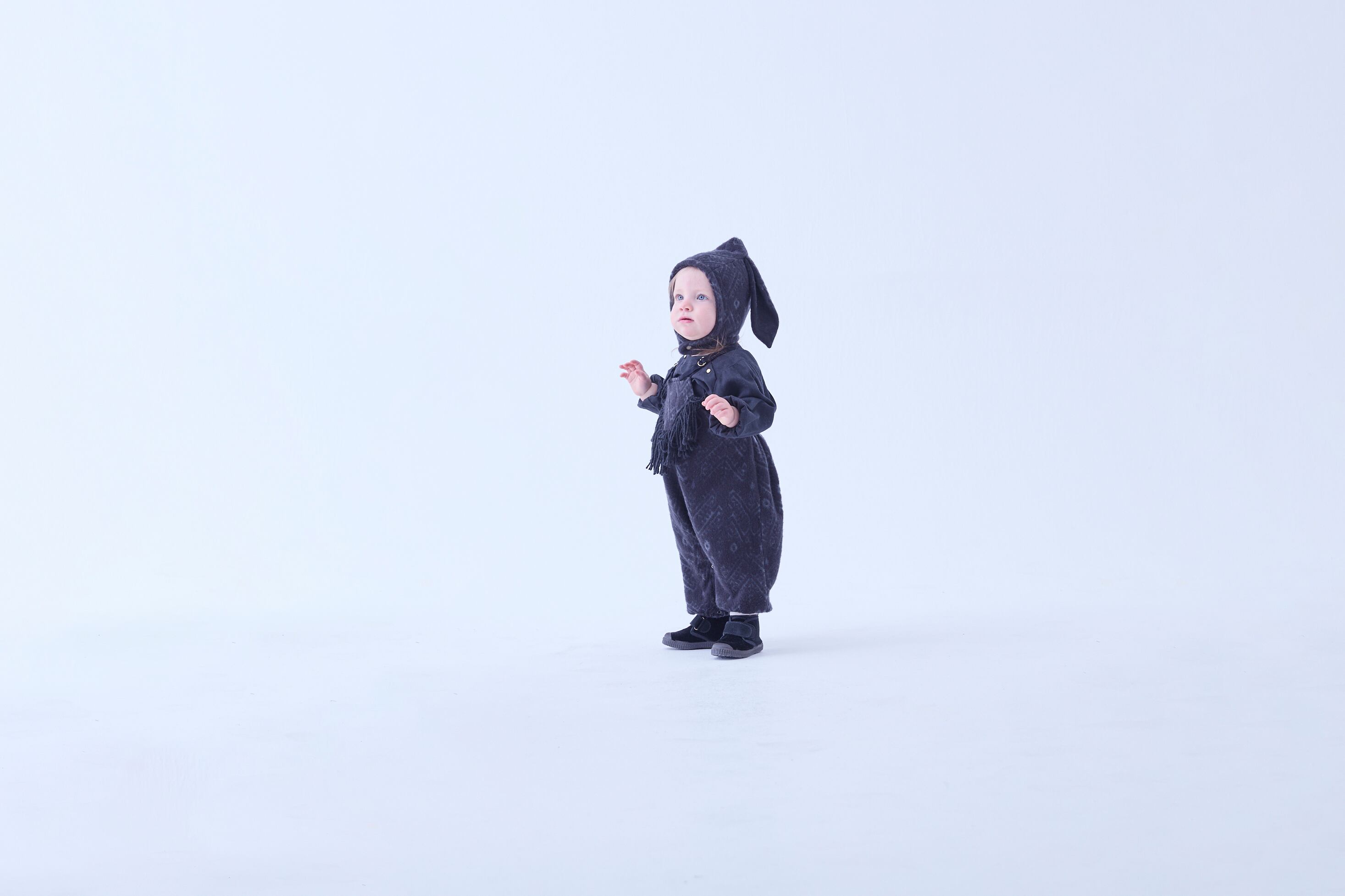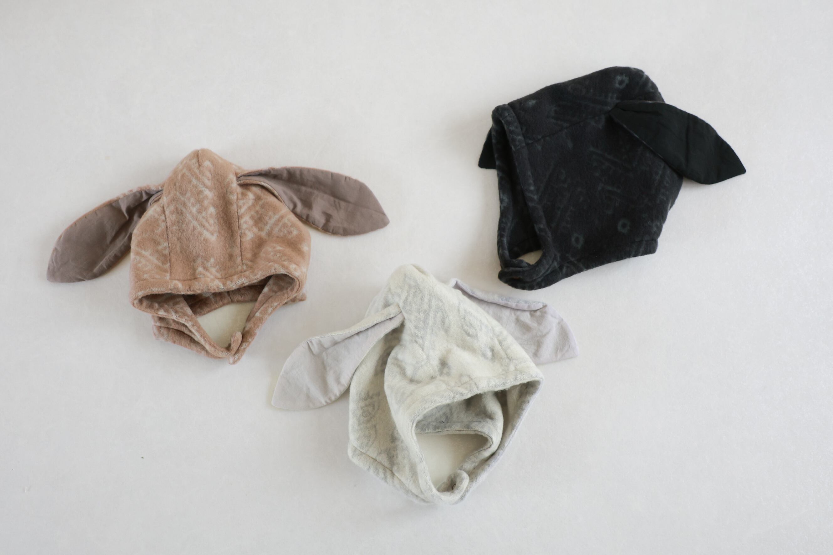 ウサギ耳のボンネットは表裏ともにニットジャガードでとっても暖かくベビーウサギになれる