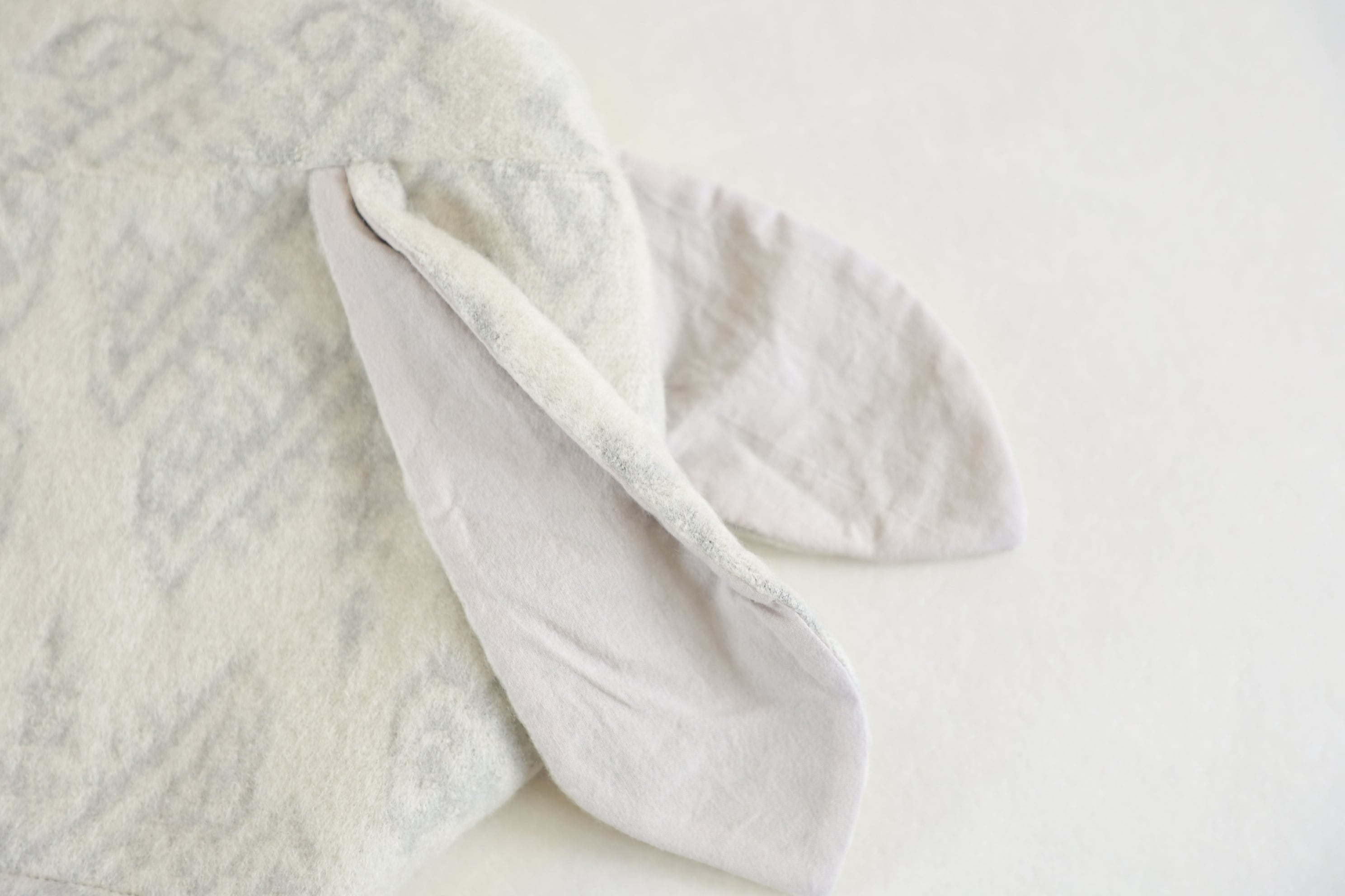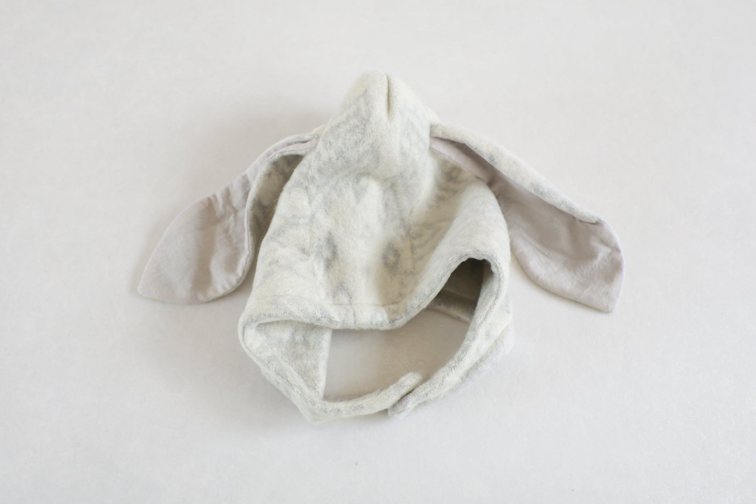 ウサギ耳のボンネットは表裏ともにニットジャガードでとっても暖かくベビーウサギになれる