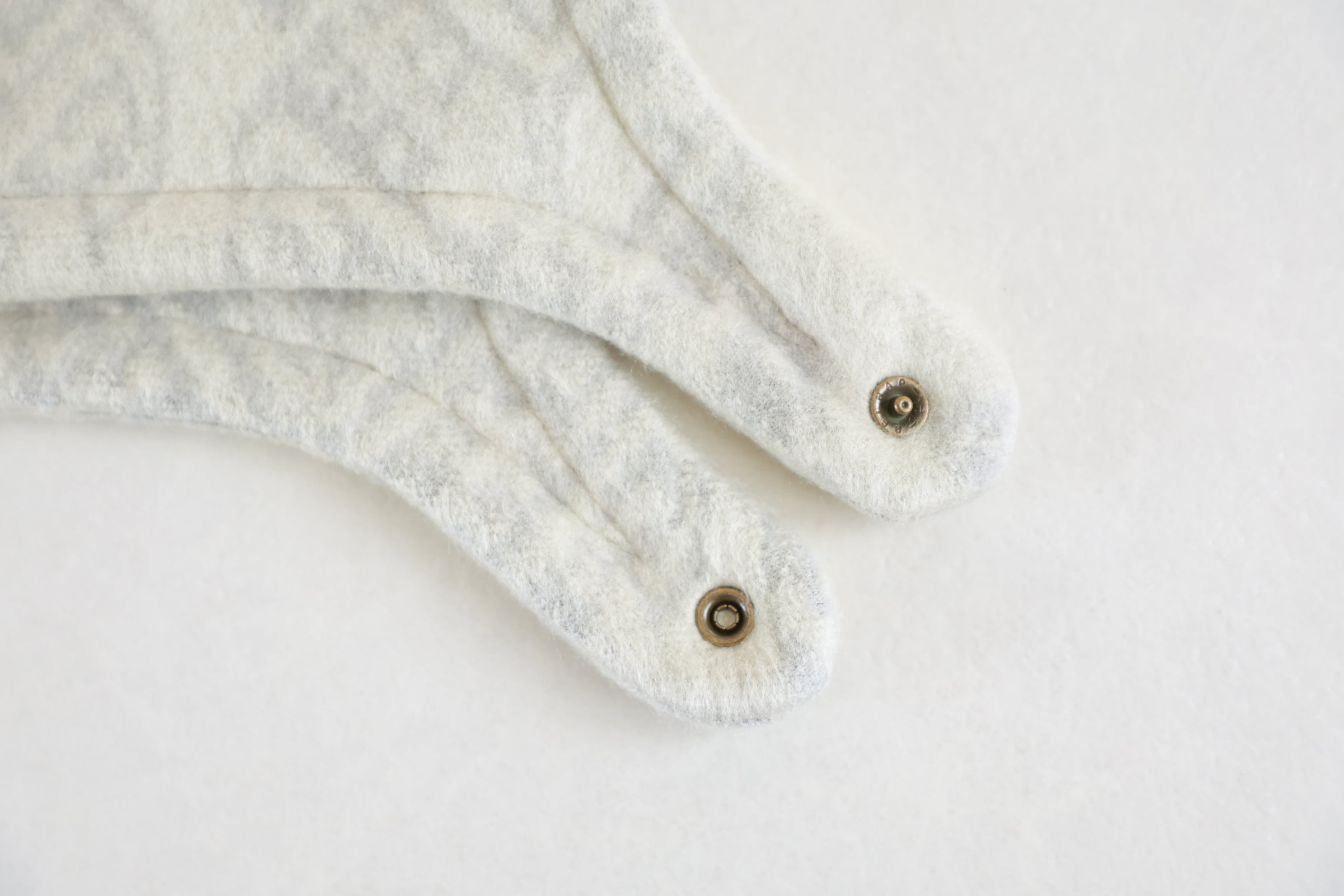 雪の結晶柄を図案に起こして凹凸のあるパイルジャガードに編み上げた後、毛羽立ちを起こすナッピング加工でもこもこふわふわに起毛仕上げした優しい雰囲気のオリジナルテキスタイル。