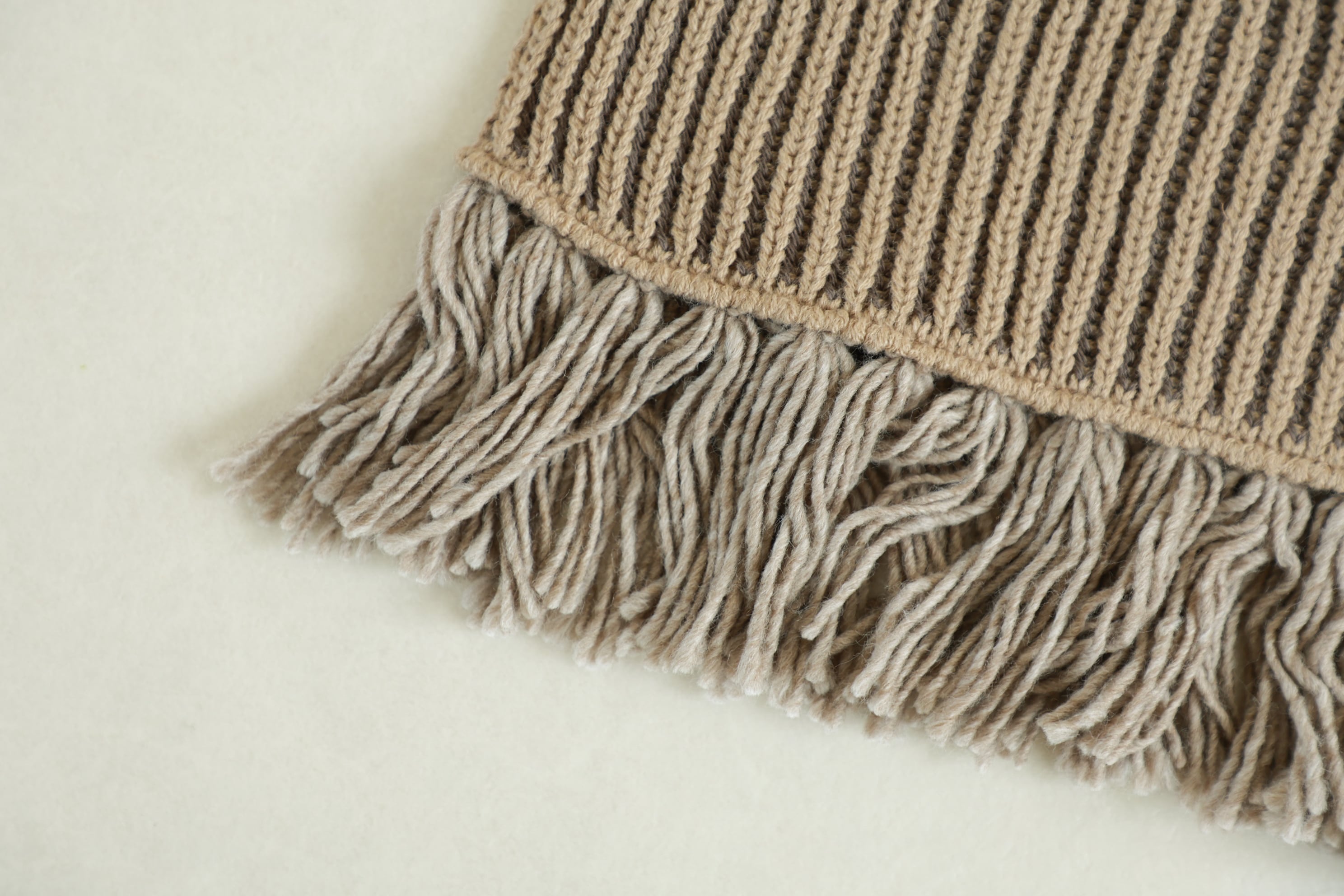 アクリルウール糸とコットン糸、2種の糸で両畔に編み上げることにより、2色の糸色がストライプに見えるタートルネックケープ。