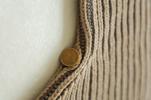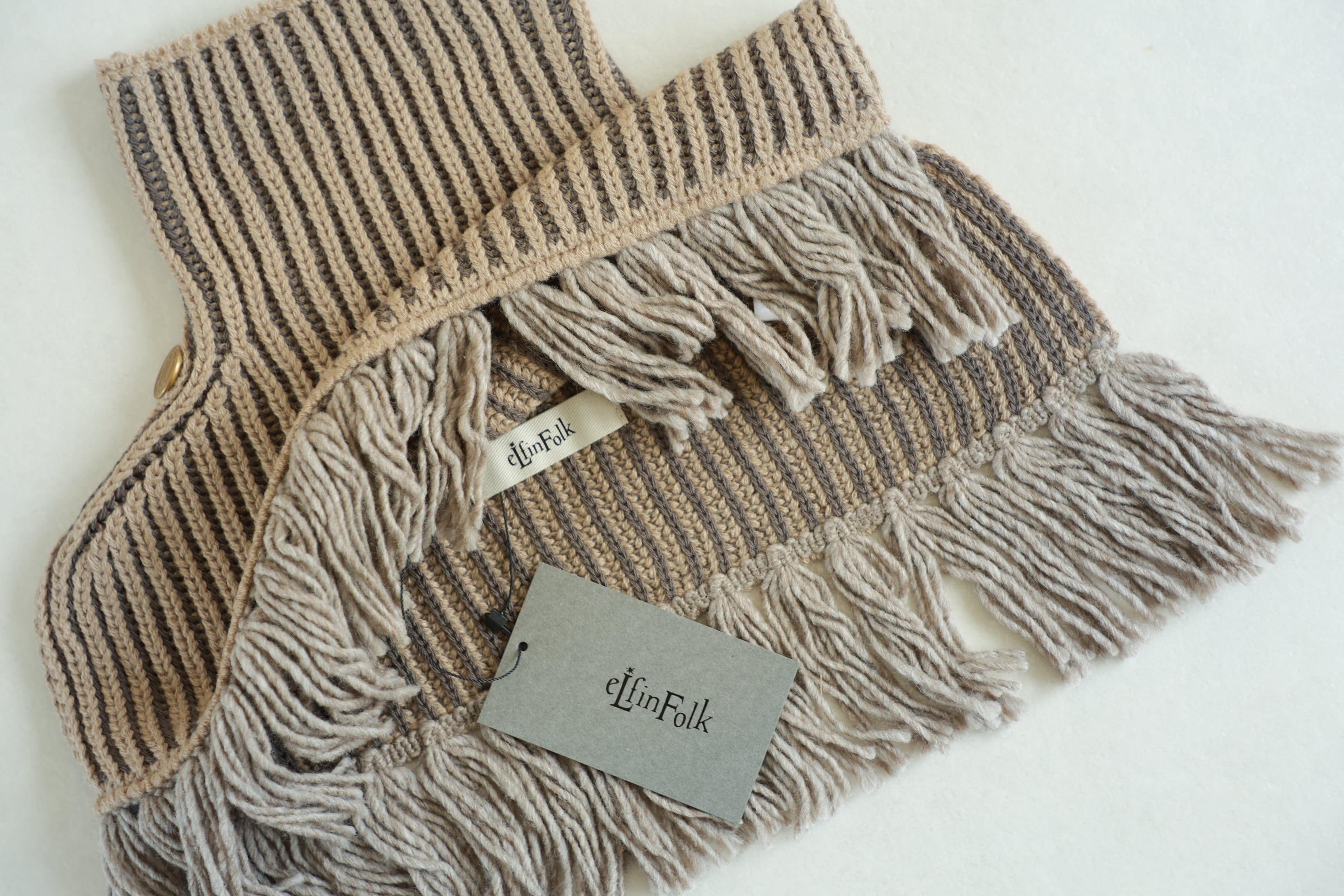 前後の裾にはウールのフリンジが同系色の配色で飾られ、肩章のように編地デザインを入れeLfボタンがアクセントになっています。