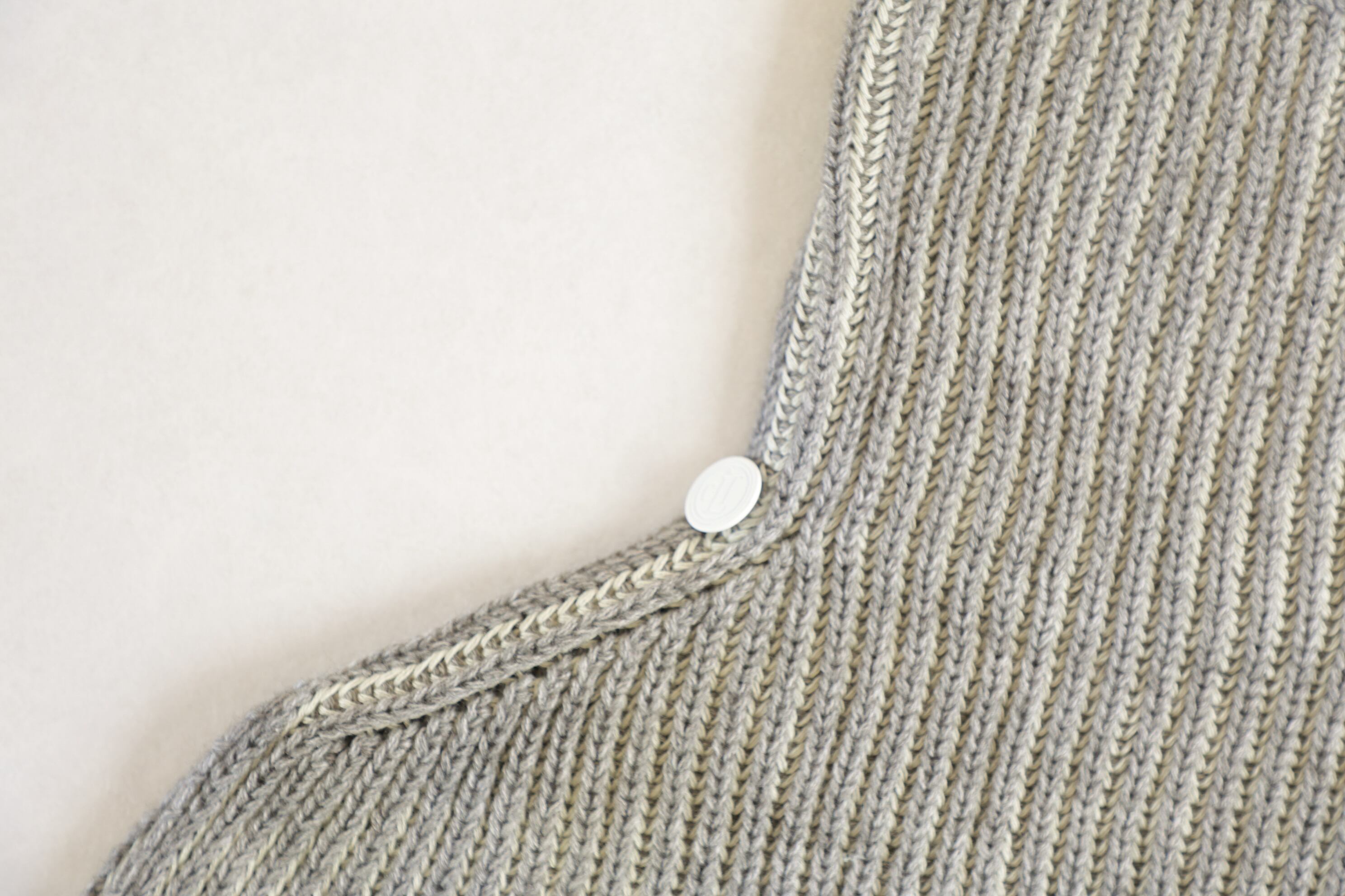 アクリルウール糸とコットン糸、2種の糸で両畔に編み上げることにより、2色の糸色がストライプに見えるタートルネックケープ。