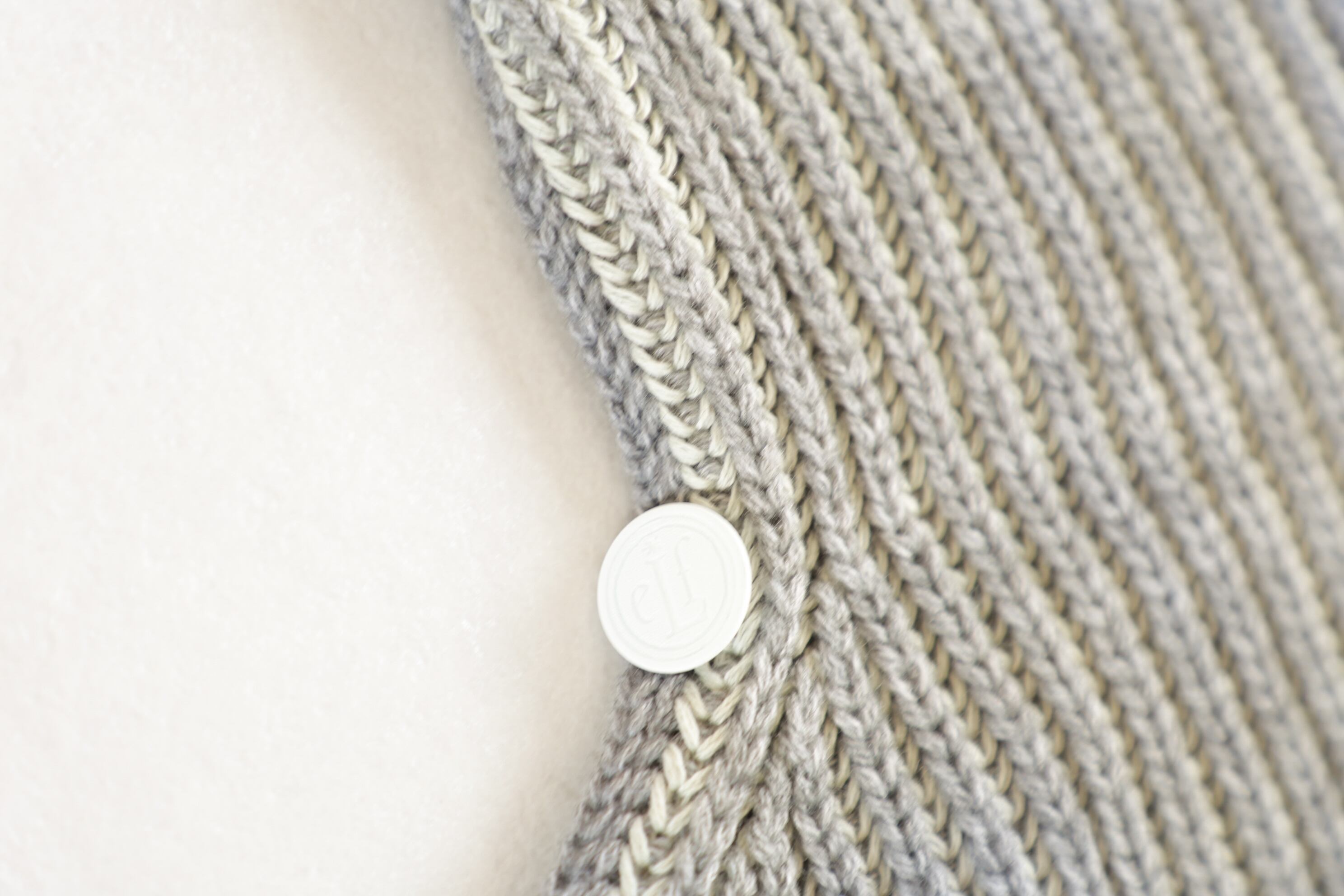 前後の裾にはウールのフリンジが同系色の配色で飾られ、肩章のように編地デザインを入れeLfボタンがアクセントになっています。