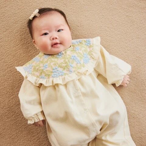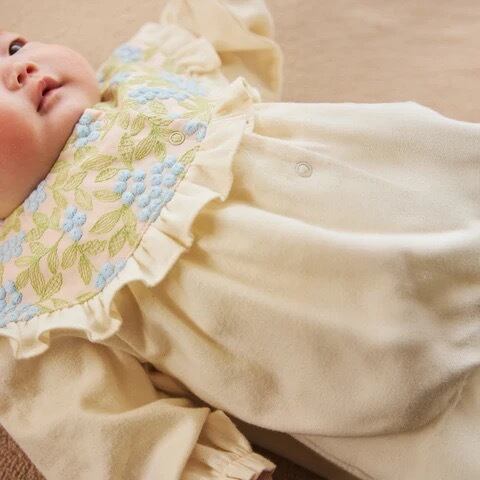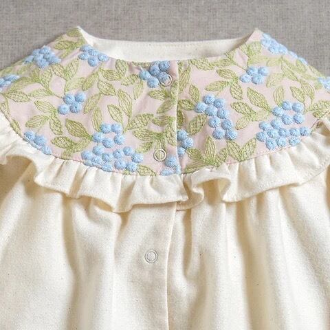 木の実の立体的な刺繍生地をあしらったベビードレス。