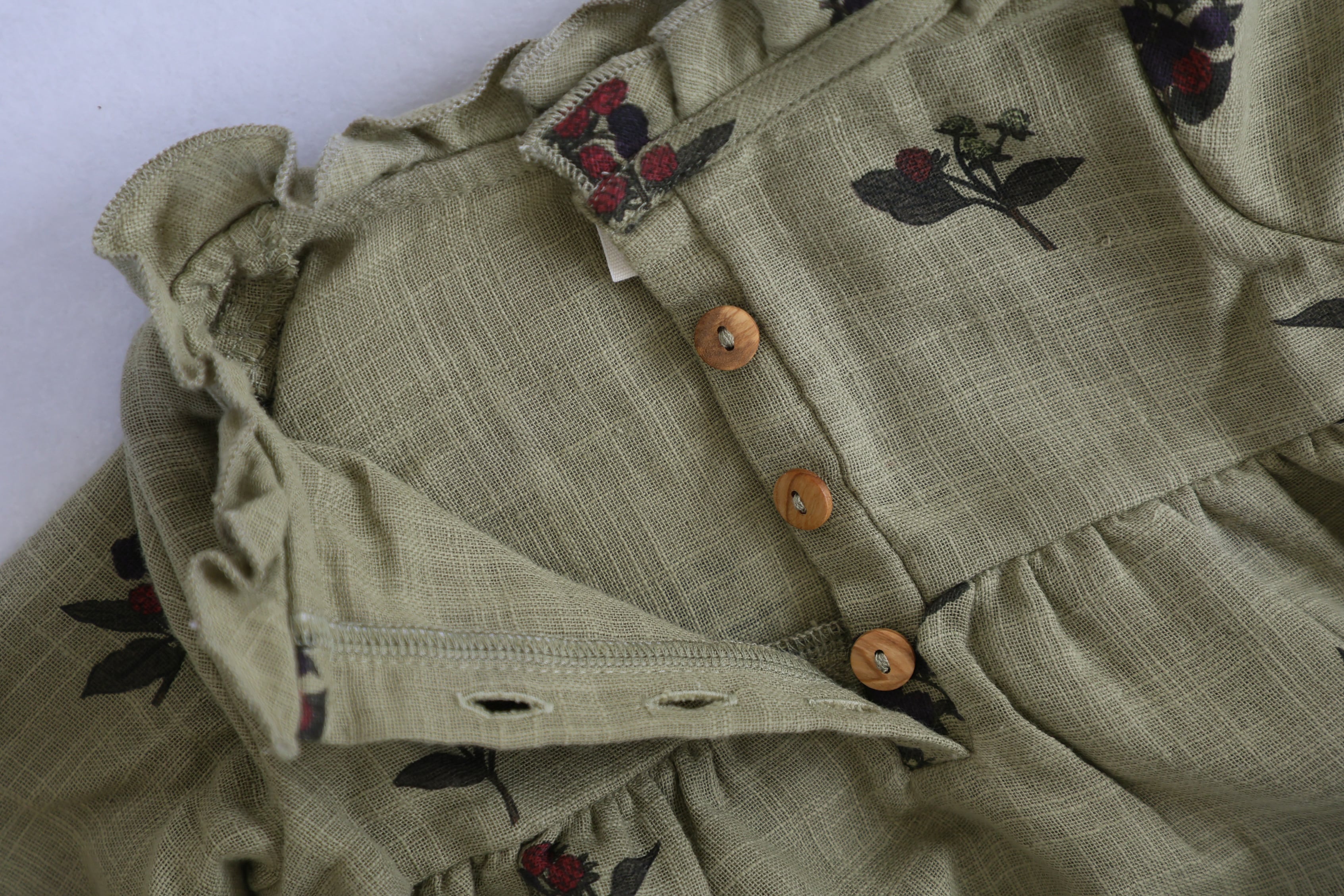 フロントには温かみのあるウッドボタンを施し、首元は可愛らしいフリルデザイン。