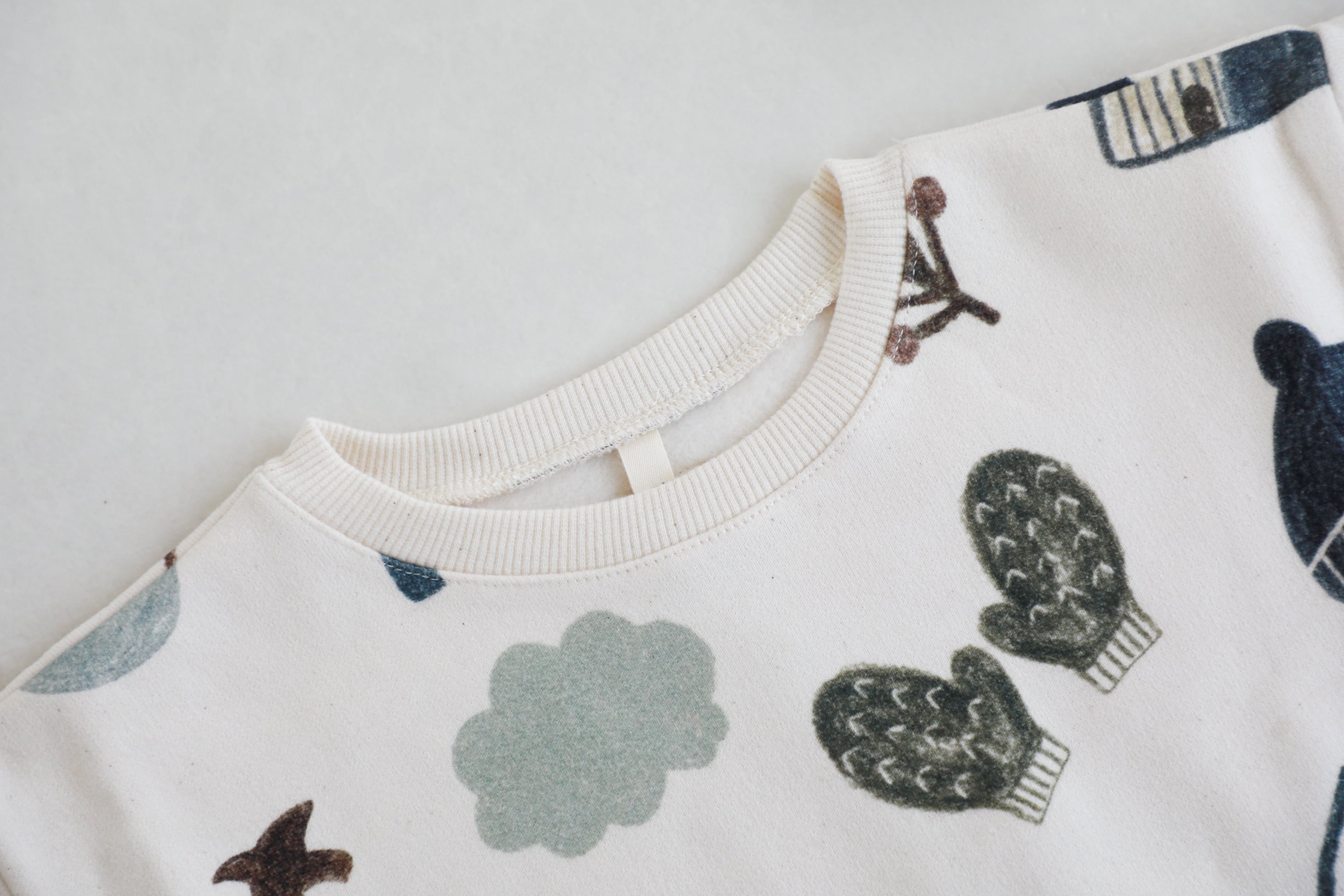 クレヨンで描かれた優しい色づかいのテキスタイルをスウェットに仕立てた一着。