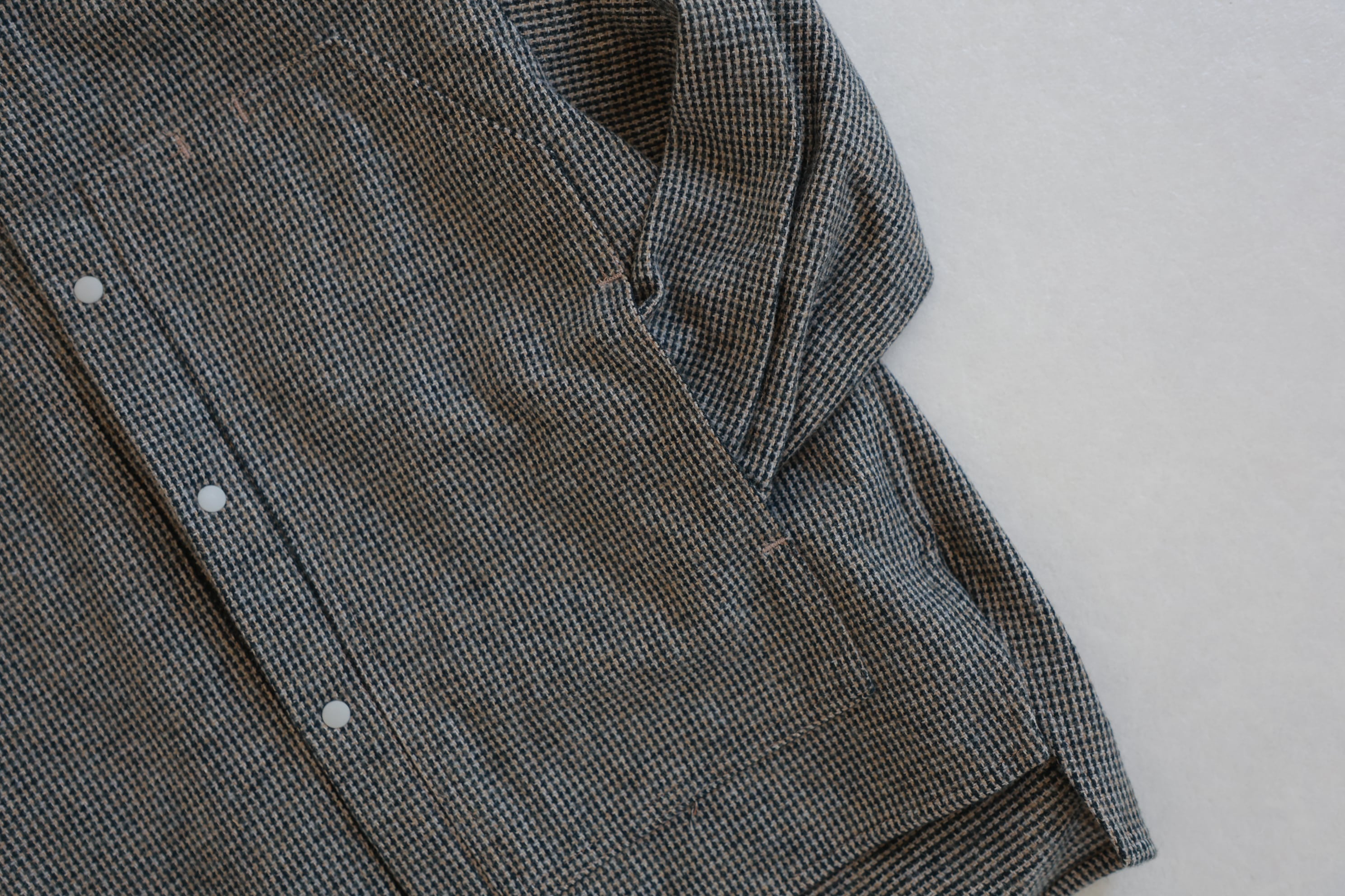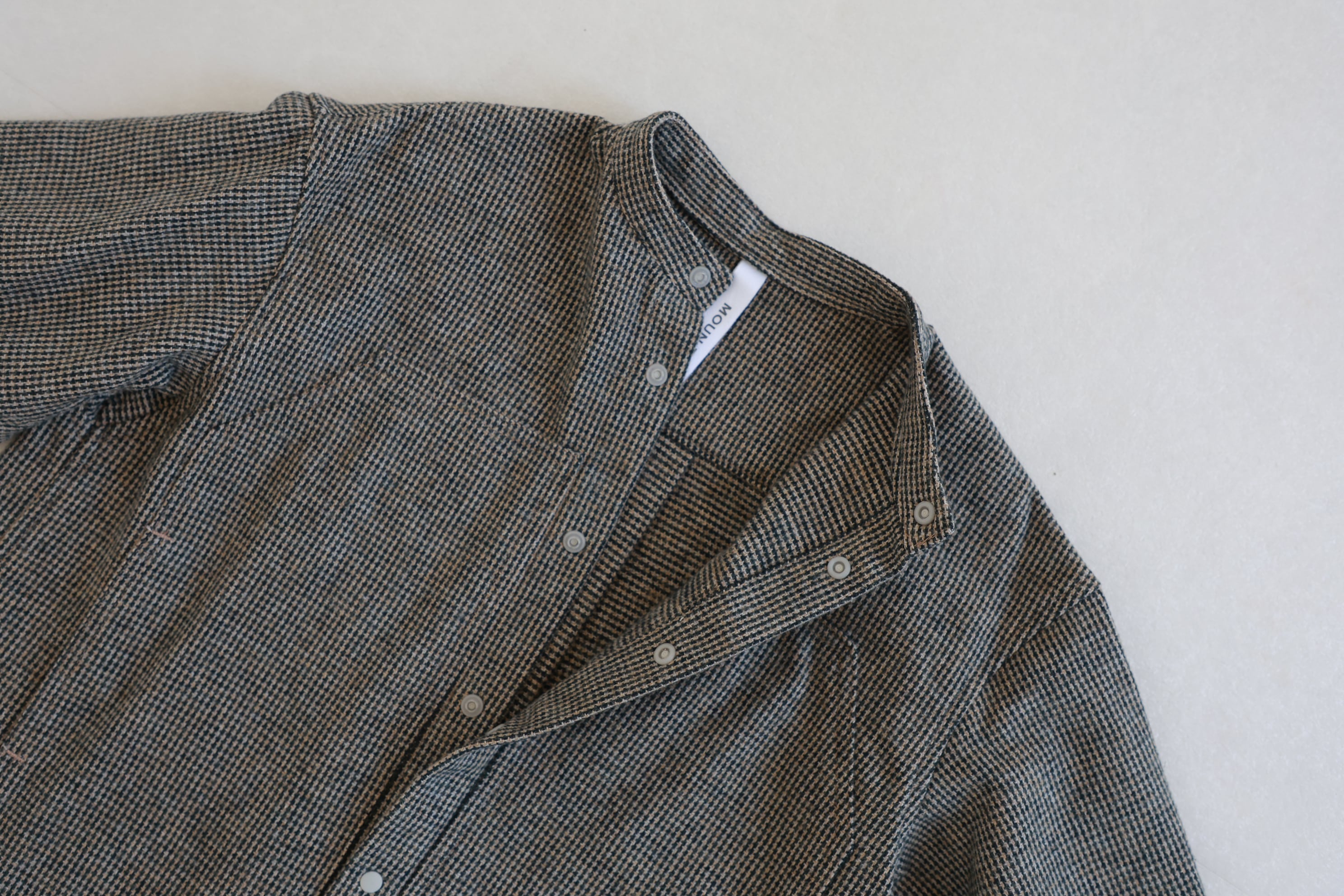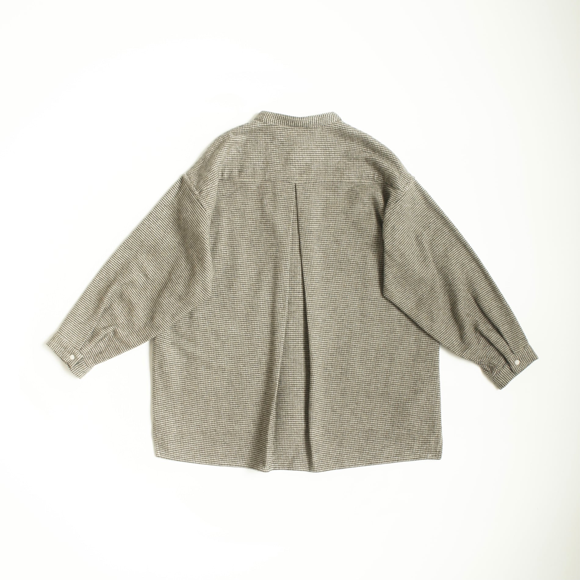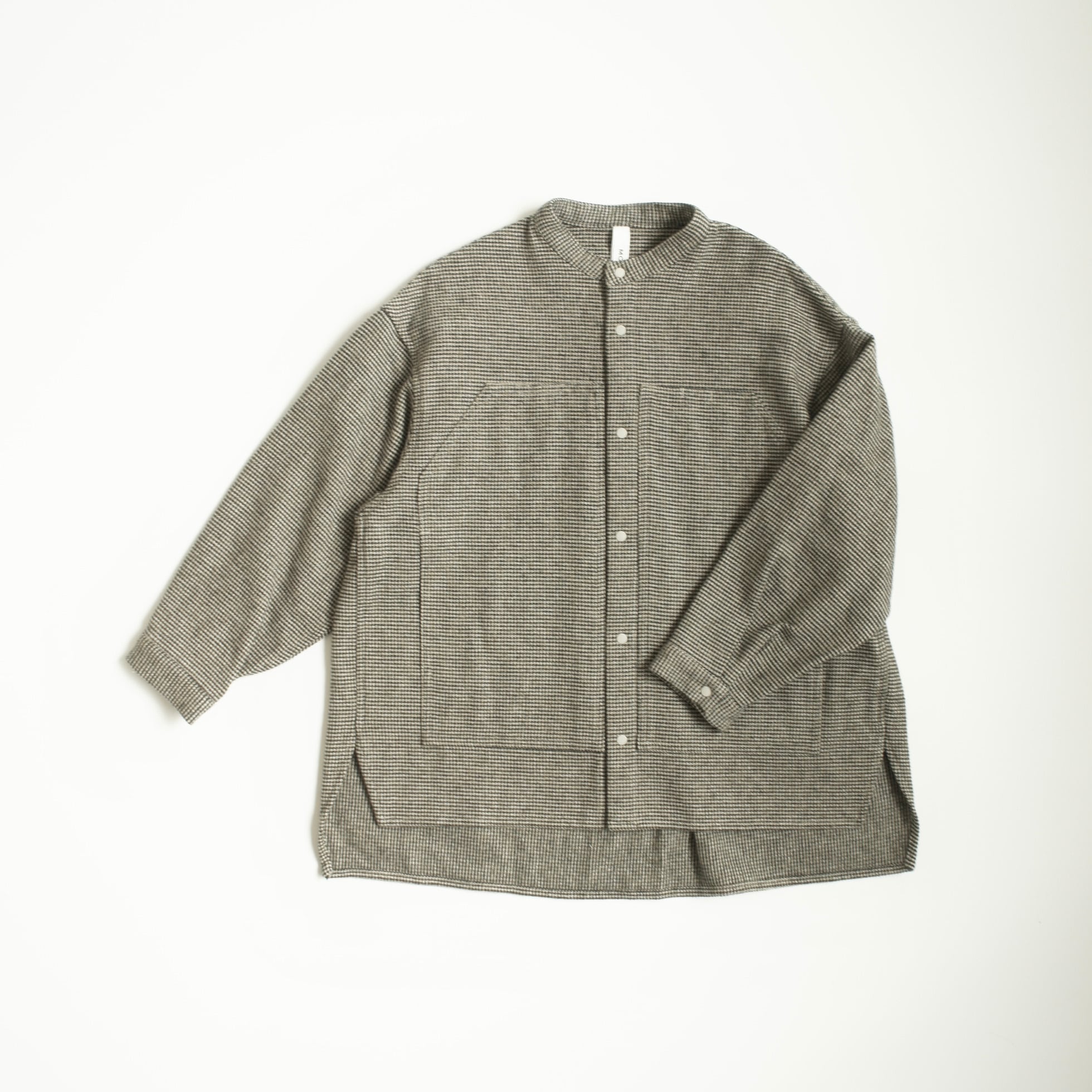 ウールの様な風合いのコットンツイードを使用したバンドカラーシャツ。