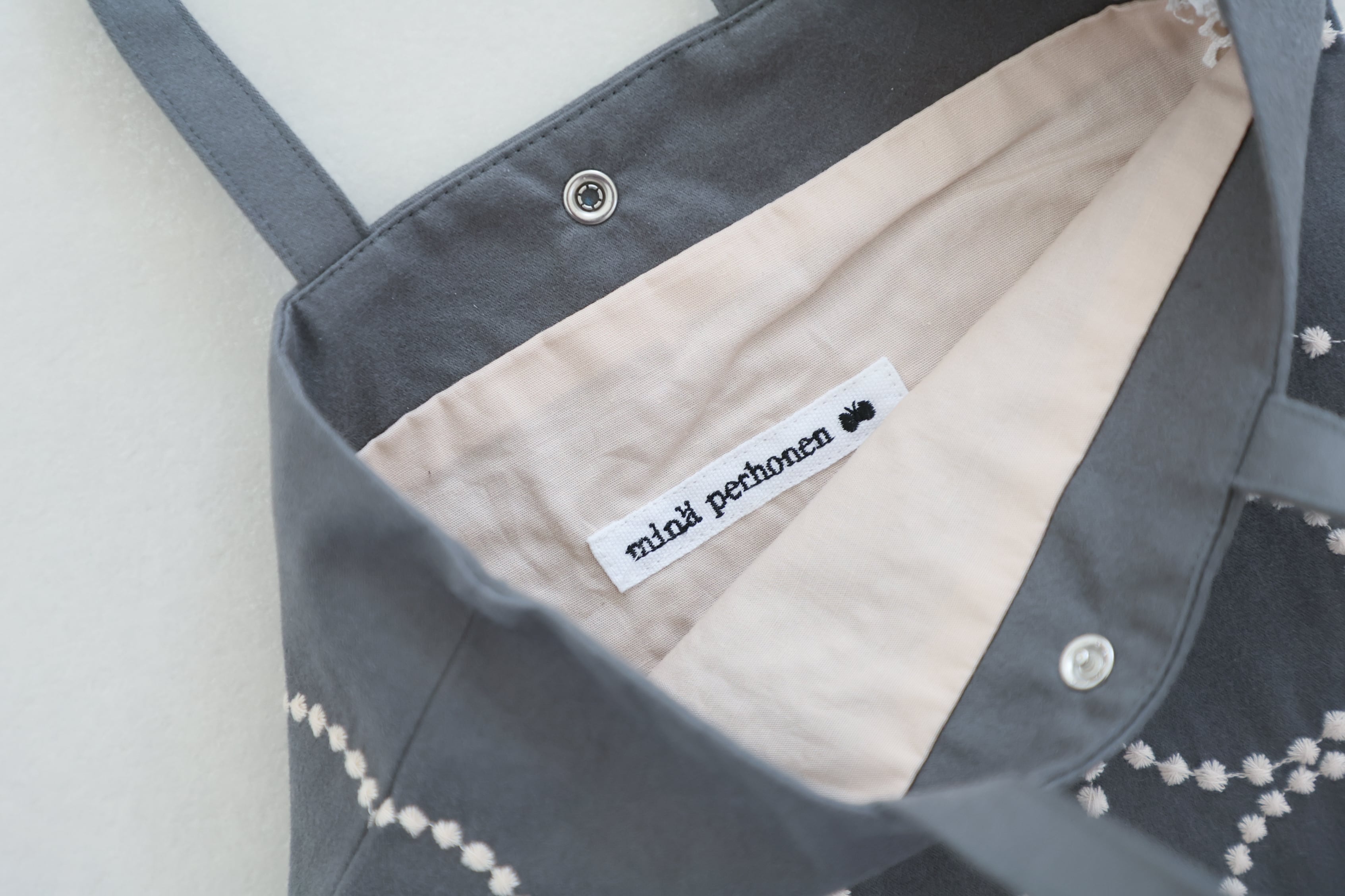 ブランド名は、デザイナーが北欧への旅を重ねる中で、そのライフスタイルやカルチャーに共鳴し、フィンランドの言葉から取った。「minä」は「私」、「perhonen」は「ちょうちょ」を意味する言葉。蝶の美しい羽のような図案を軽やかに作っていきたいという願いを込めている。ブランドロゴは、「私(四角)の中のさまざまな個性(粒の集合)」を表す。蝶の種類が数え切れないほどあるように、デザイナーの生み出すデザインもまた、増え続ける。