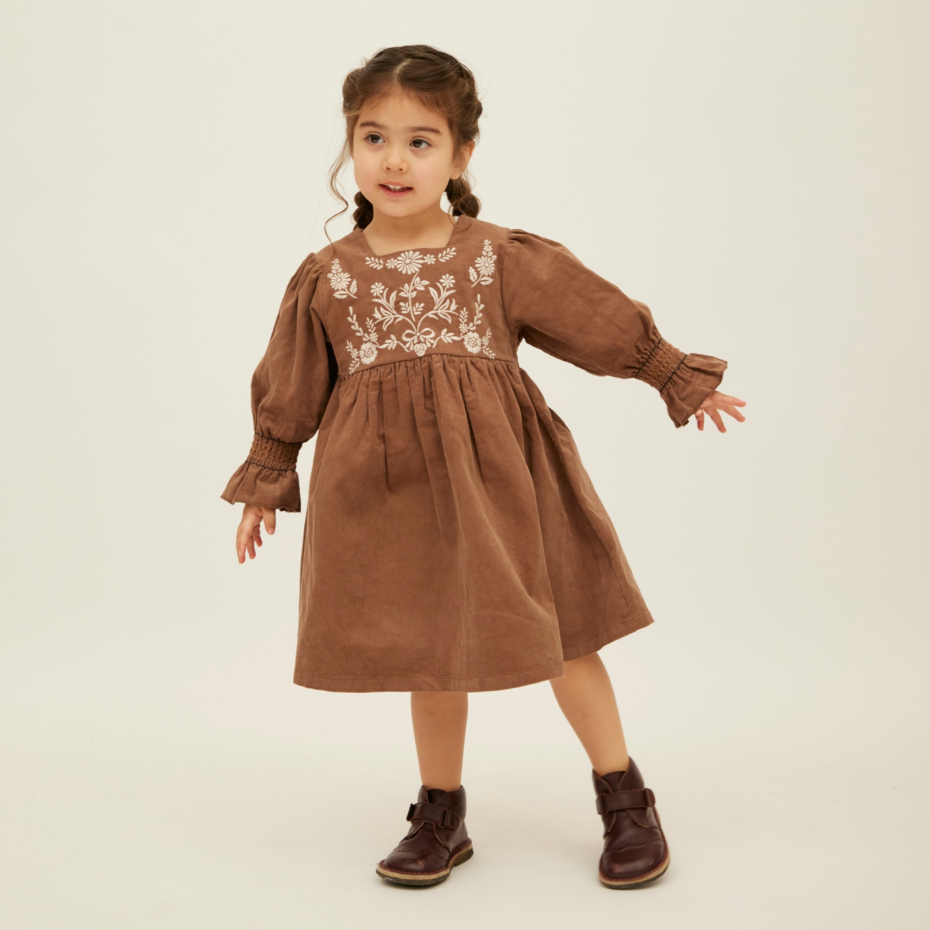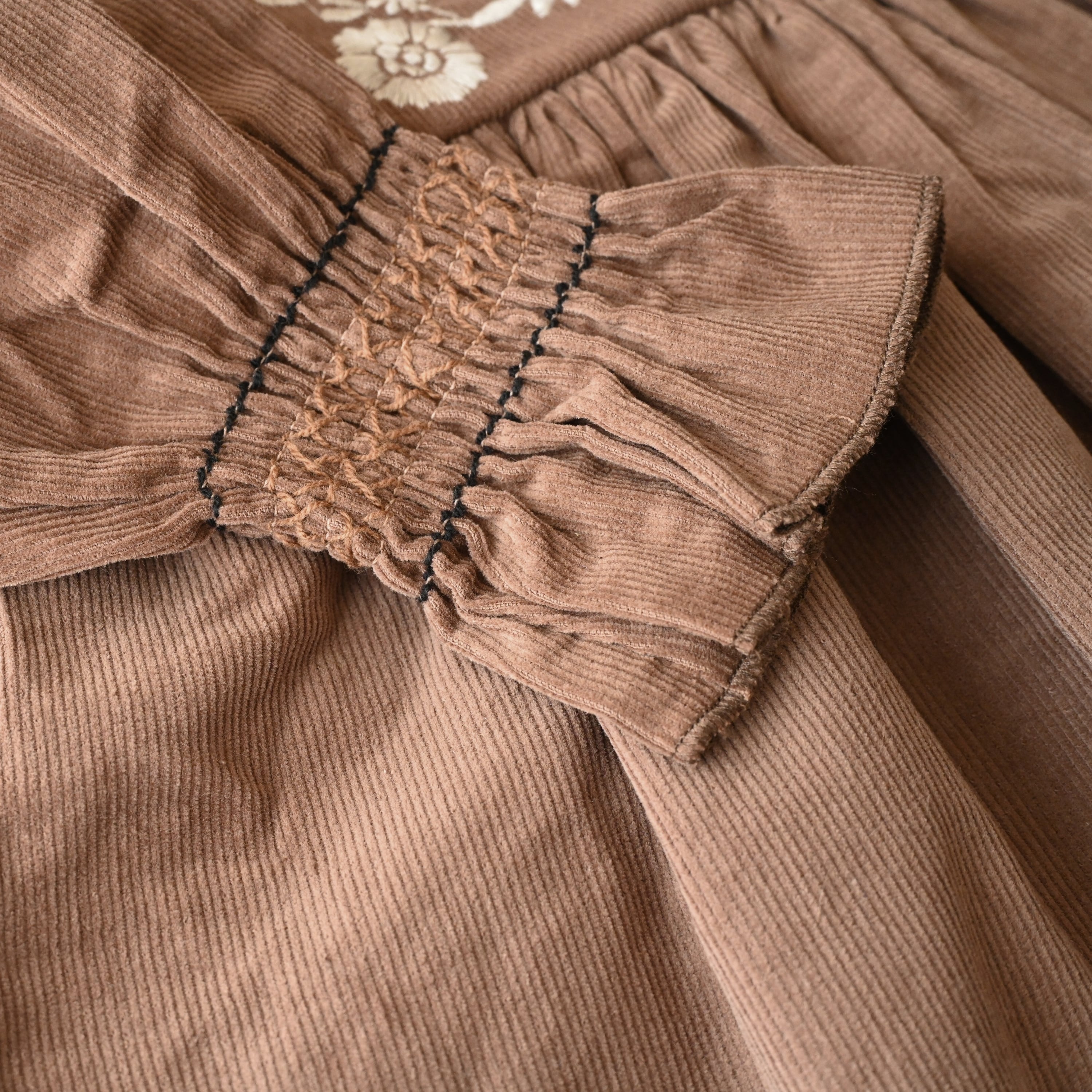 胸元の刺繍が魅力的なコーデュロイ素材のワンピース。