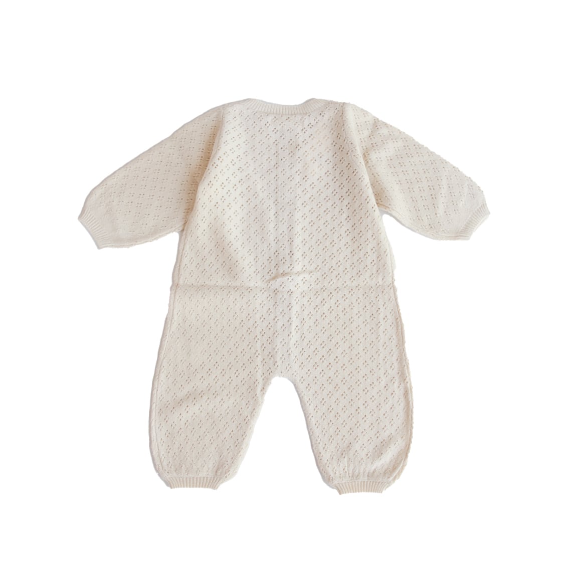 優しい色合いと透かし編みの雰囲気がQuincy Maeらしいロンパース。