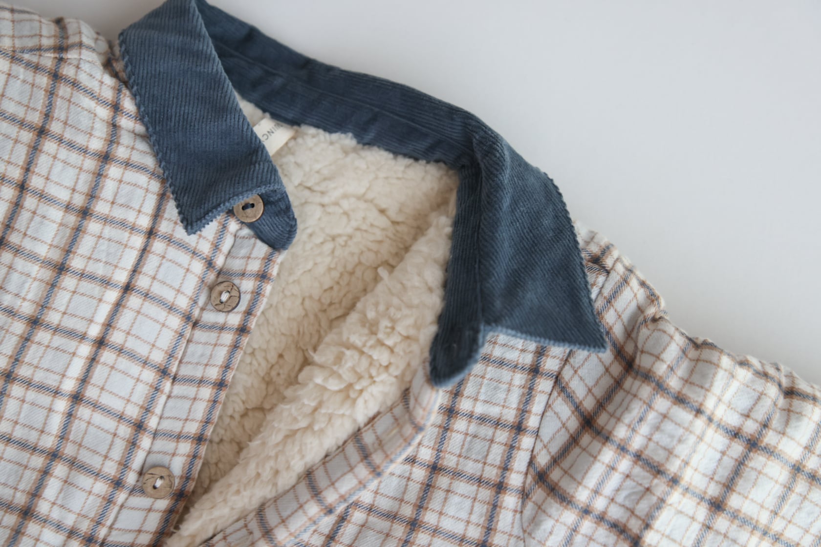 フロントのウッドボタンとコーデュロイの襟が上品さを演出。
