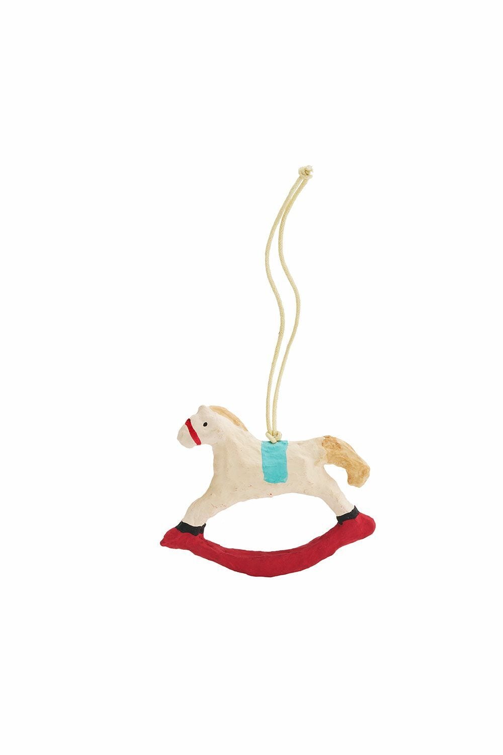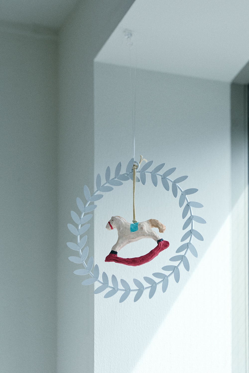 赤色がアクセントになった木馬のオーナメント。