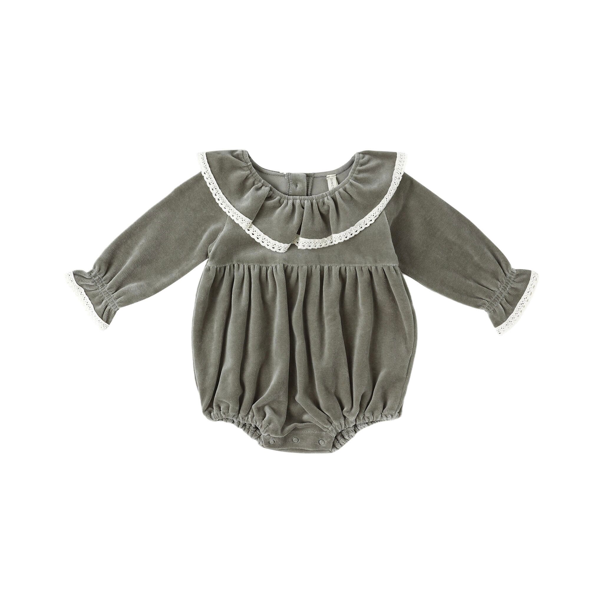 上品で落ち着いた色合いが魅力的なベロア素材のロンパース。