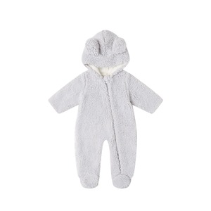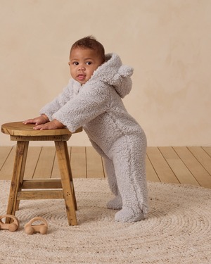 くま耳のフードが付いた、もこもこであたたかなボア素材のジャンプスーツ。