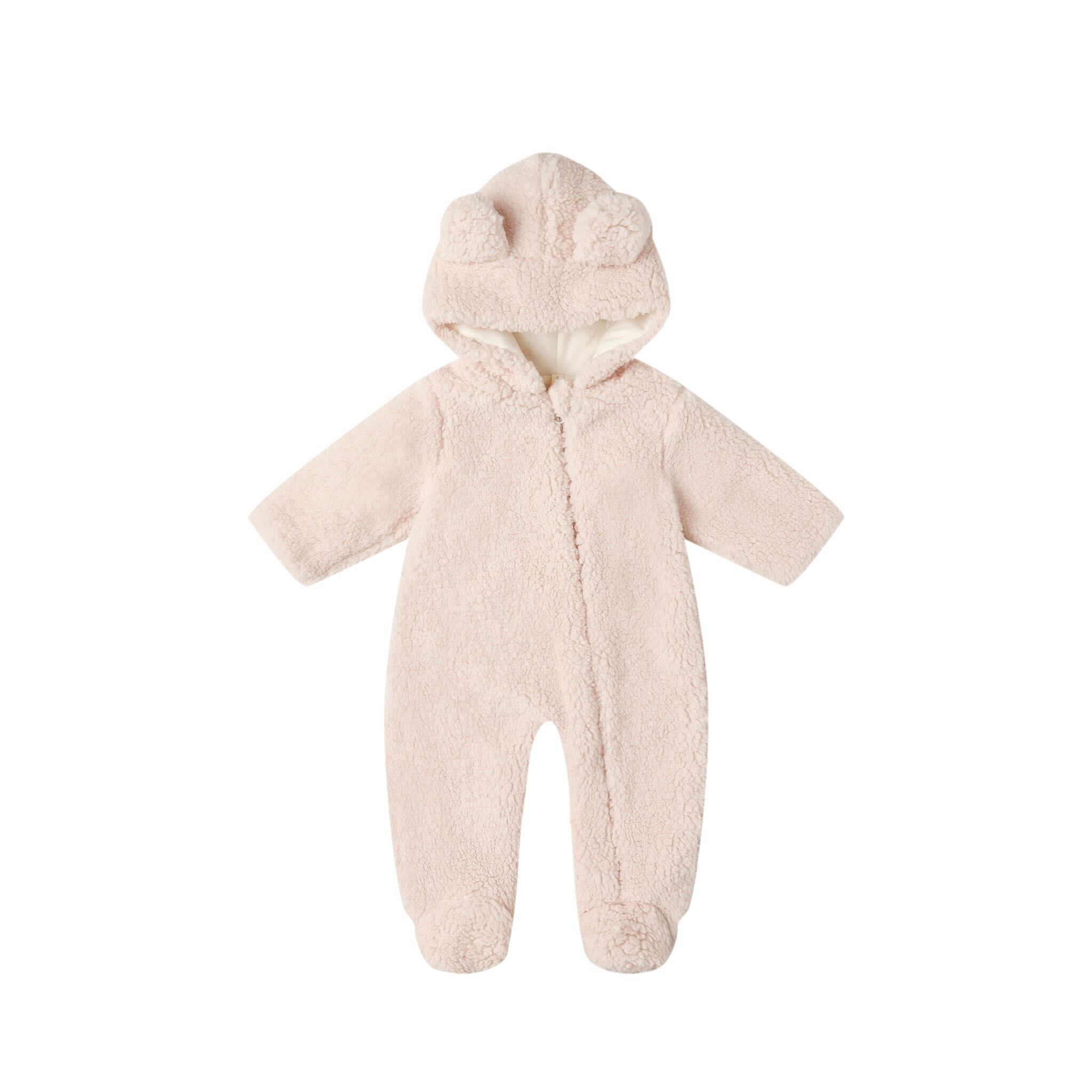 くま耳のフードが付いた、もこもこであたたかなボア素材のジャンプスーツ。