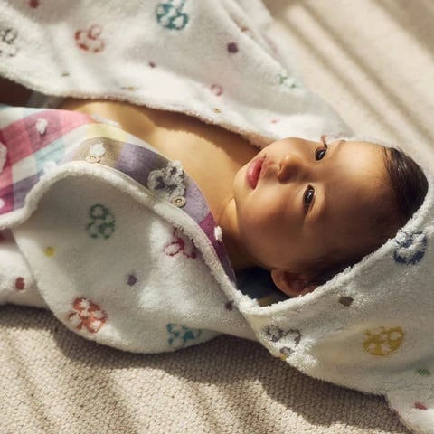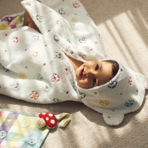 新生児からキッズまで長く使えるフードつきバスポンチョに、