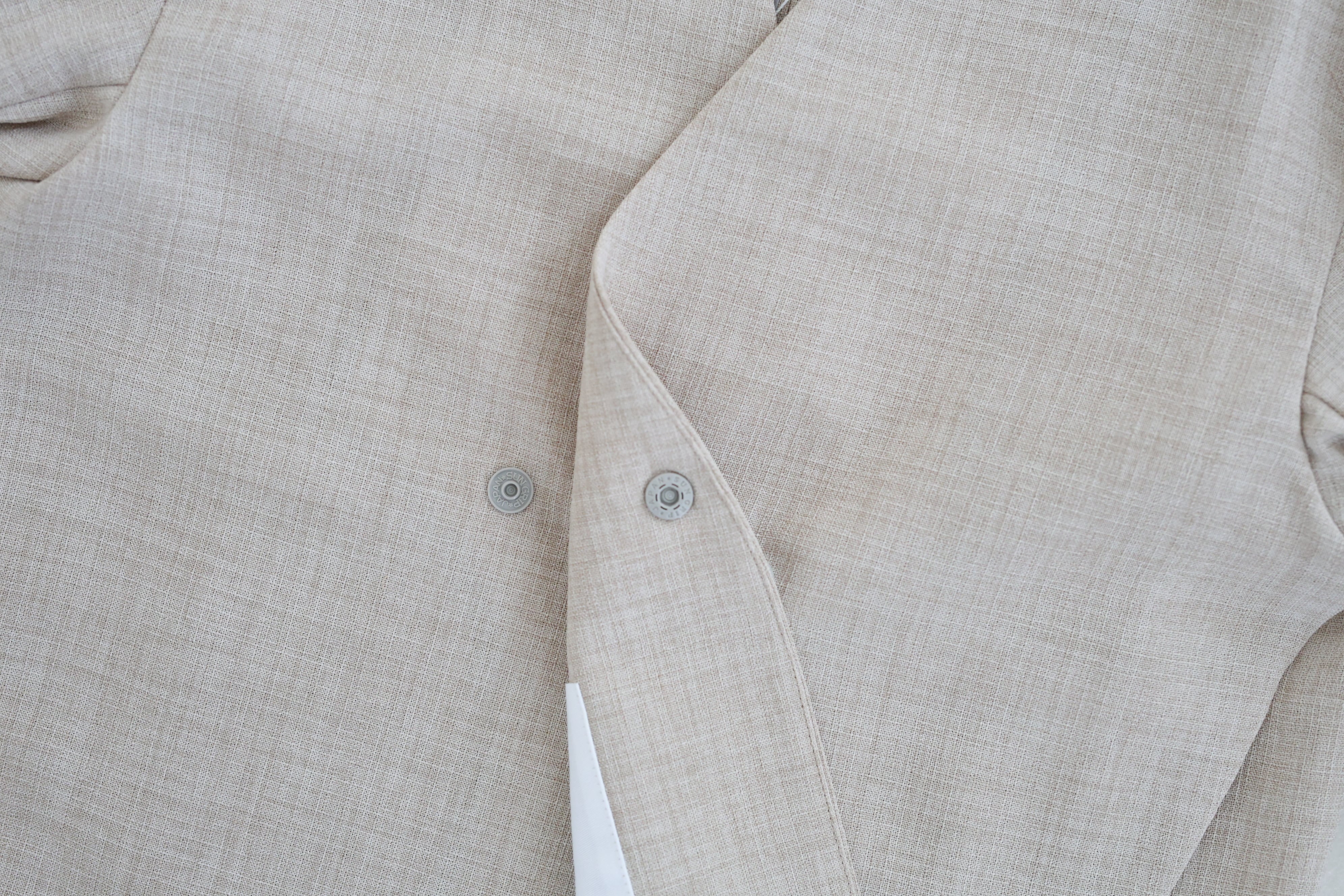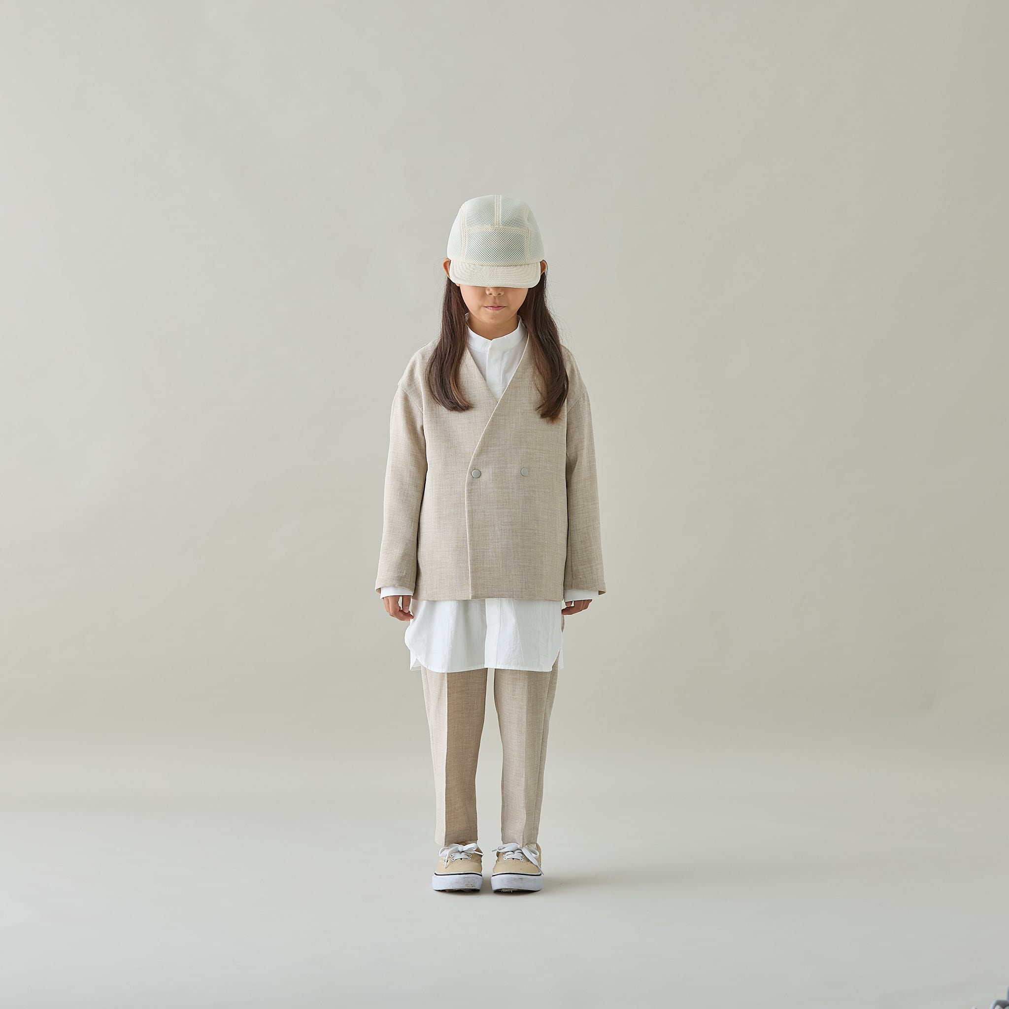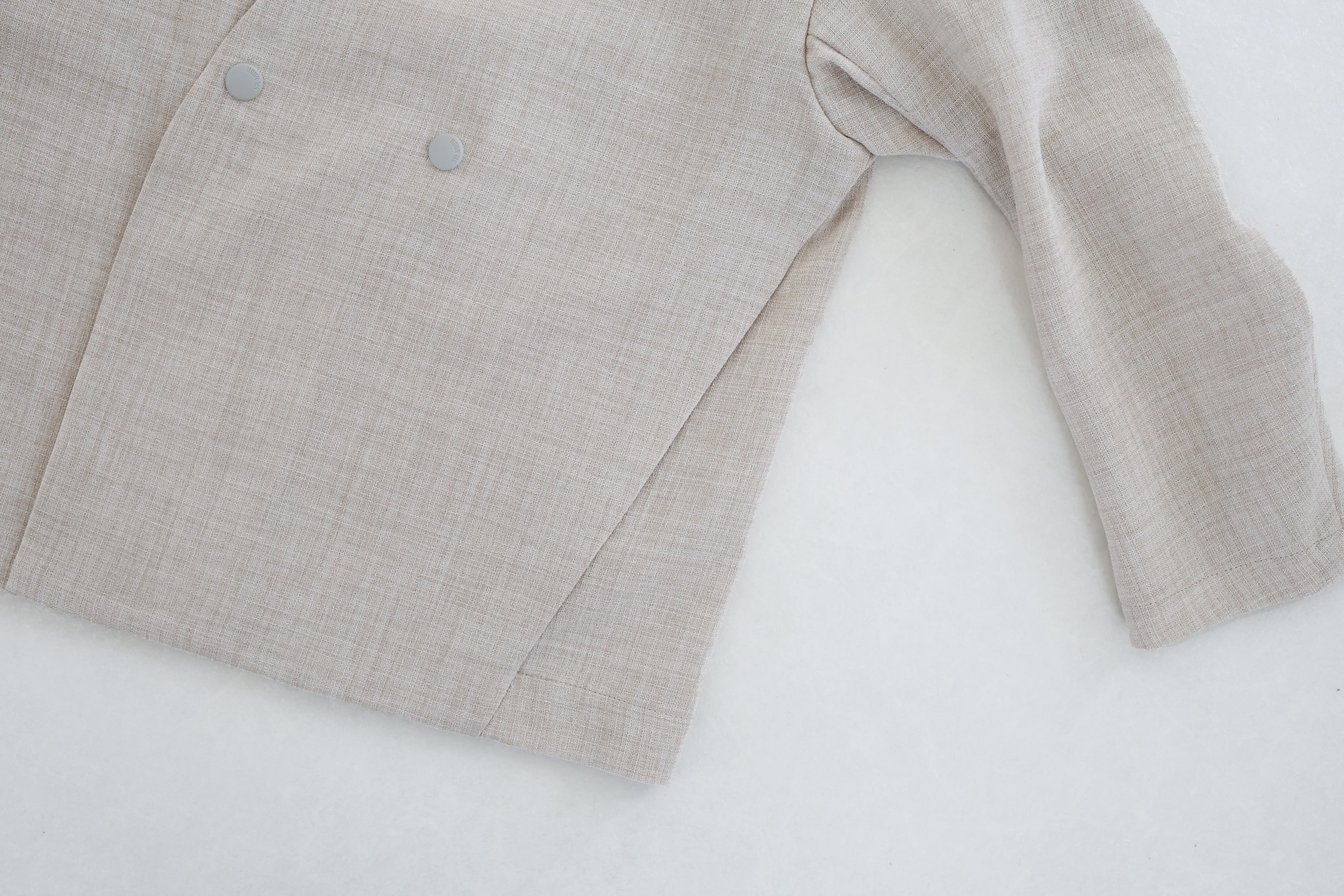 普段着としてはもちろん、セレモニーなどでも着用できる、リラックス感がありながら、きちんとした雰囲気のノーカラージャケットです。