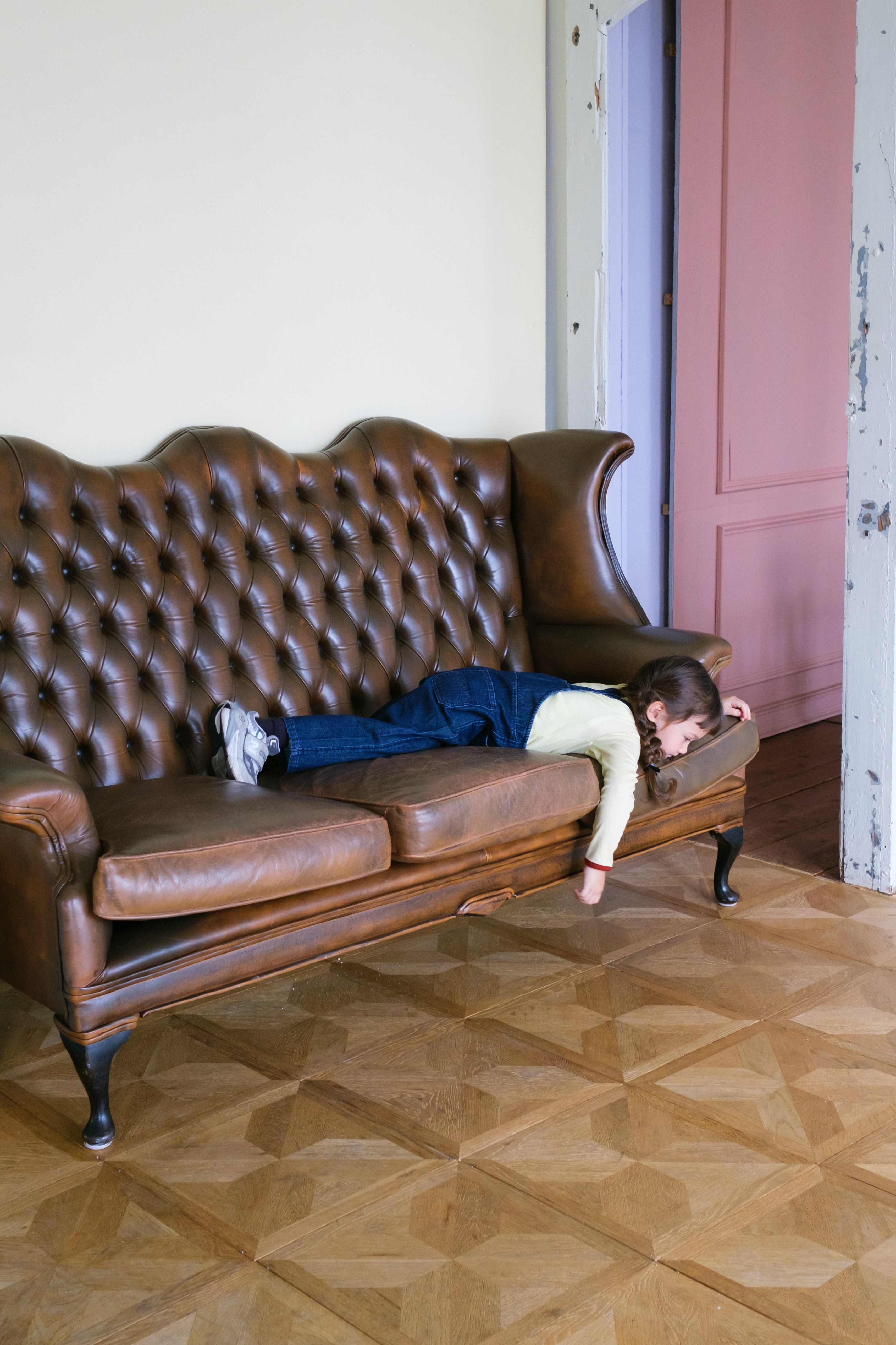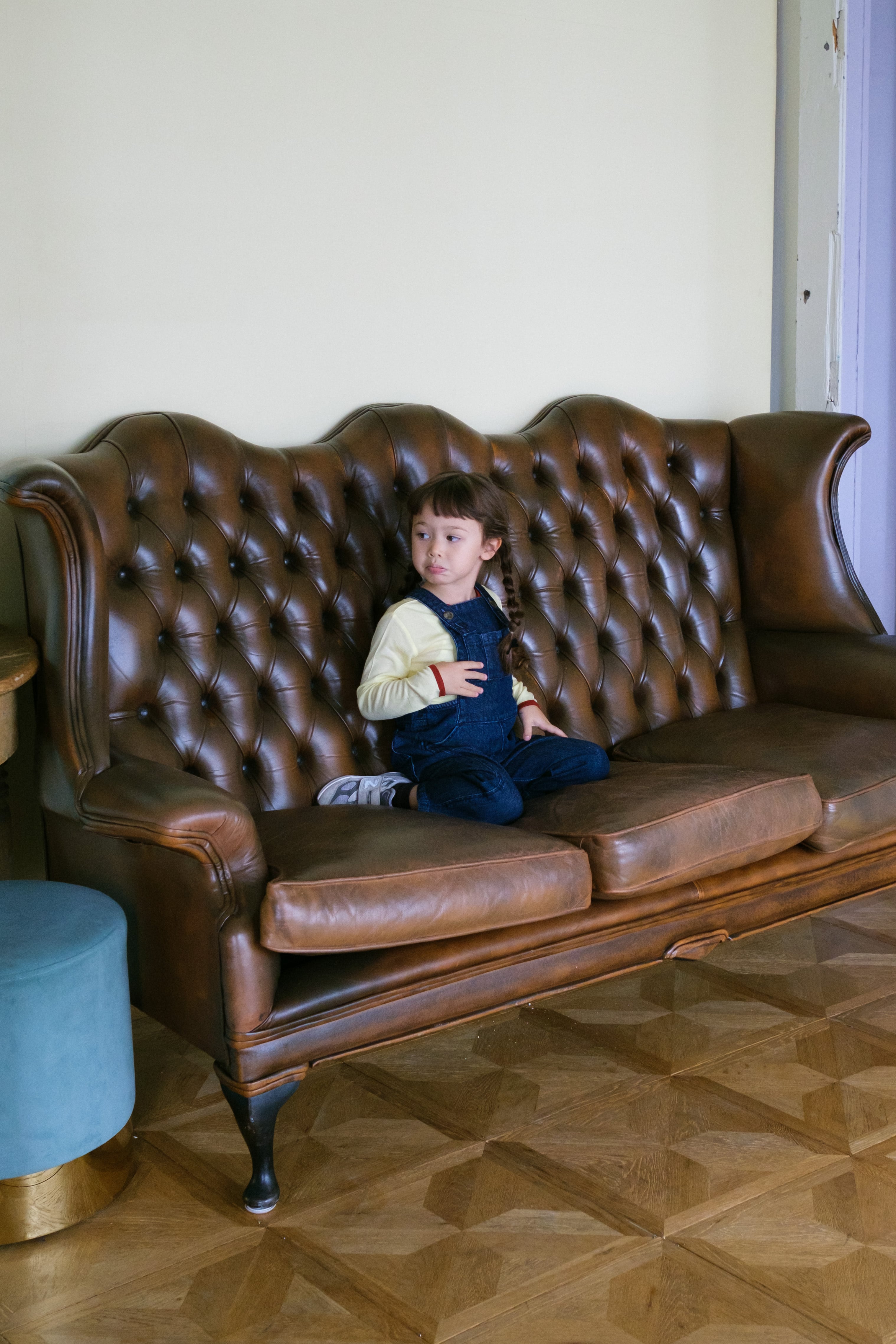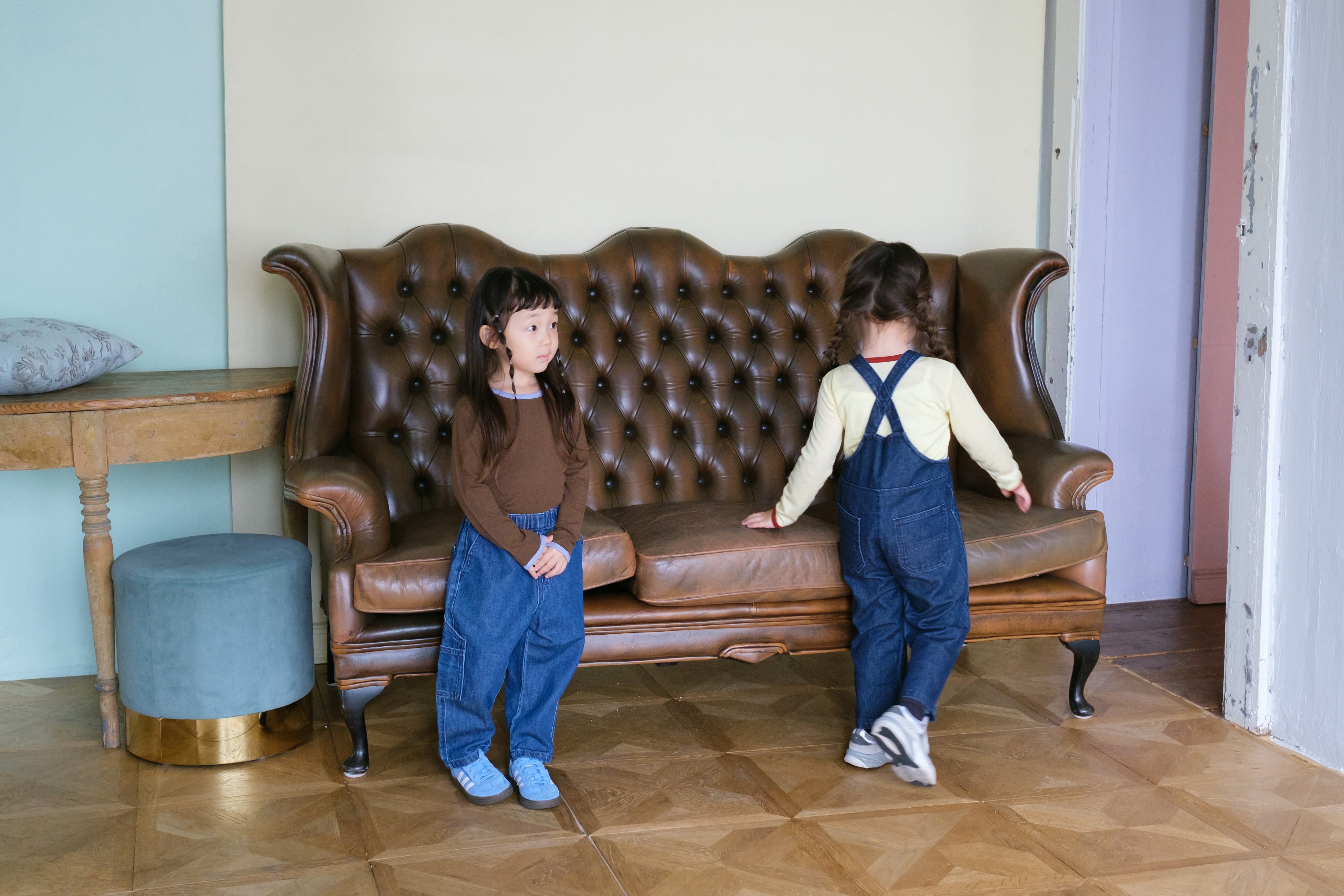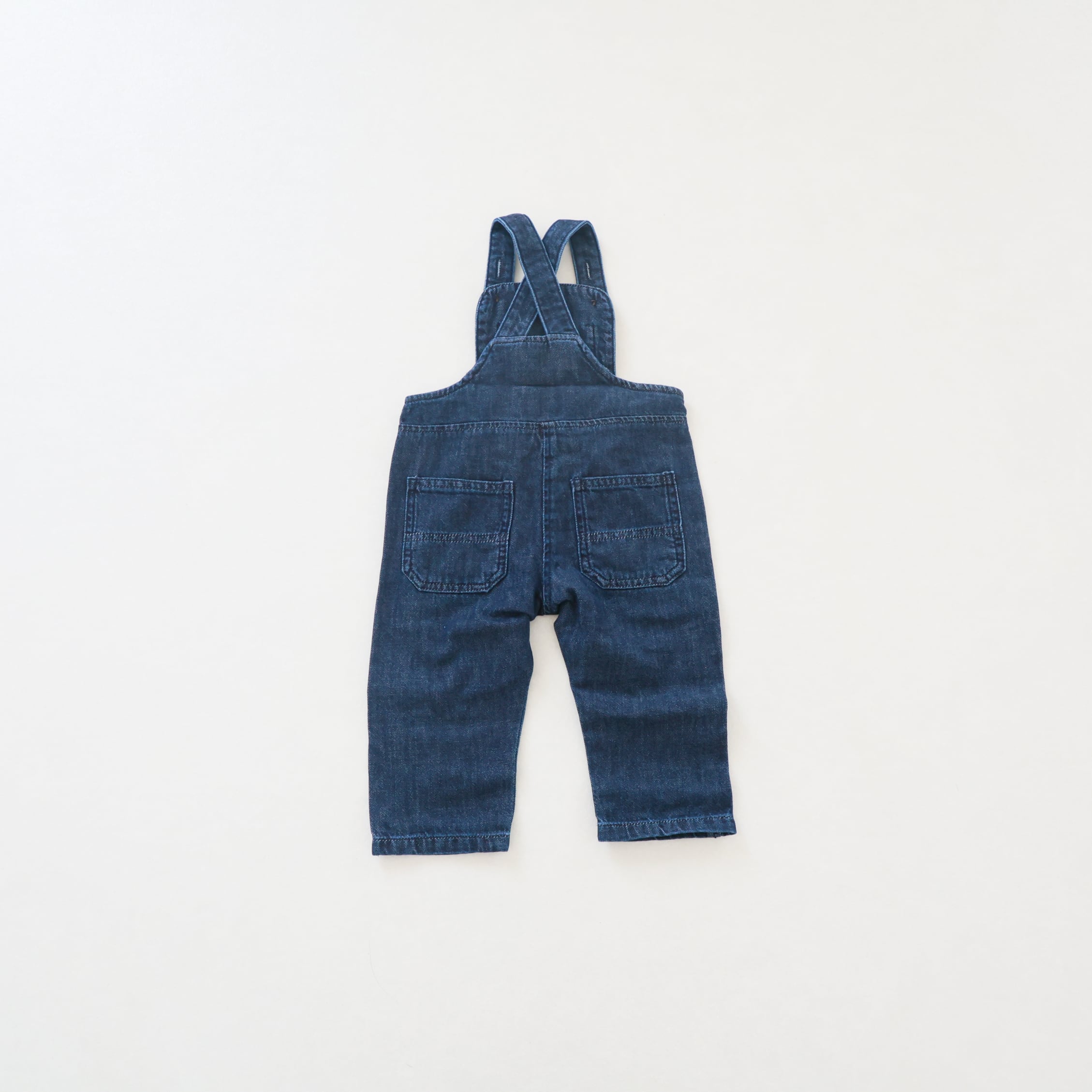 ワーク感のあるデニムサロペットですが、肩紐やポケットなどの角に丸みを持たせることで