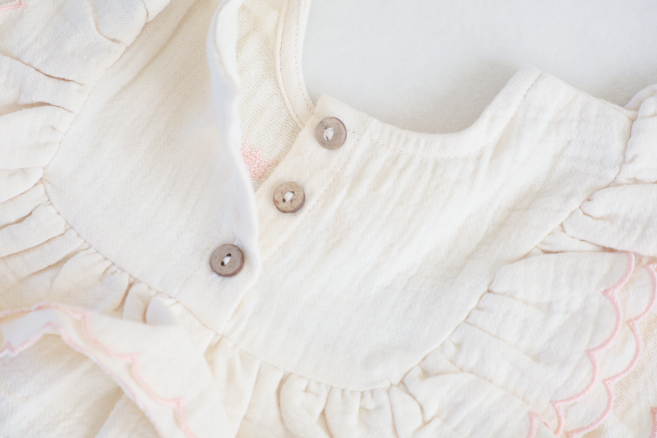 ワンピースの後ろは着脱しやすいウッドボタンで