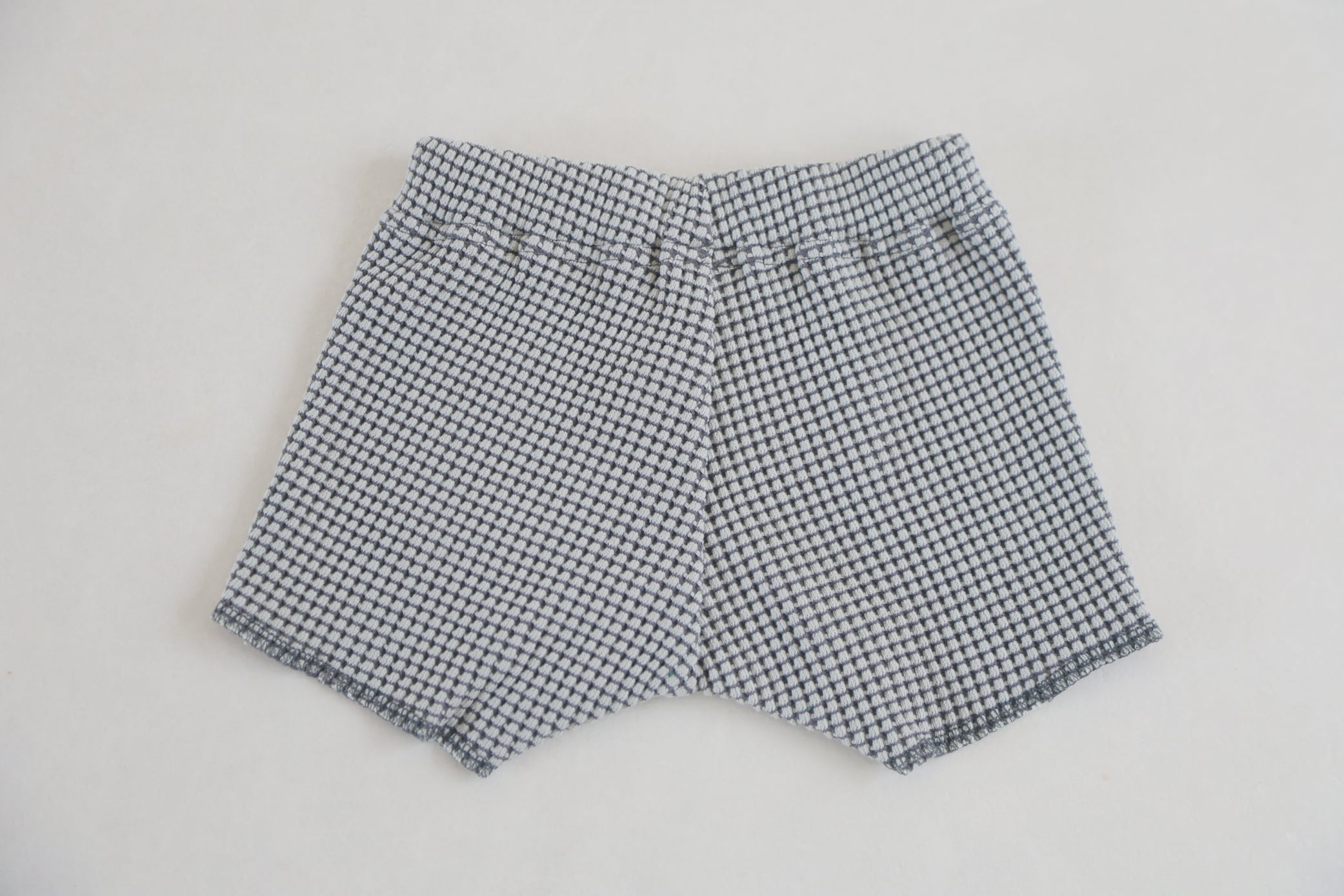バイカラー(2配色)で作った、細かいチェック柄の様に見える、独特な表情のオリジナルのワッフル素材を使用した、ややスリムなショートパンツです。