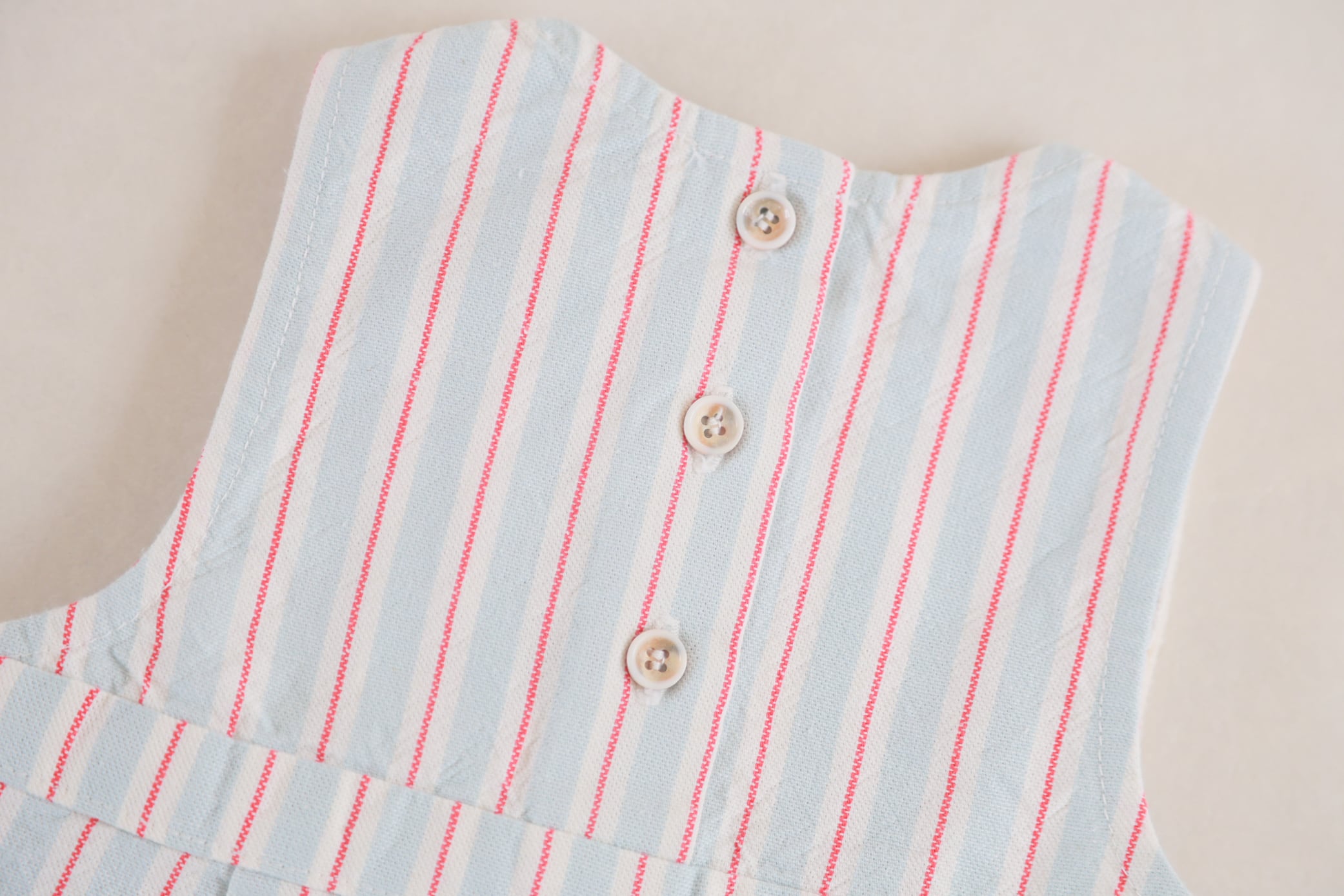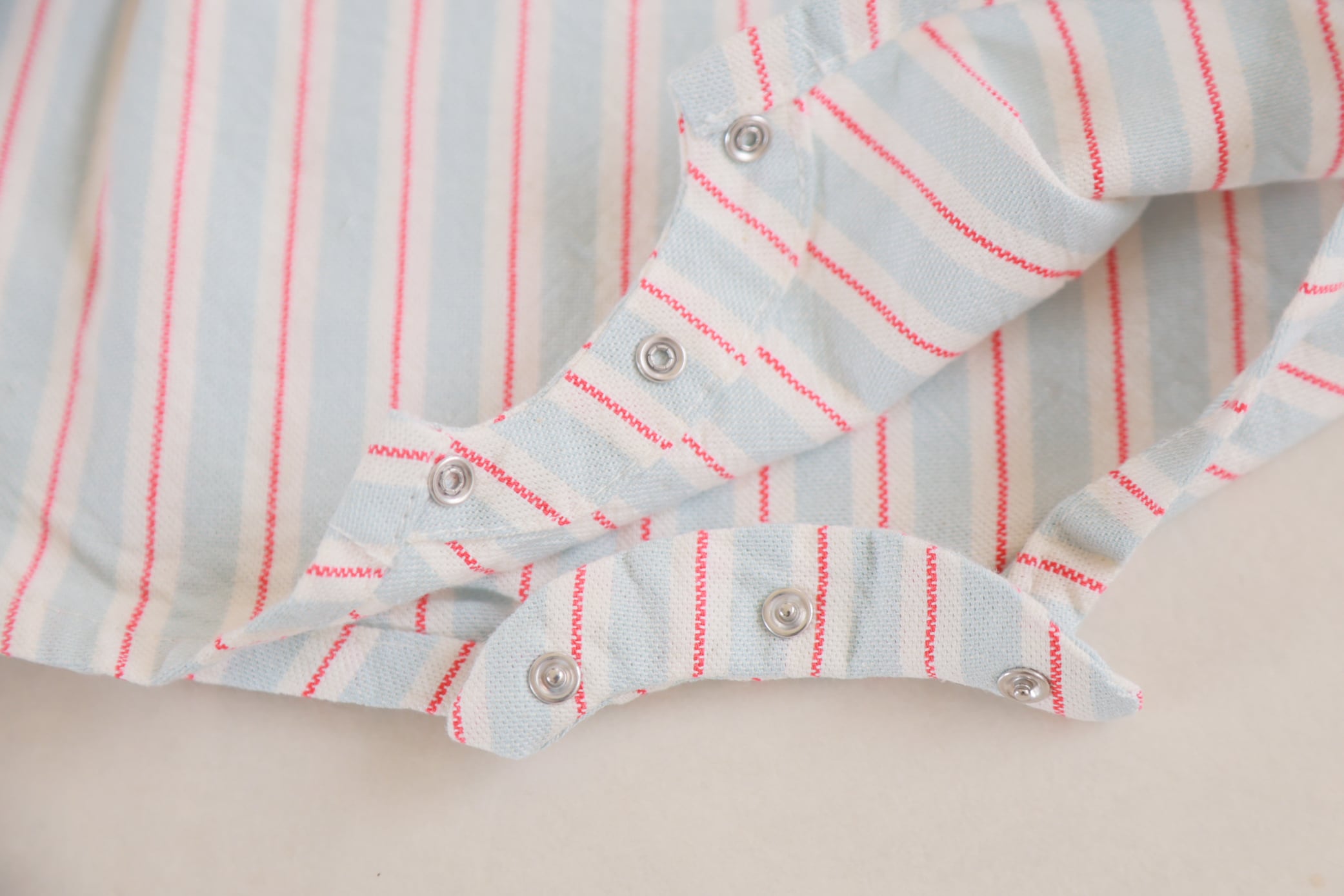 背中には着脱しやすいボタンを施し、股部分はスナップボタンが付いています。