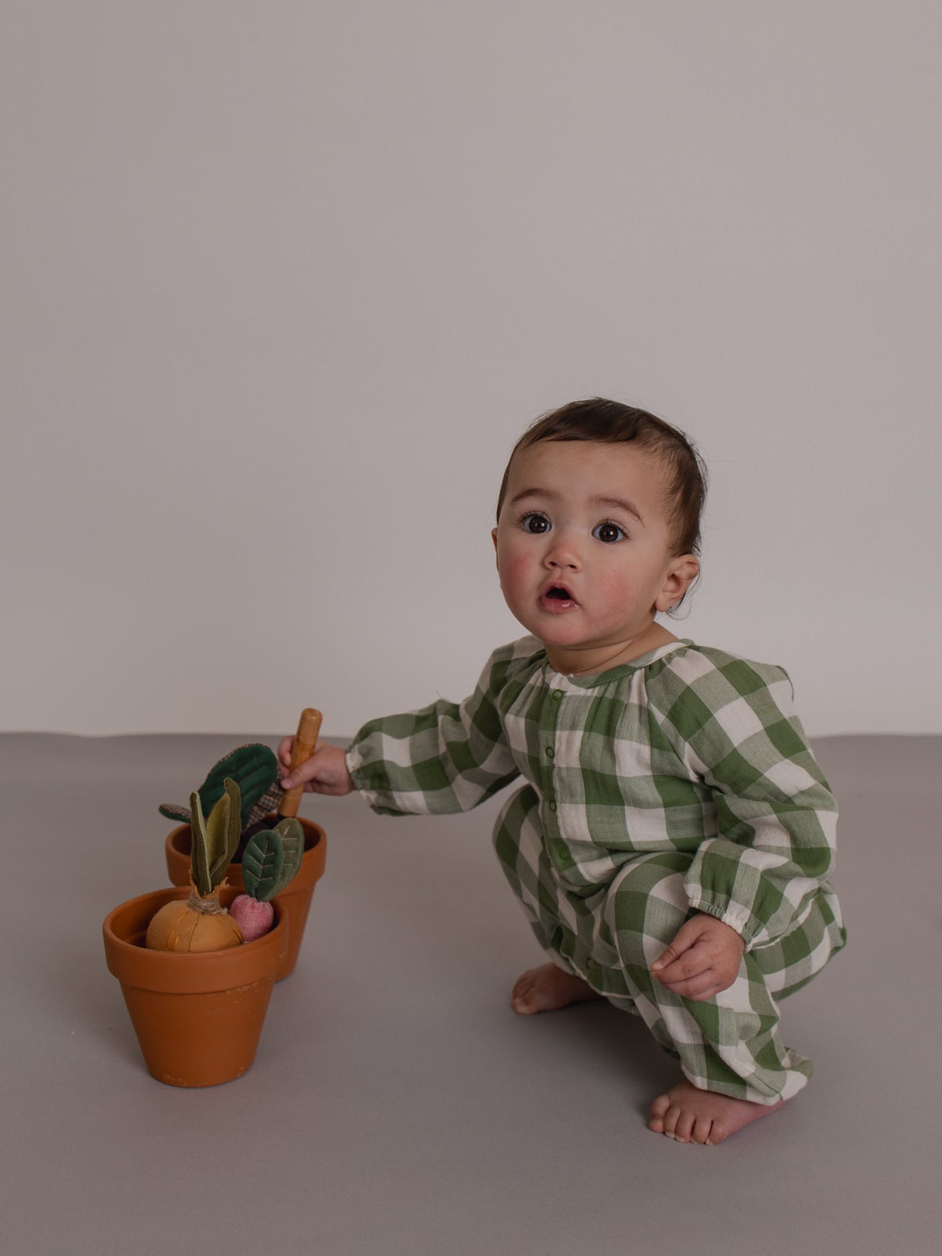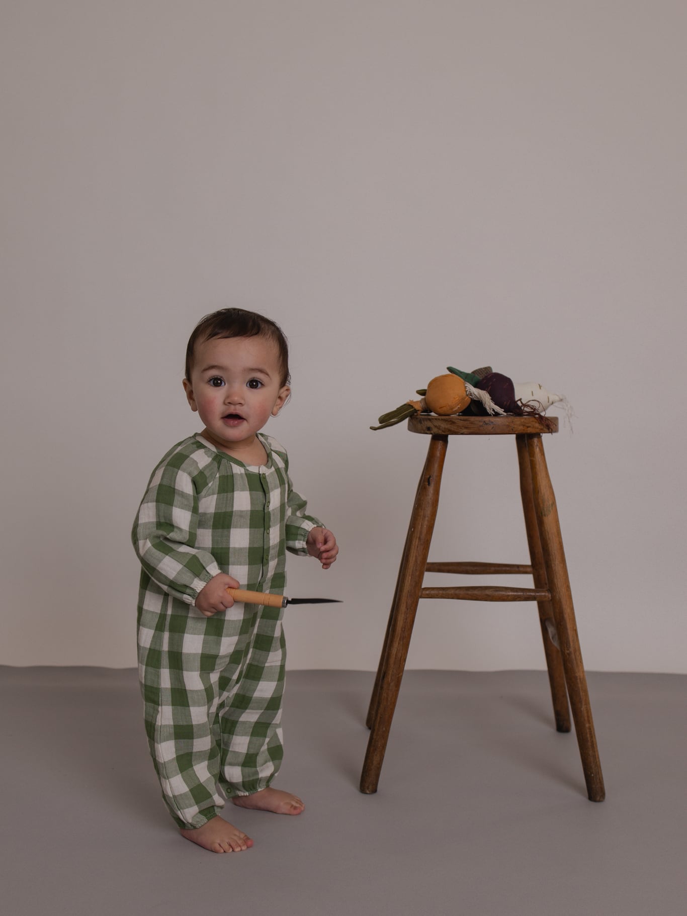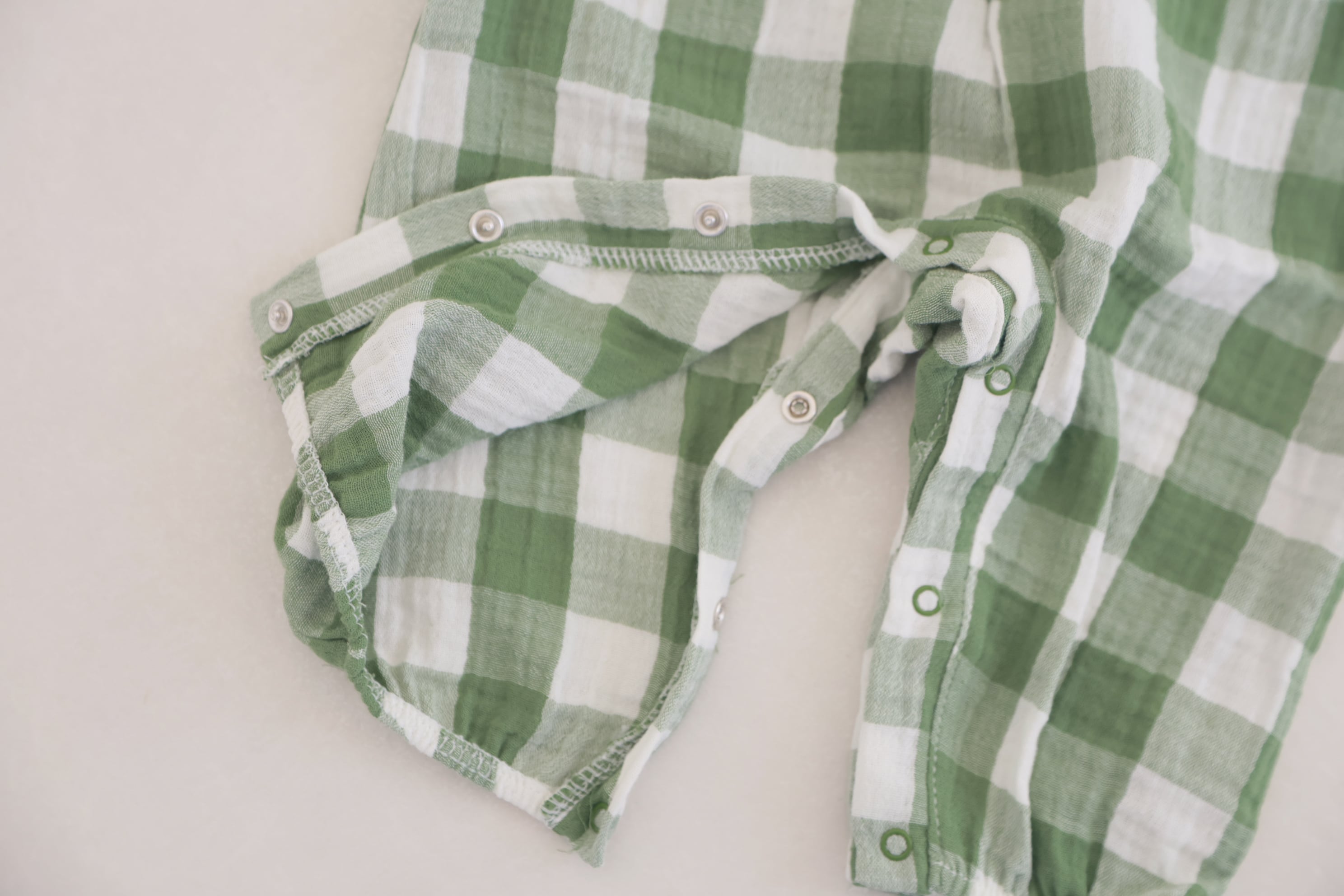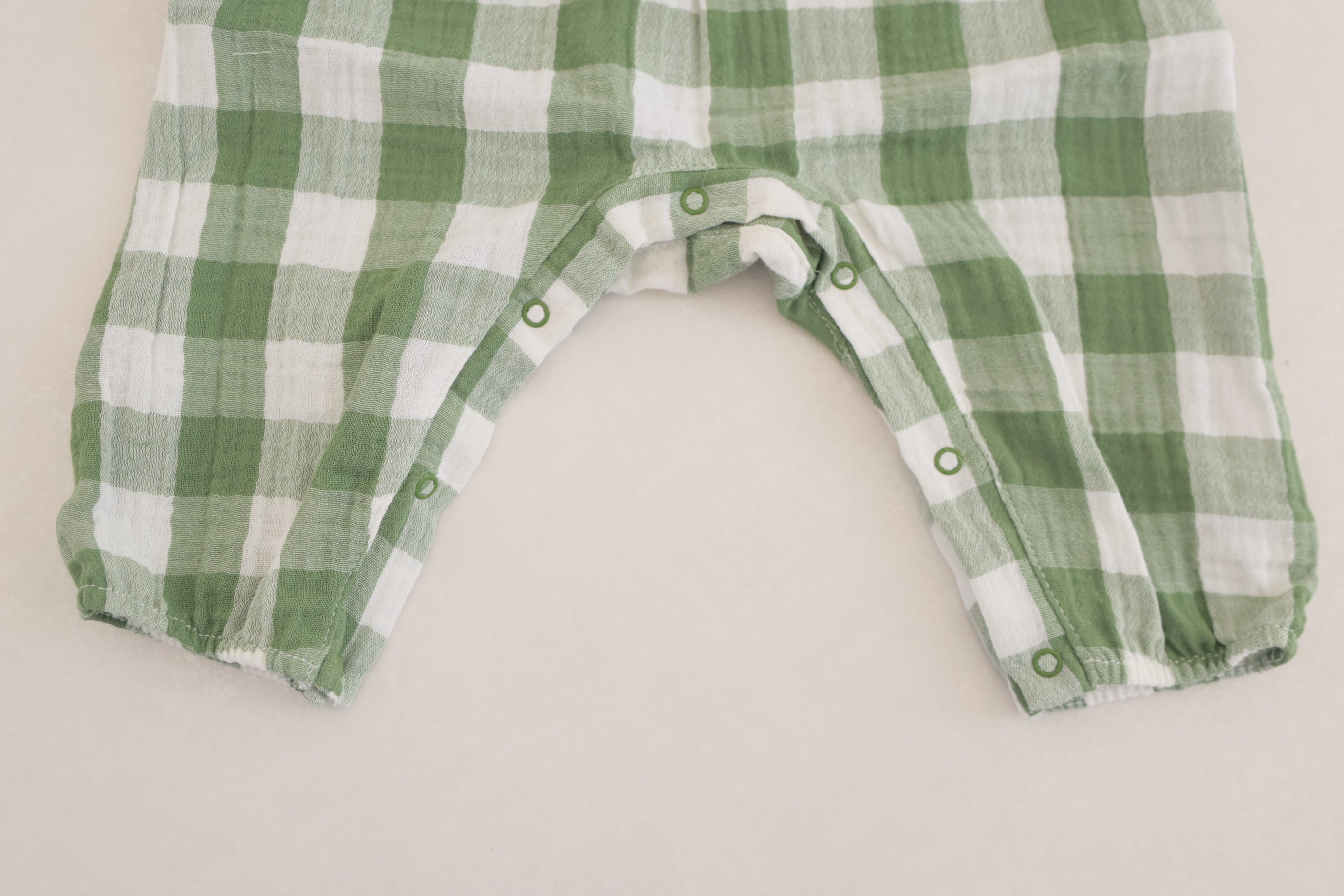 優しいナチュラルな雰囲気が可愛らしいチェック柄のロンパース。