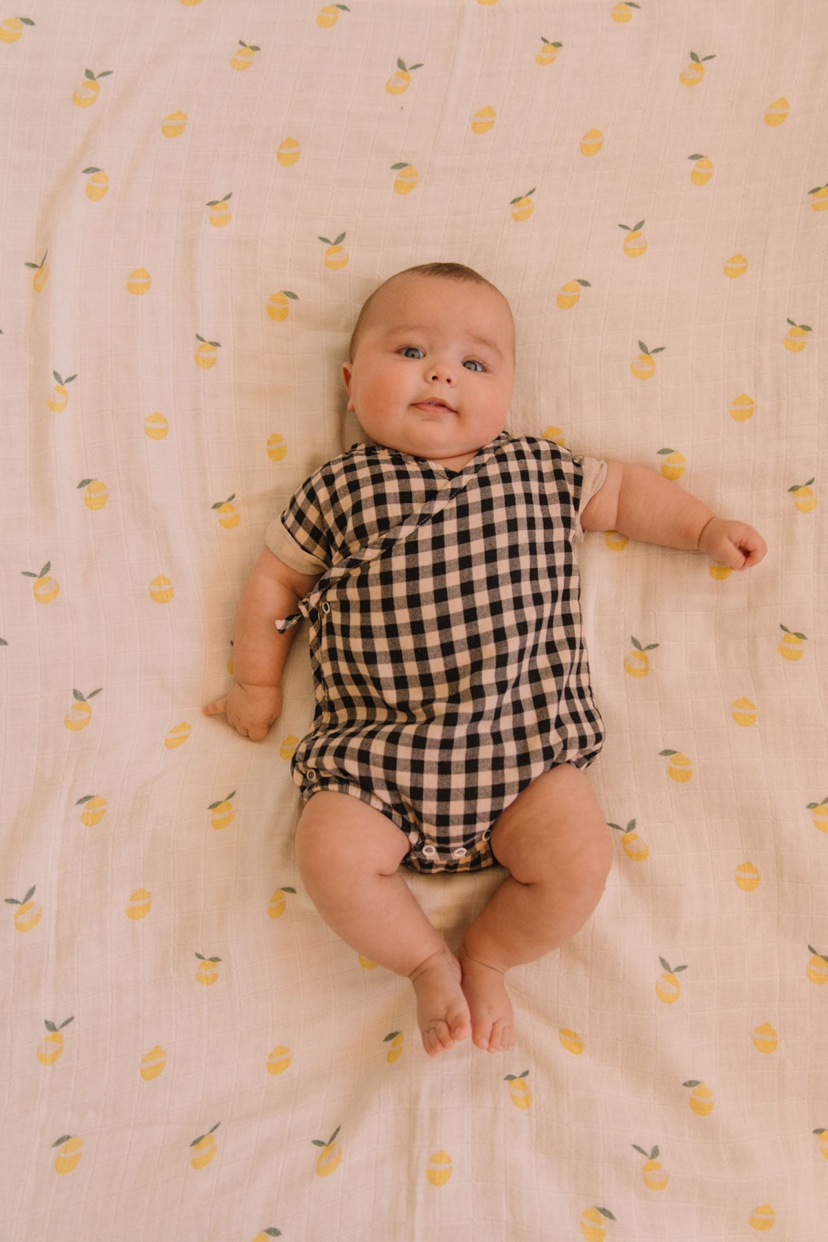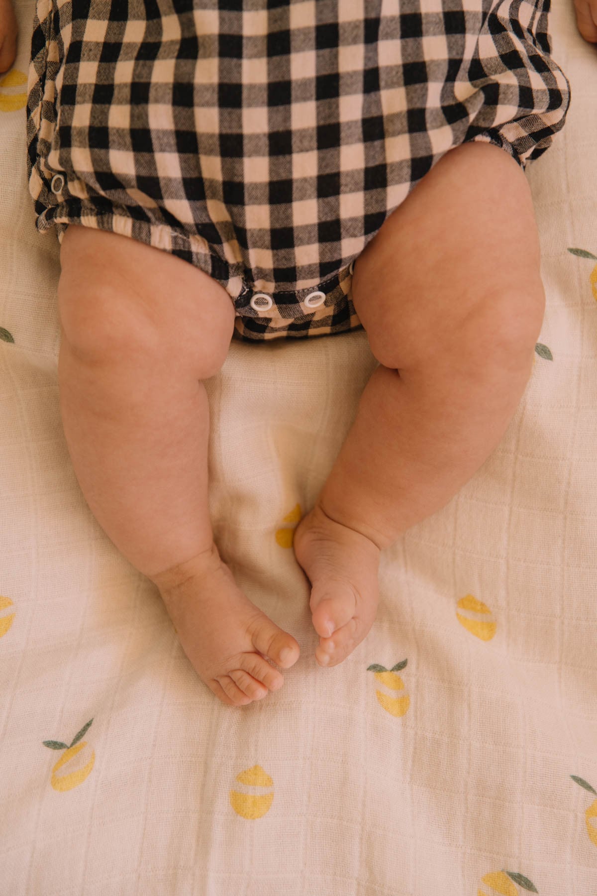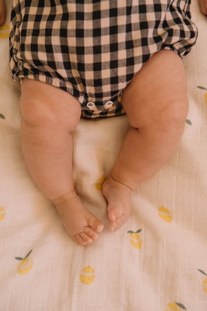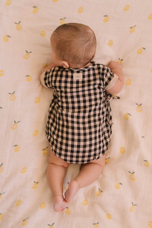 オーガニックコットンで仕立てられたガーゼ生地のロンパース。