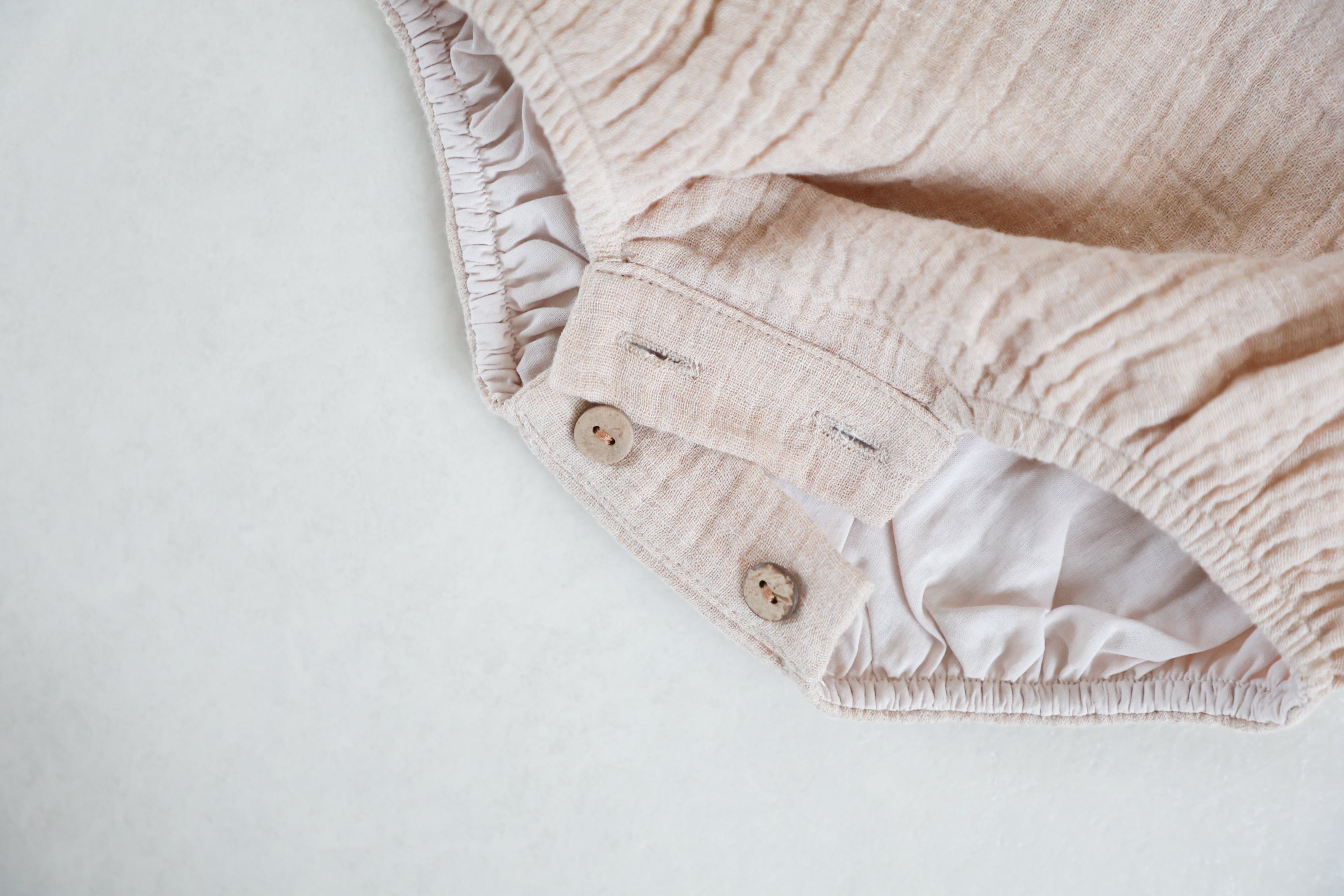 肩と股の部分にはウッドボタンがついているので着脱しやすく、