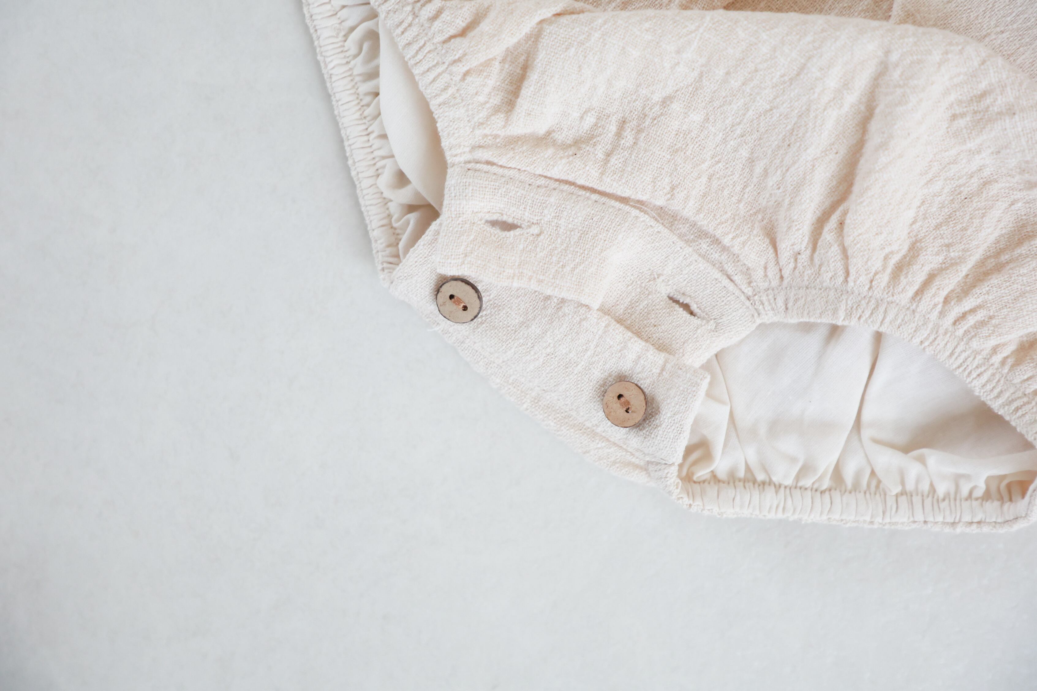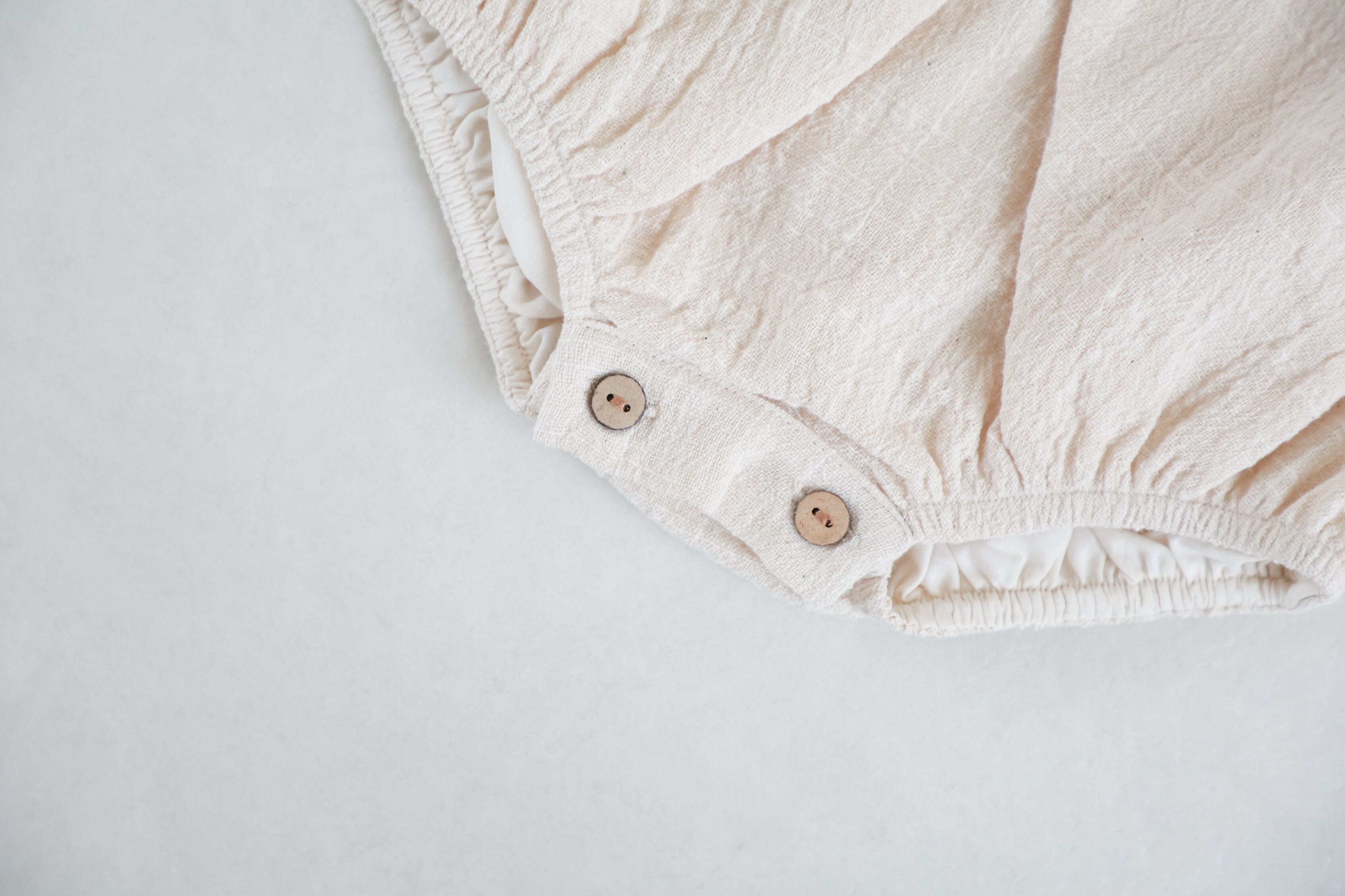 肩と股の部分にはウッドボタンがついているので着脱しやすく、