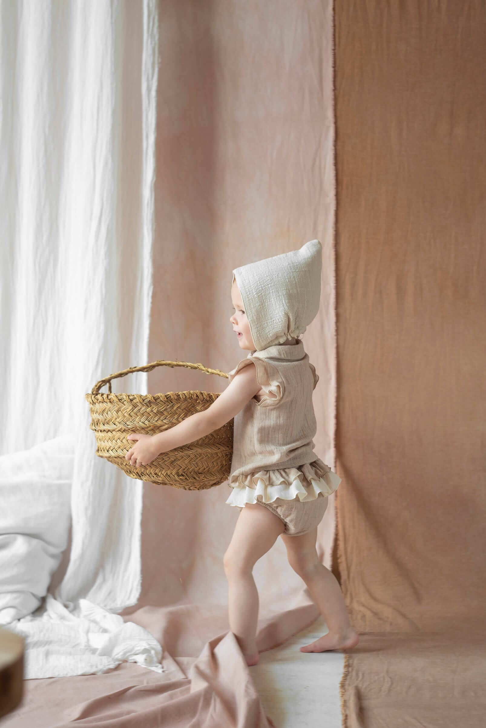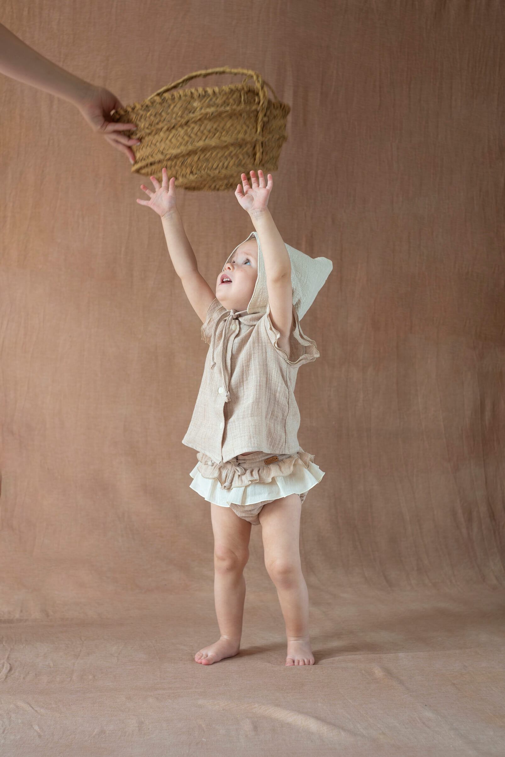 こども達が心地よく着用できるようコットンや麻などの天然素材を使用した丁寧なつくりのアイテムは、人権に配慮したフェアトレードとサステナブルな生産を忠実に守り、テキスタイルも含め、原材料と生産の全てがスペイン国内で製作されています。