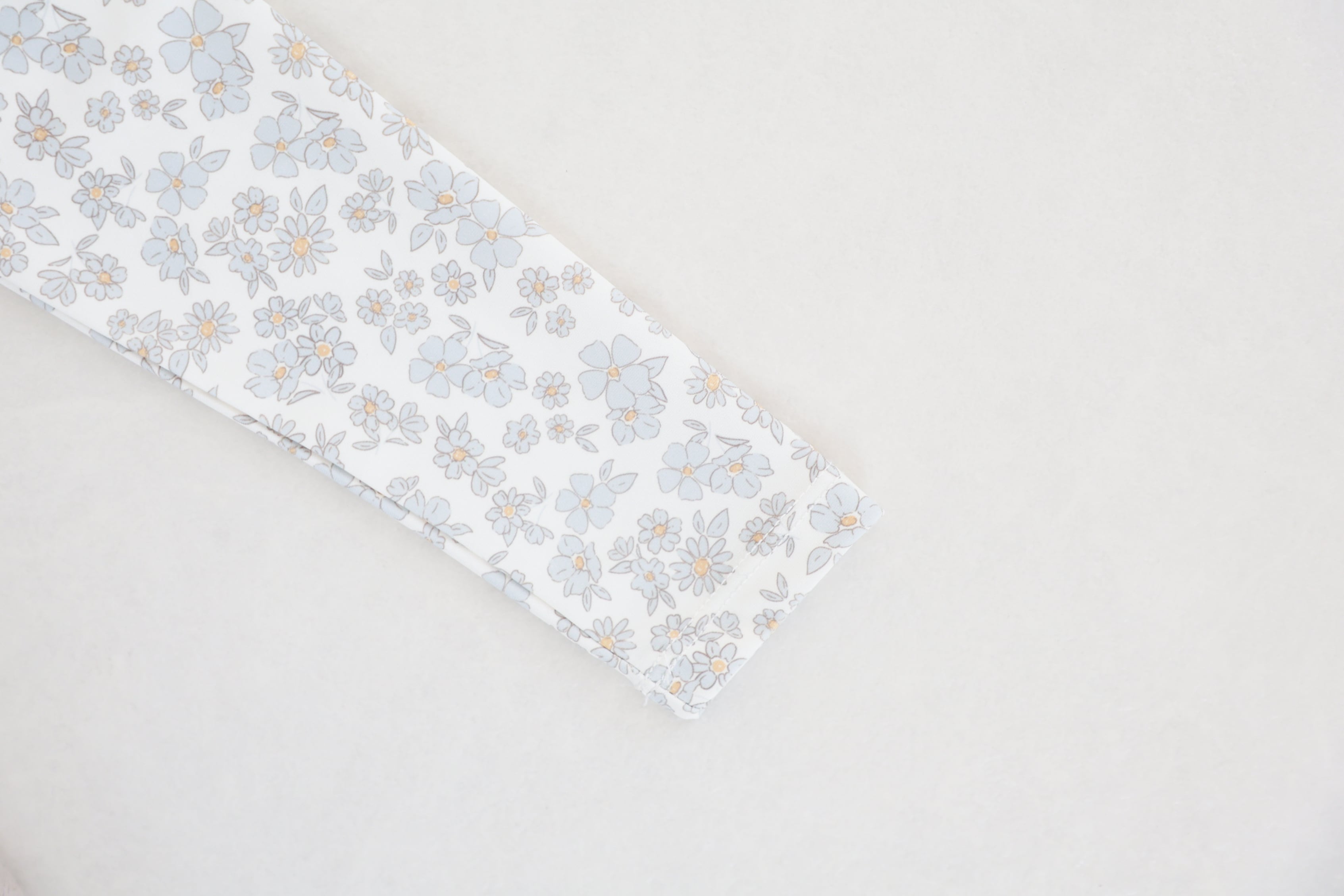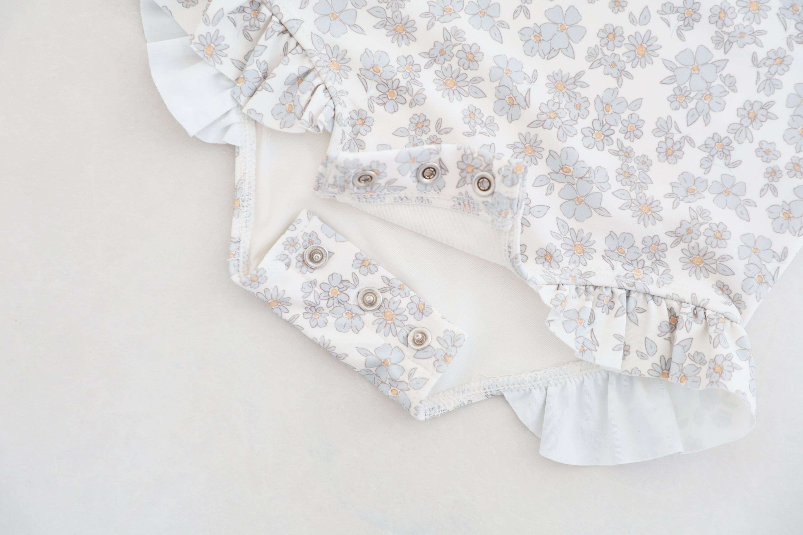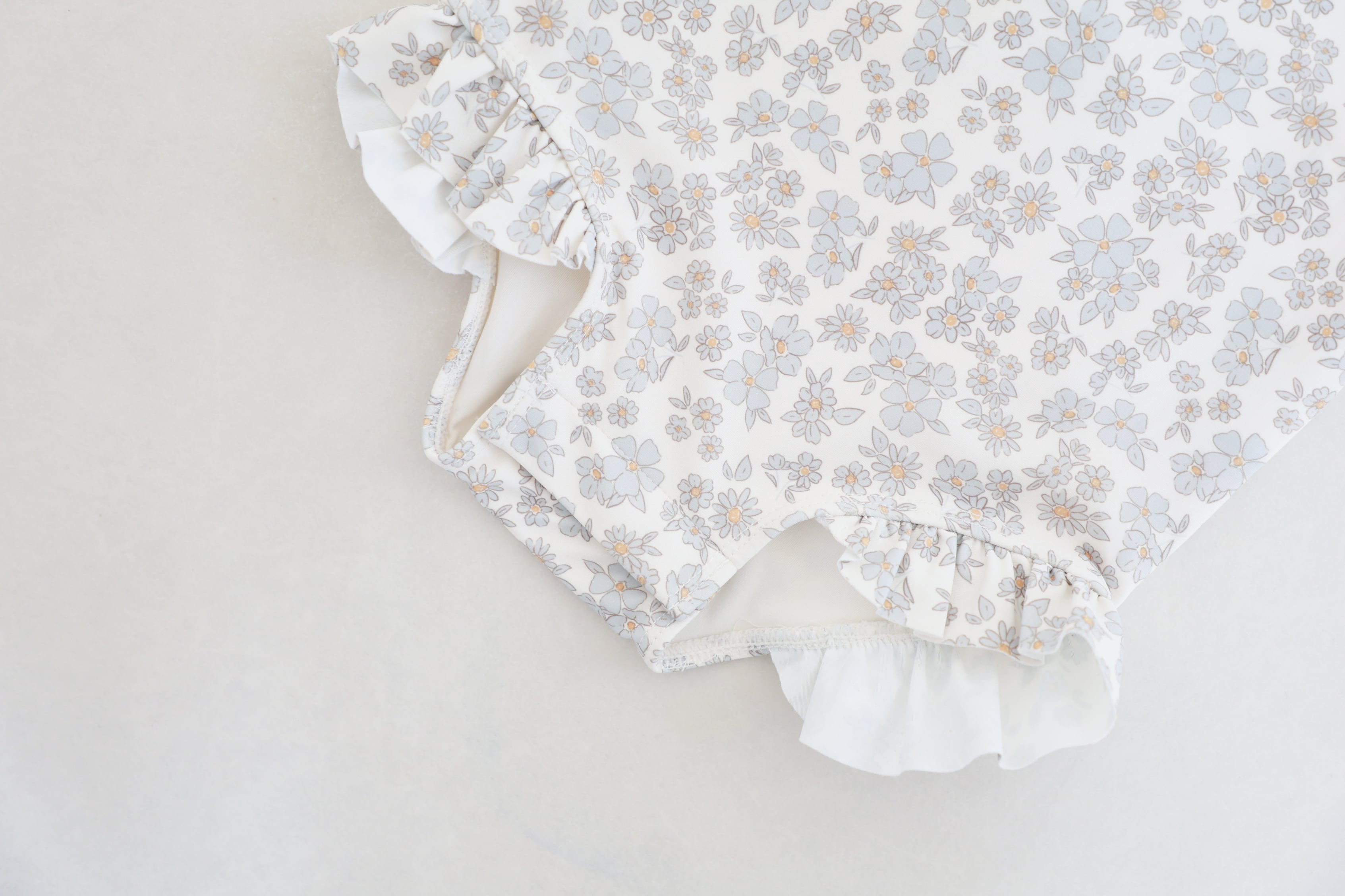 ブルーのお花柄と、脚の開口部にフリルをあしらった