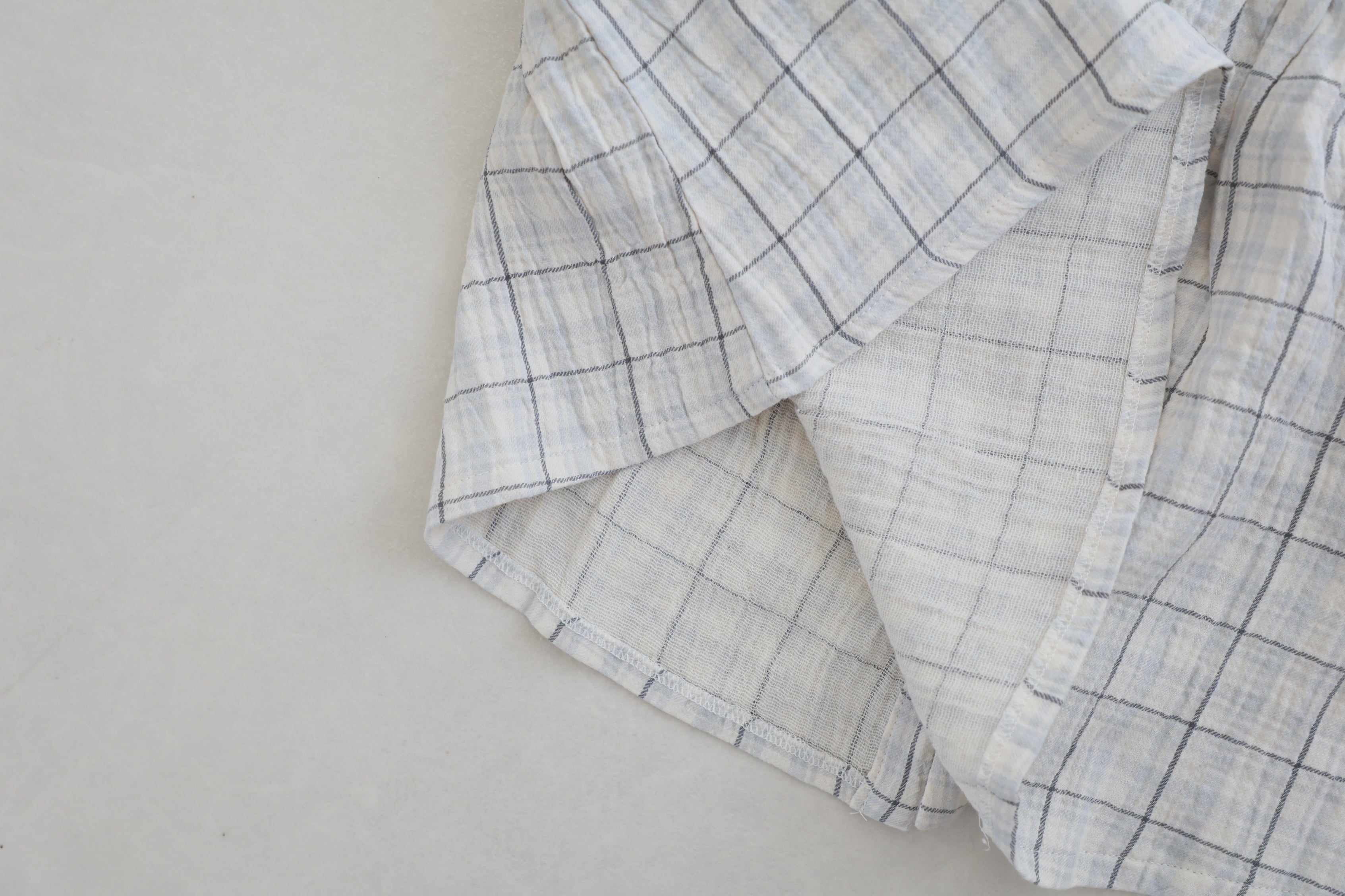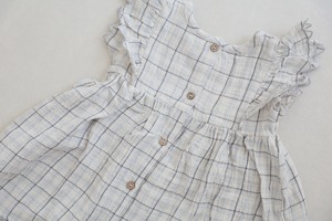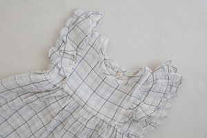 肩のフリルデザインと爽やかなチェック柄が魅力的です。