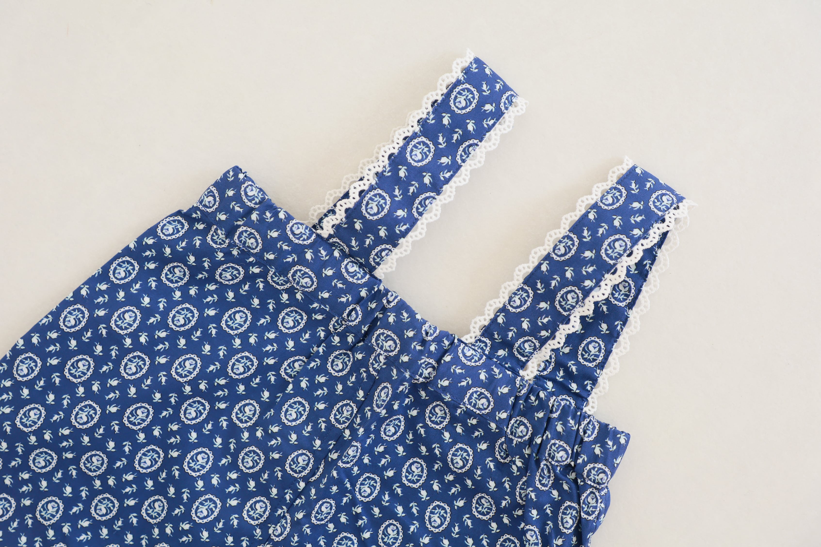 ブルーが新鮮な花柄プリントシリーズよりガーリーなサロペット。