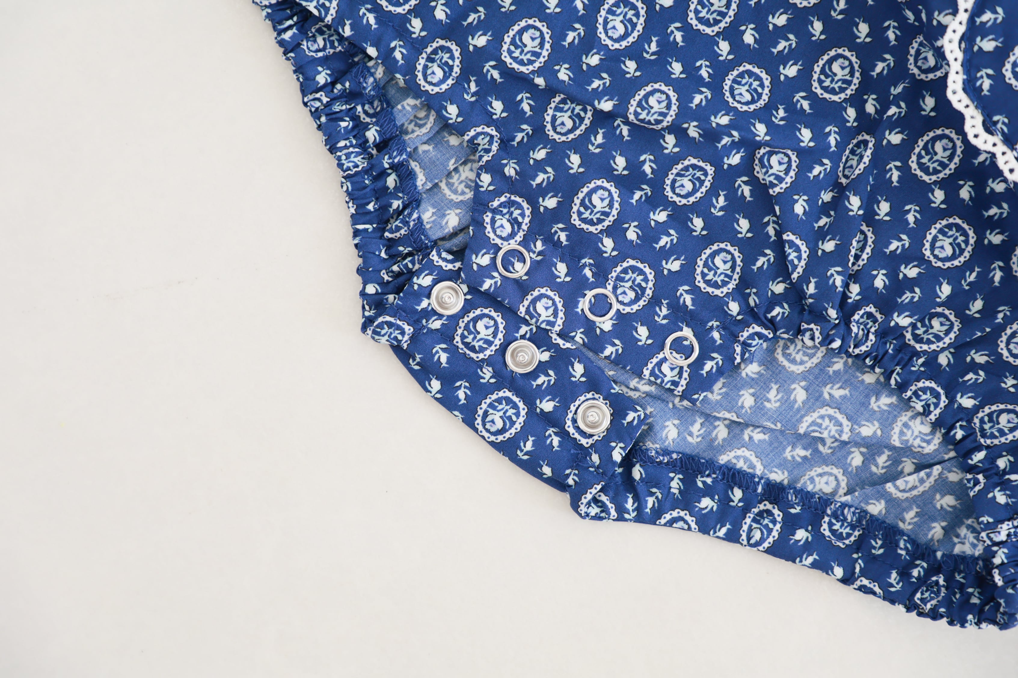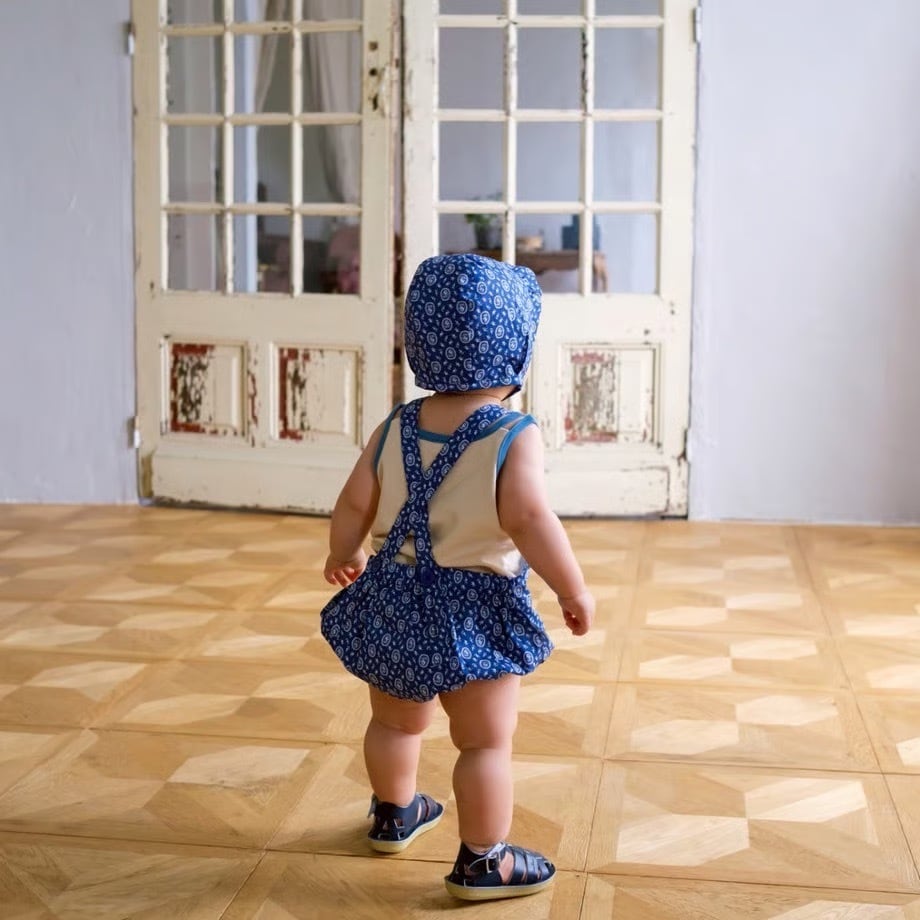 ブルーが新鮮な花柄プリントシリーズより可愛らしいサロペットロンパースです。