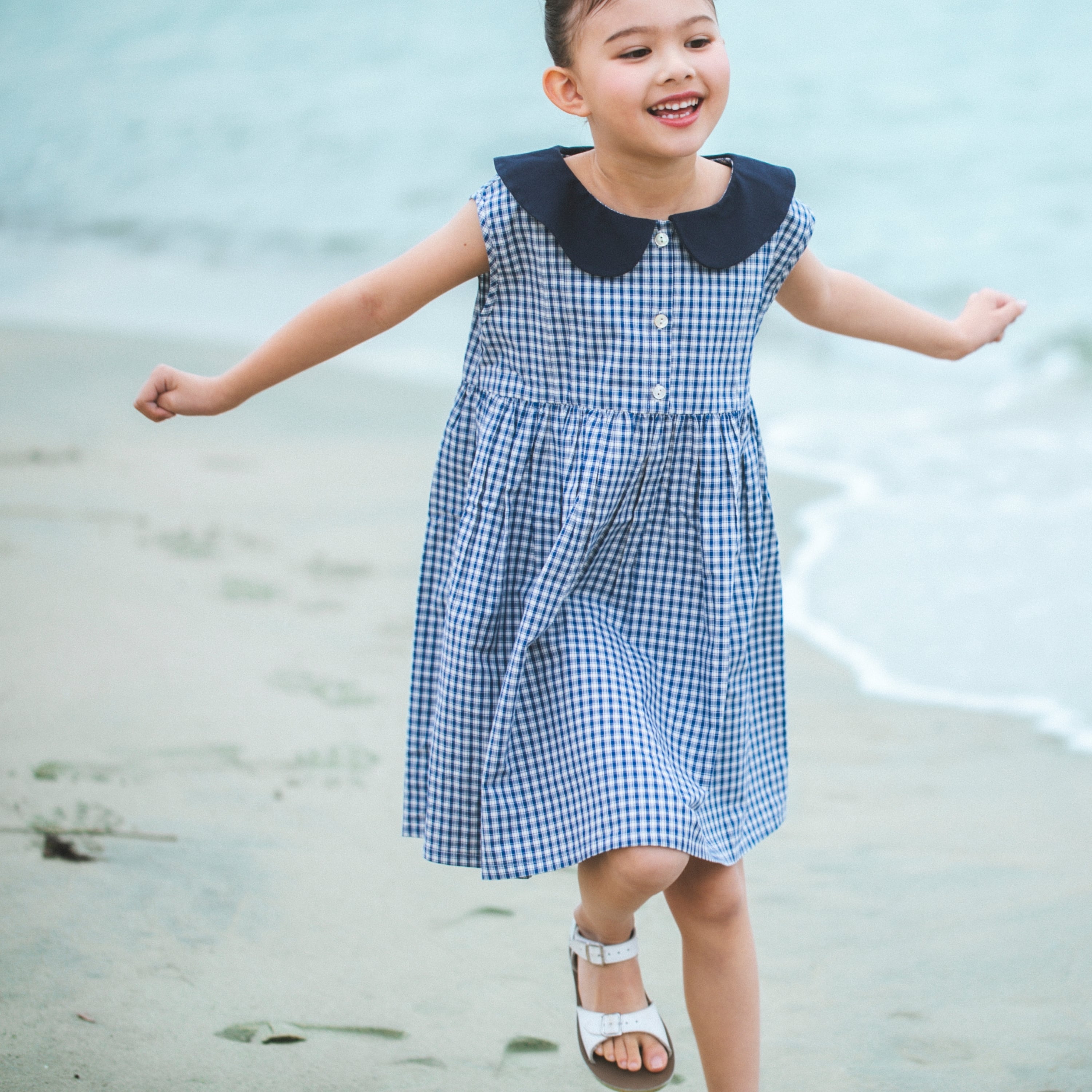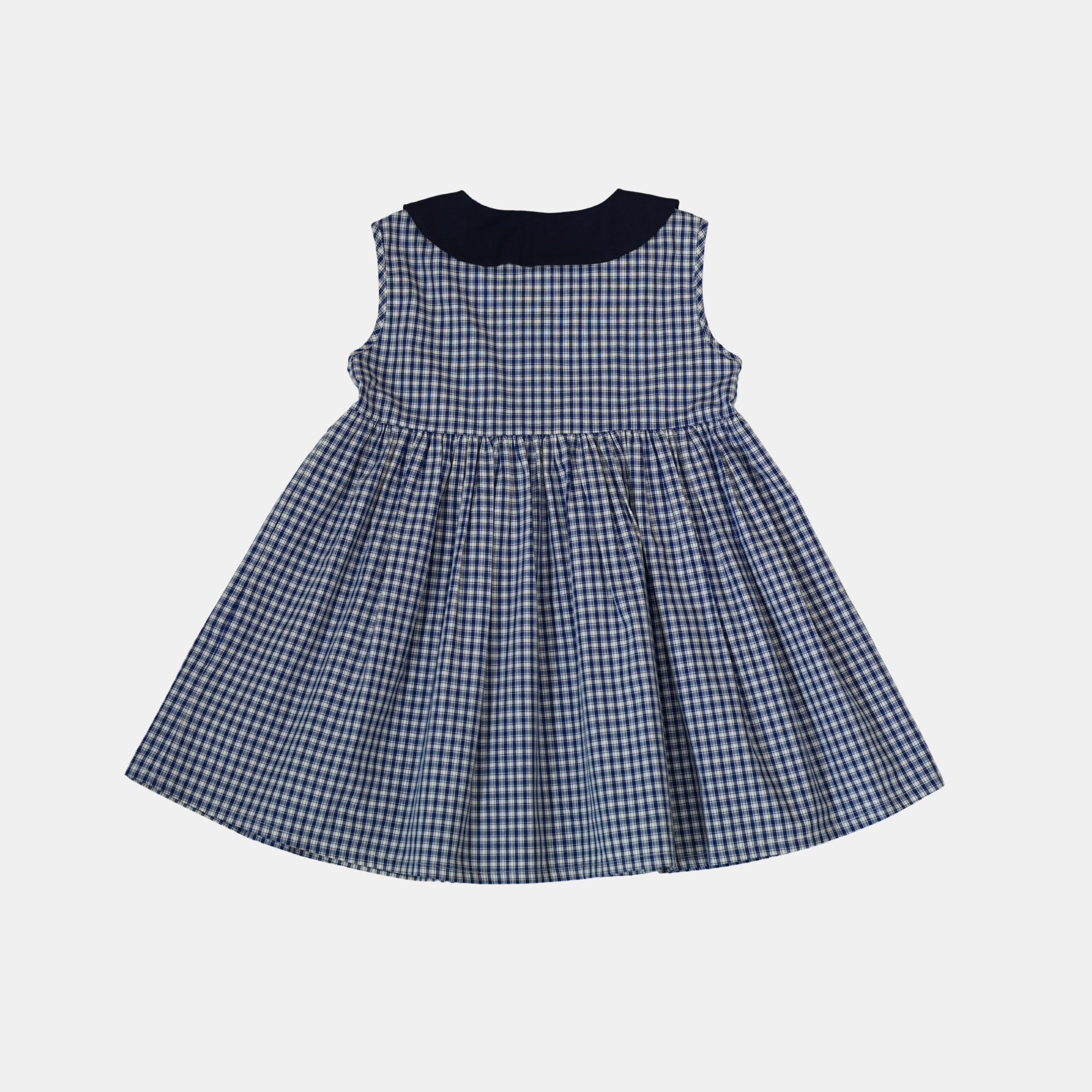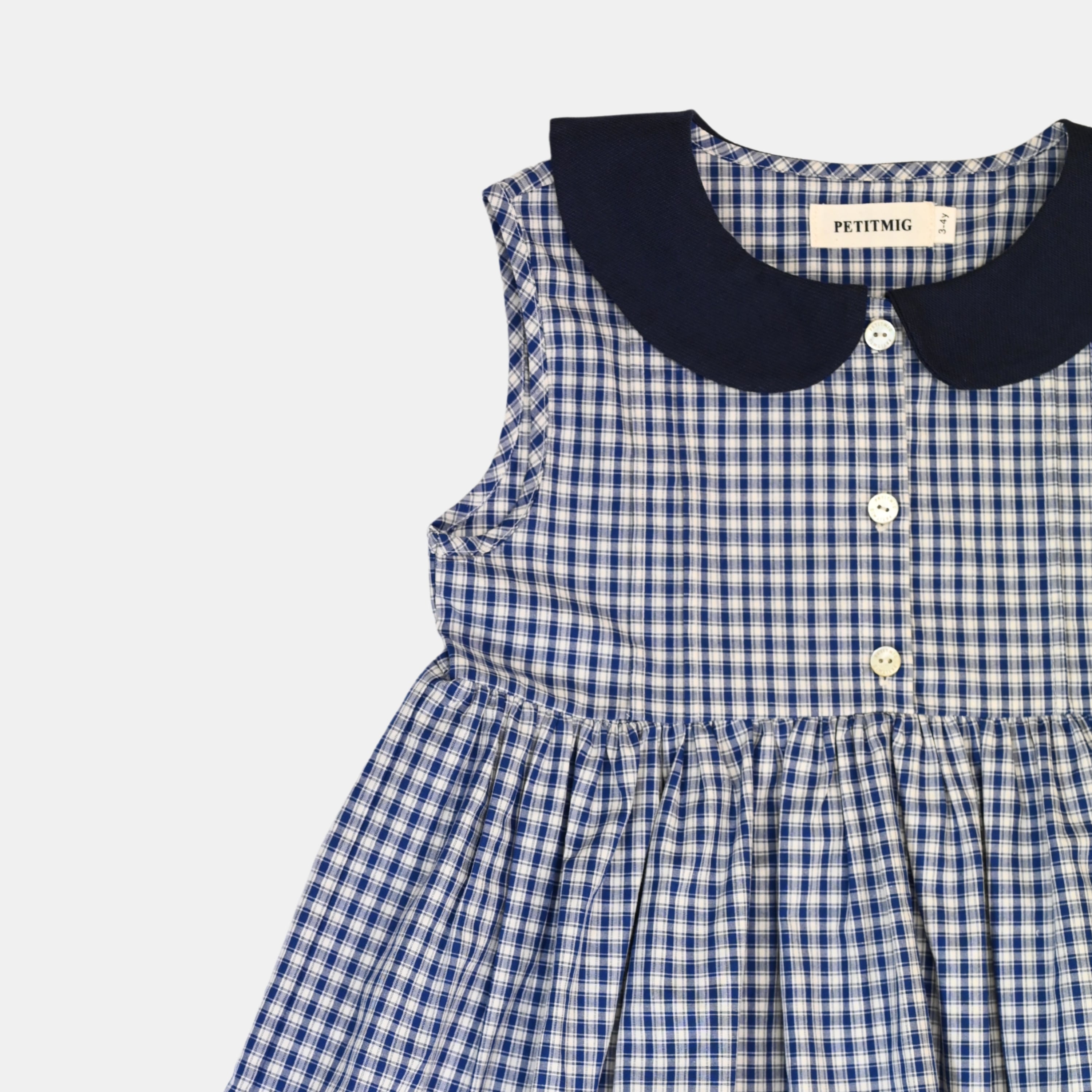 ネイビーブルーのチェックが可愛らしいノースリーブのワンピース。