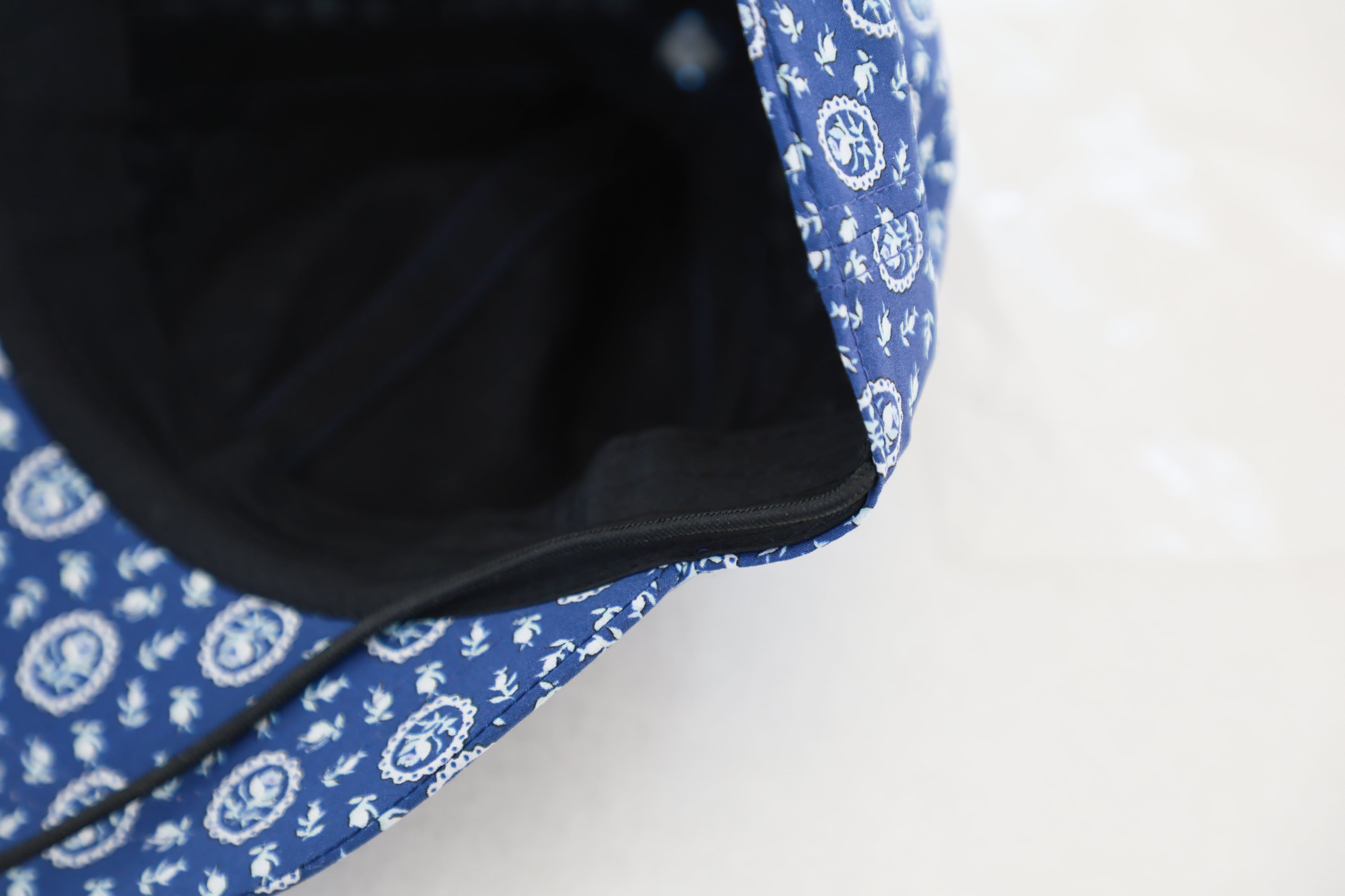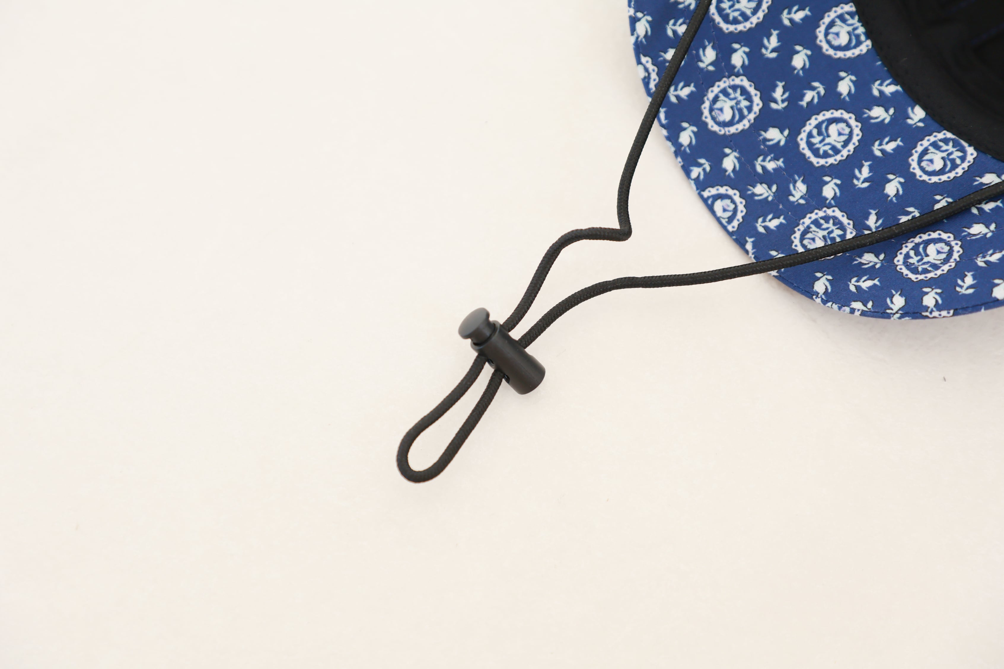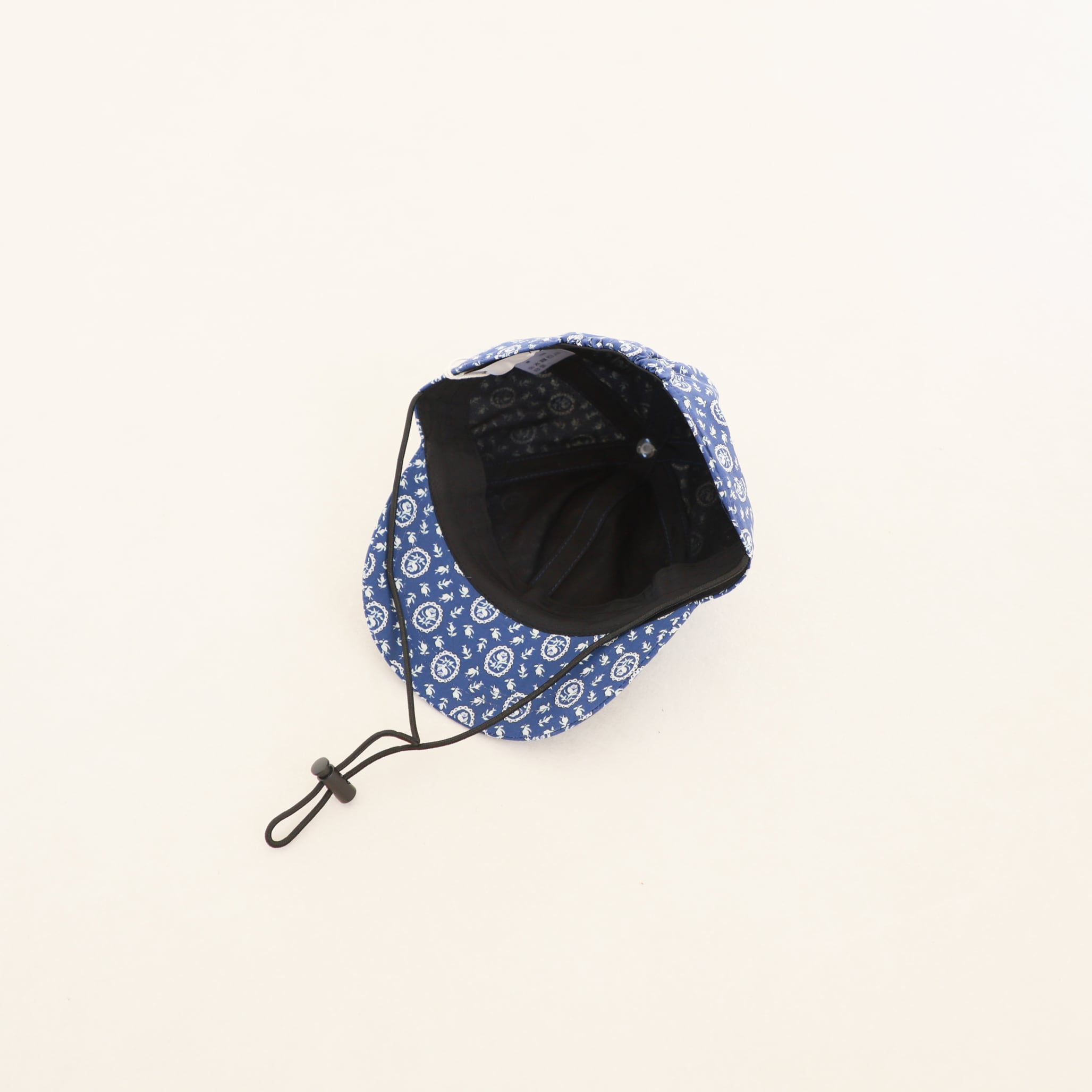 ブルーが新鮮な花柄プリントシリーズより顎紐付きのキャップ。