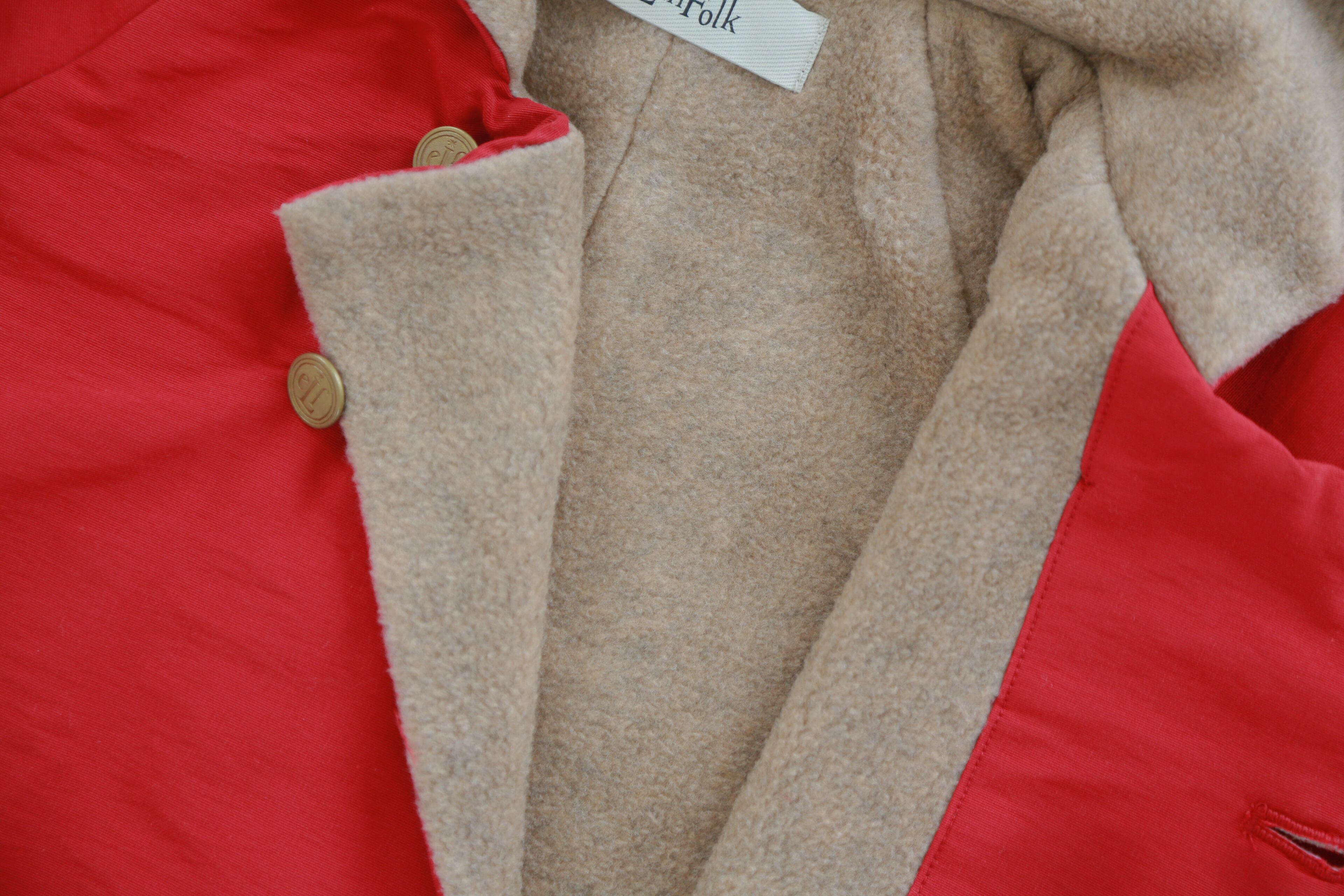 裏地は滑らかな肌触りのレーヨン混の上質なメルトンフリースで、とても軽くて暖かなコートです。袖を捲って裏地のフリースを見せてもかわいいです。