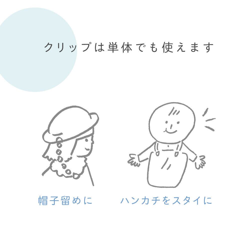 タオルやハンカチを留めてスタイにしたり、帽子などの落下防止やおしゃぶりホルダーなど、様々な用途で使えます。