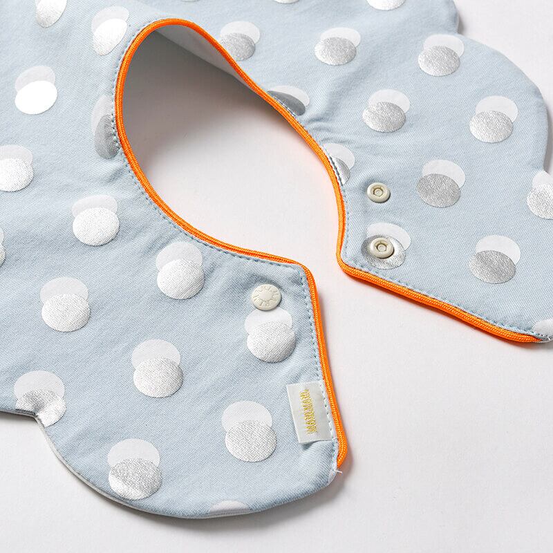 360°よだれをキャッチするまあるいデザインと、遊び心を感じる首周りのネオンオレンジのパイピングが着こなしのアクセントになります。