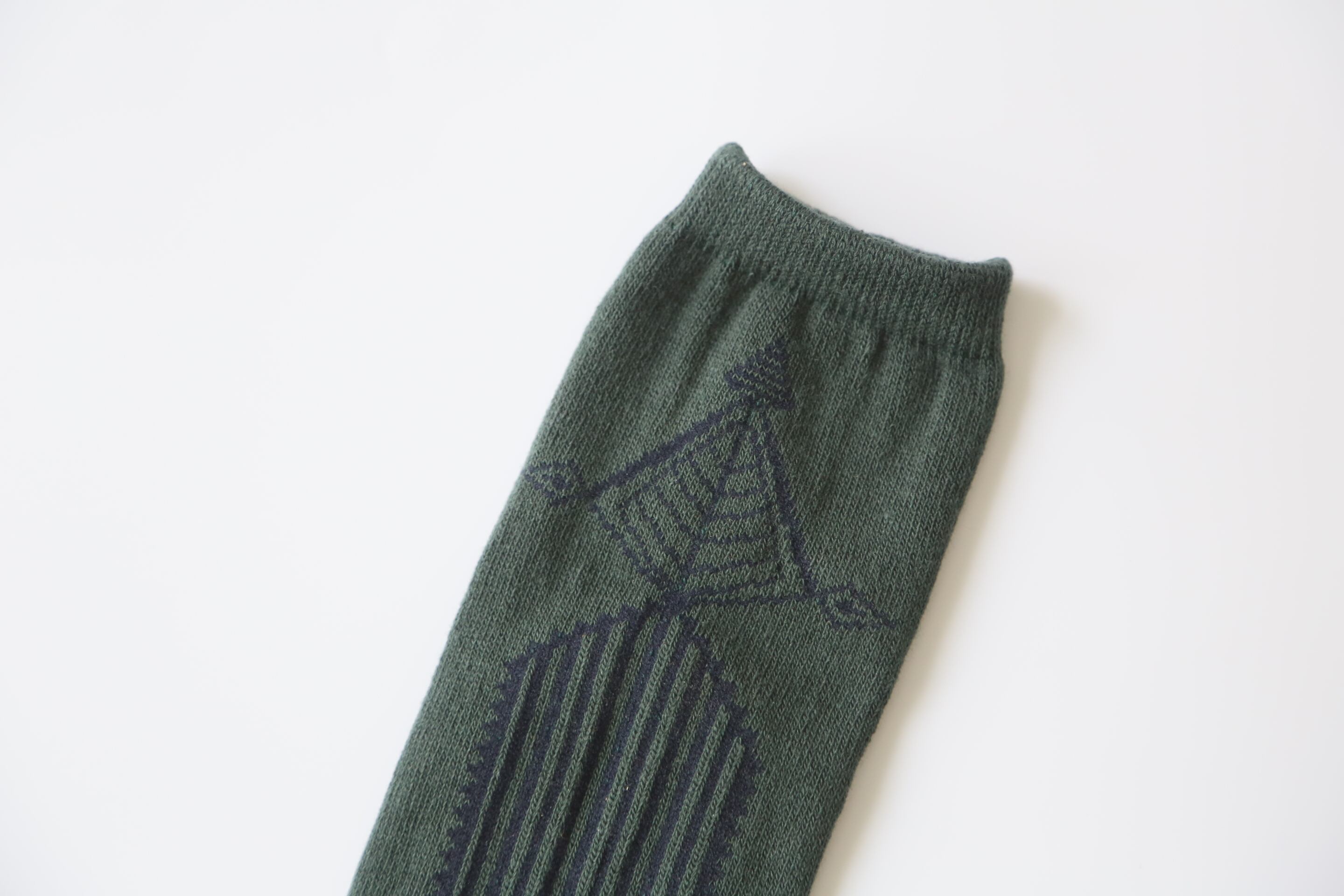 針葉樹林のもみの木をイメージして描いた抽象柄を編みこんだソックス。