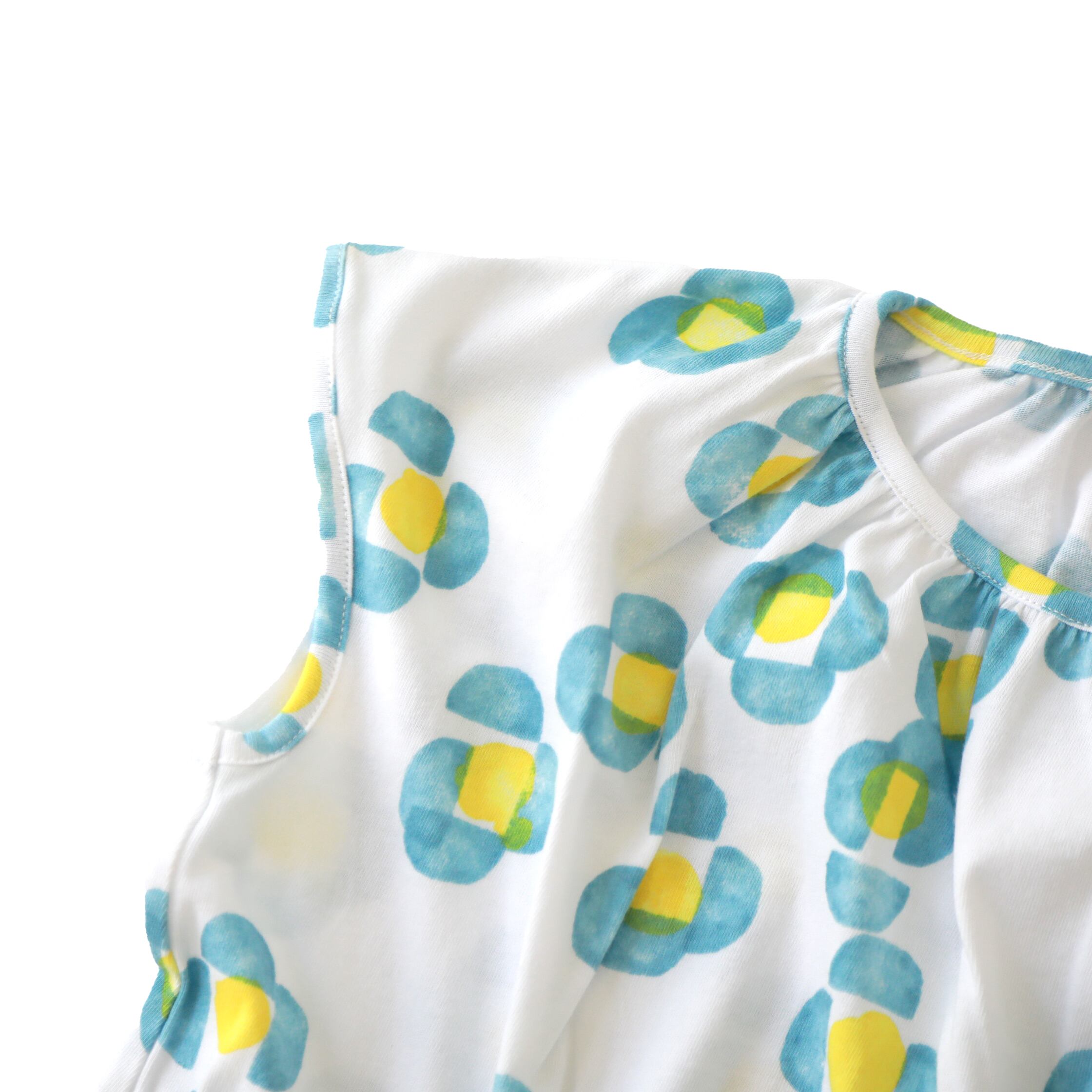 襟元のギャザーが愛らしく、裾までゆるやかに広がるシルエットが涼やかに映ります。