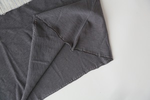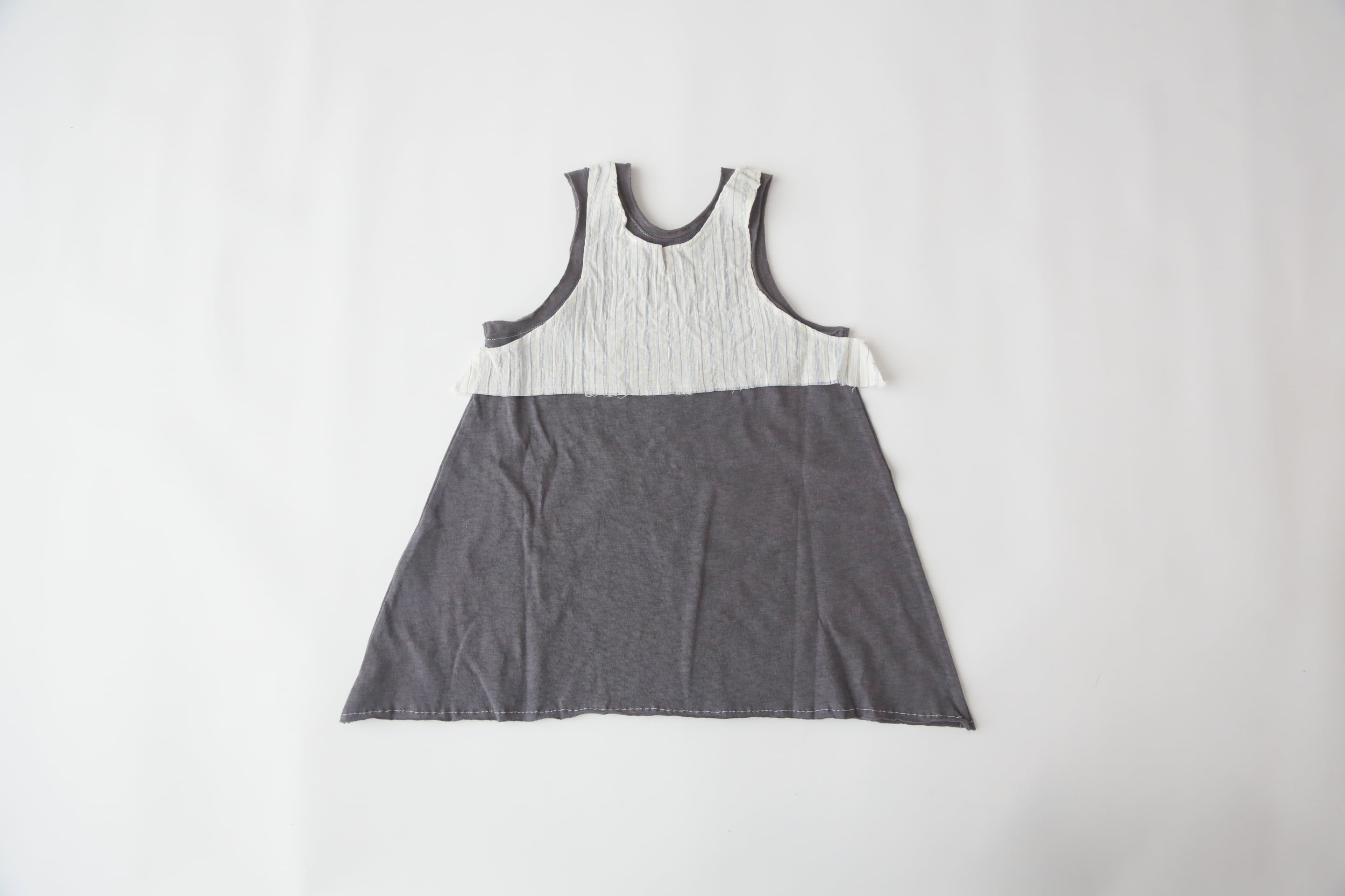 古着のようなラフコット天竺に、ショート丈の切りっぱなしのストライプタンクトップをレイヤードした一着。旅路で風化していくようなイメージを表現しています。