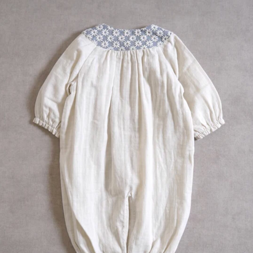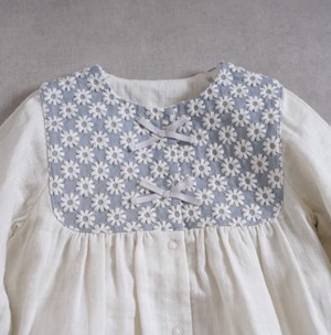 首元のヨーク部分にはお花の刺繍を散りばめたテキスタイルを使用し