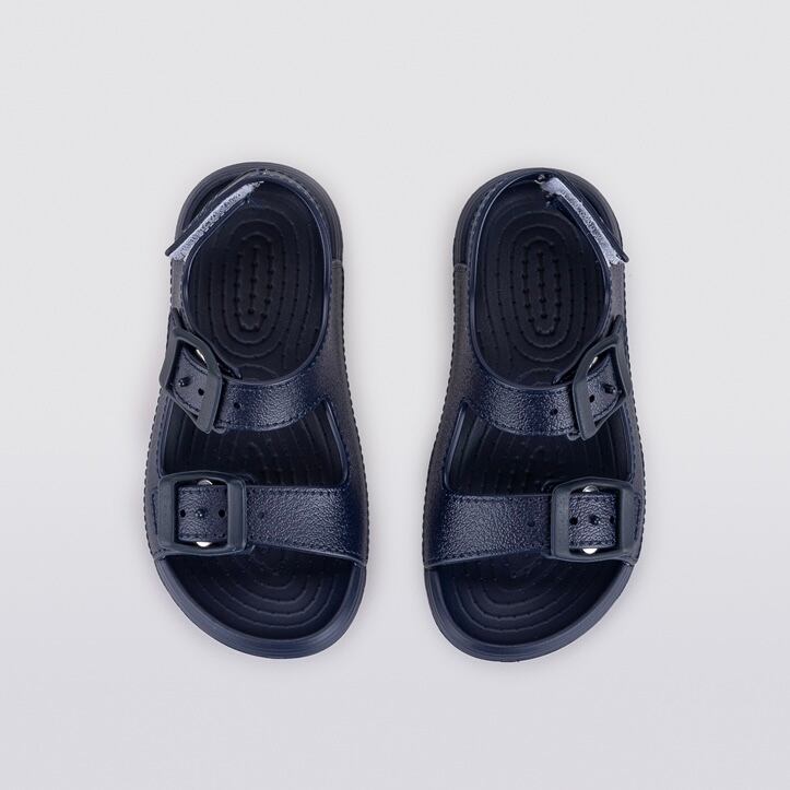 カカト部分のストラップはベルクロで開閉できるので脱ぎ履きしやすく、 サンダルを履きなれない小さなお子様にも安心。