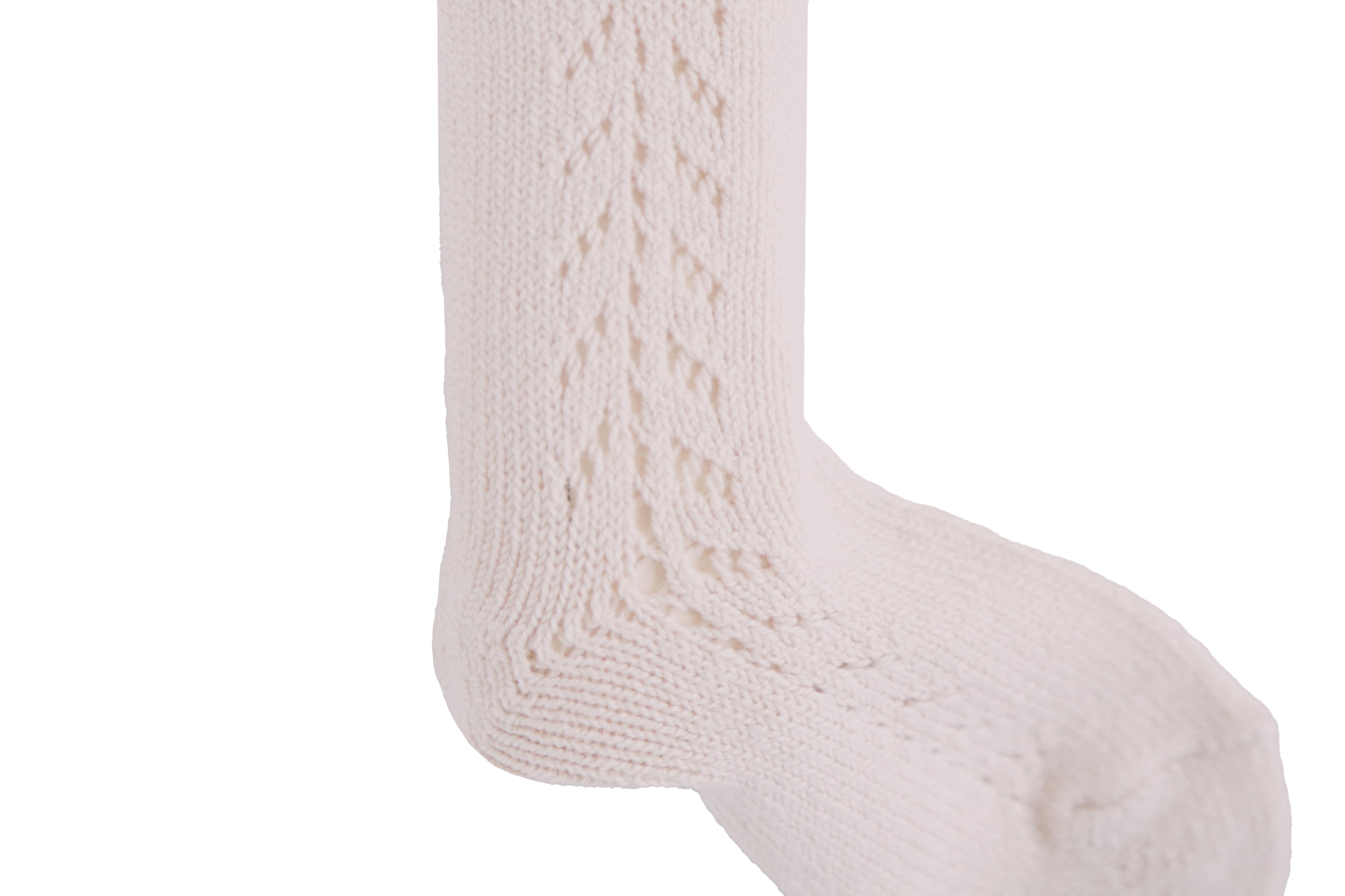 両サイドに2本ライン状の透かし編み模様が入ったニーハイ丈の靴下です。