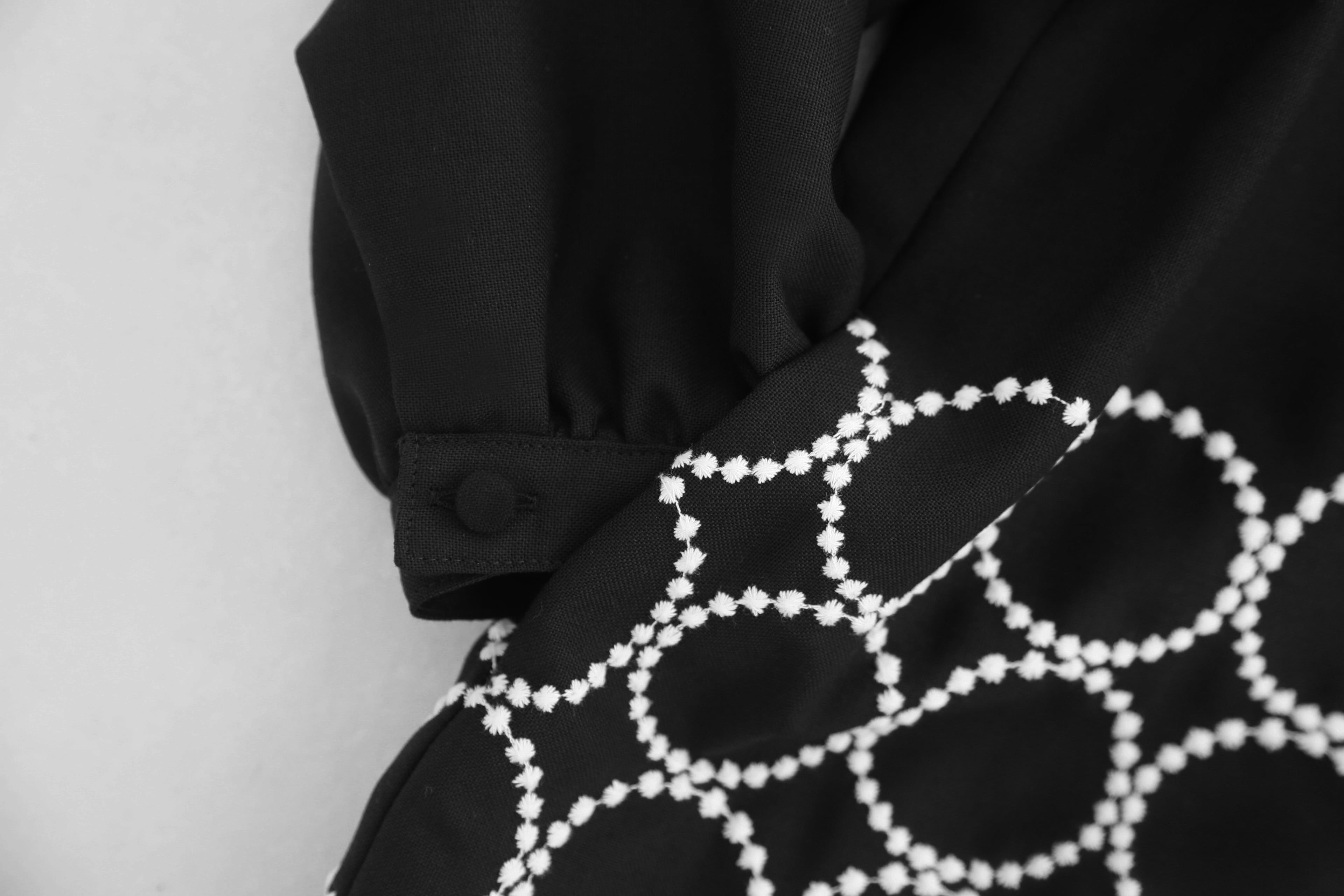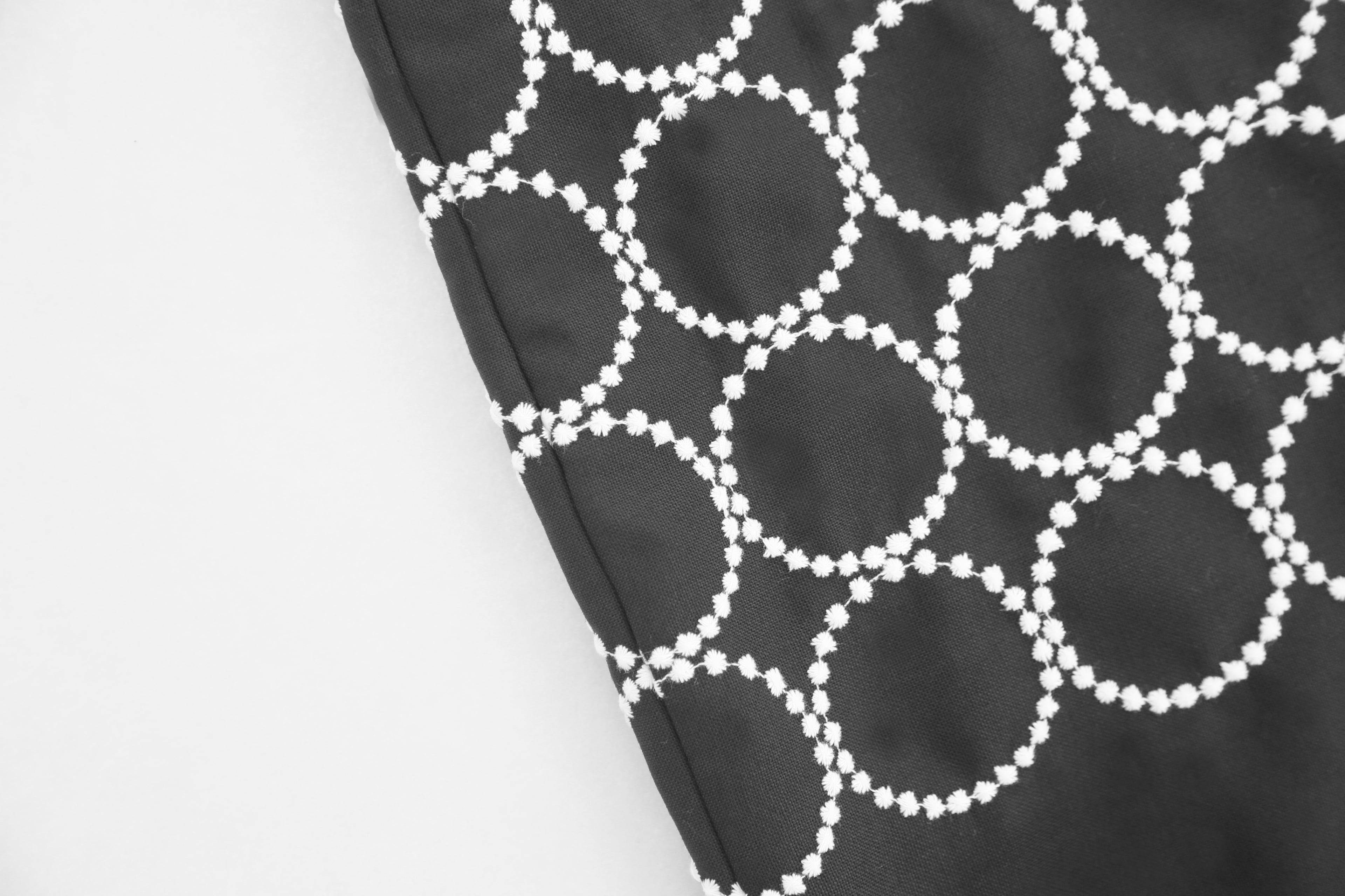 人の手の跡を消さないように刺繍を重ねた“tambourine”と、生地の上を蝶がおおらかに舞う“choucho”の刺繍を組み合わせたデザイン。