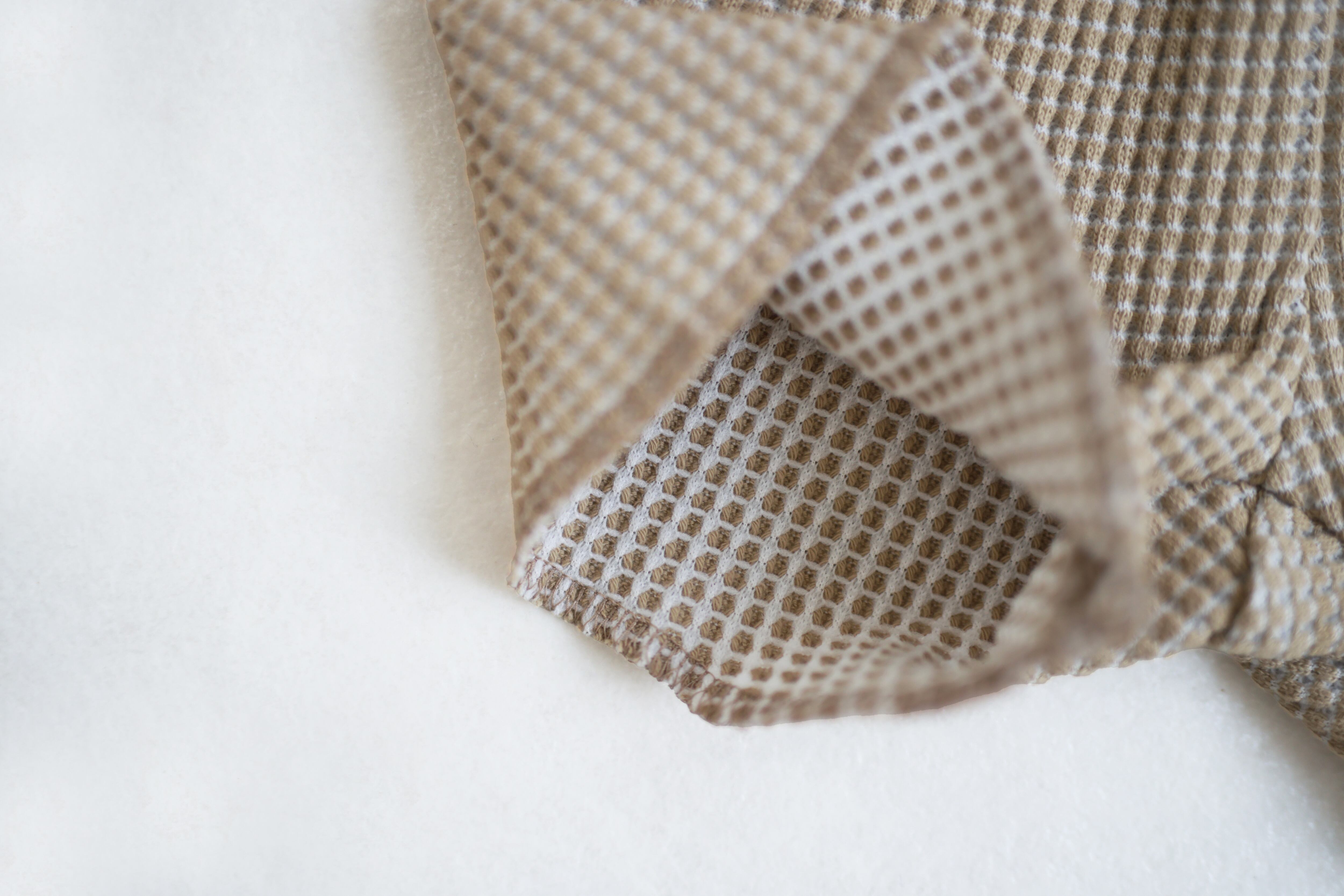 バイカラー(2配色)で作った、細かいチェック柄の様に見える新鮮な印象のオリジナルのワッフル素材を使用。
